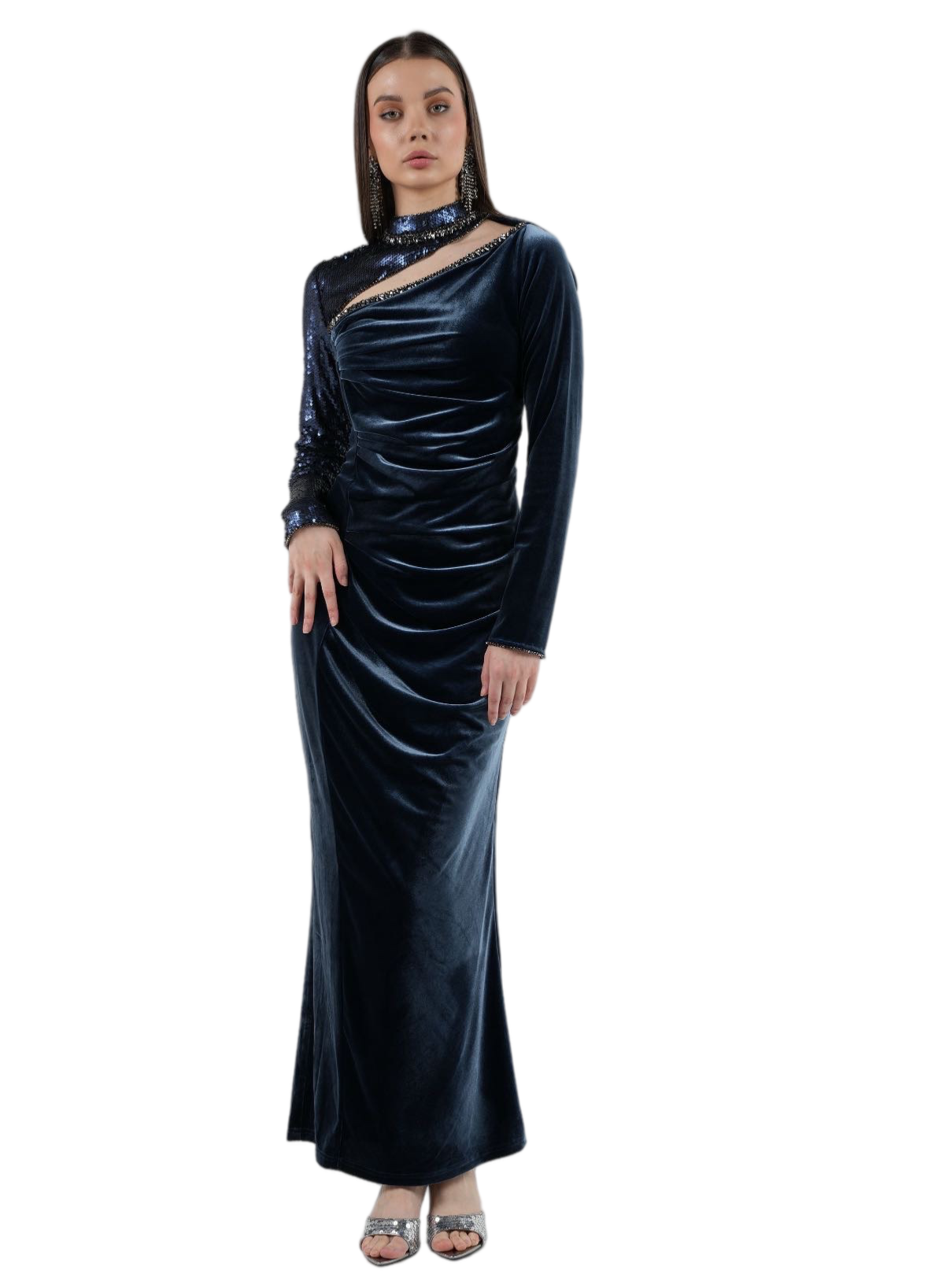 This asymmetrical velvet gown with sequined detailing is your go-to choice for a statement-making evening look.