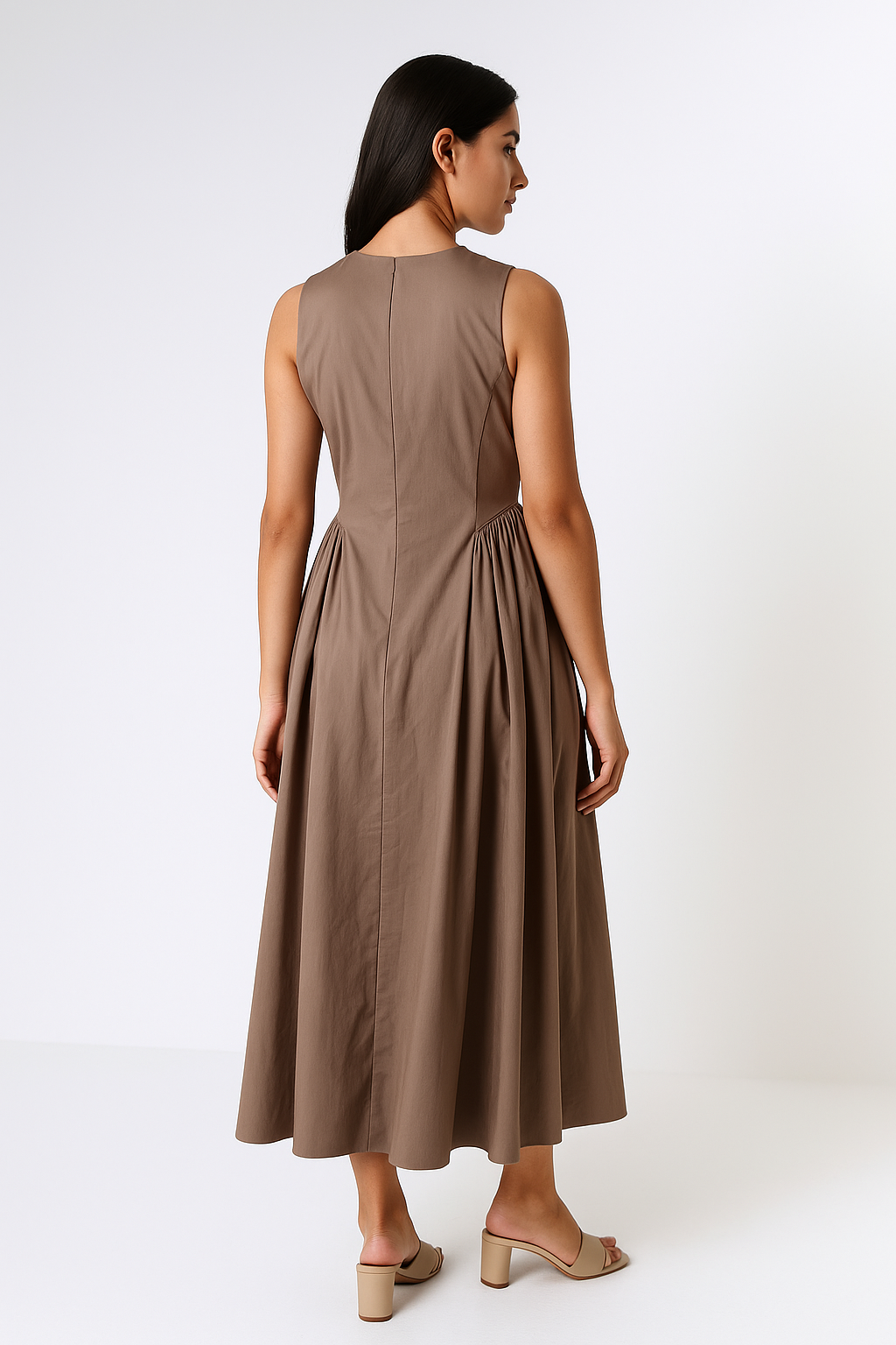 This midi dress is designed with effortless elegance in mind, combining a classic sleeveless cut with a modern keyhole neckline for subtle sophistication. The gathered side panels add a touch of volume while maintaining a flattering shape, ensuring comfort without compromising on style. Its versatile length and flowy silhouette make it a perfect choice for both casual day outings and elevated evening occasions.