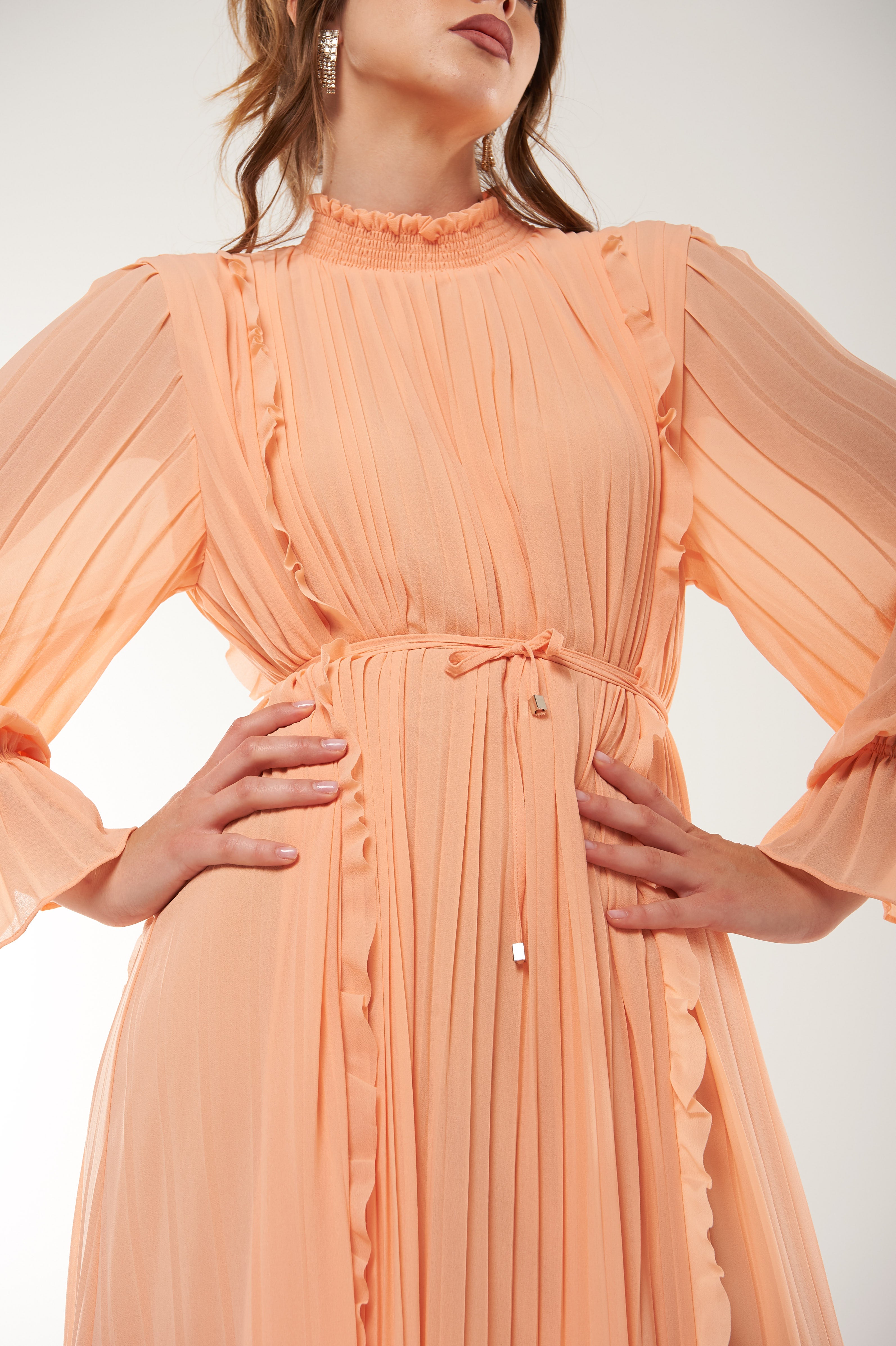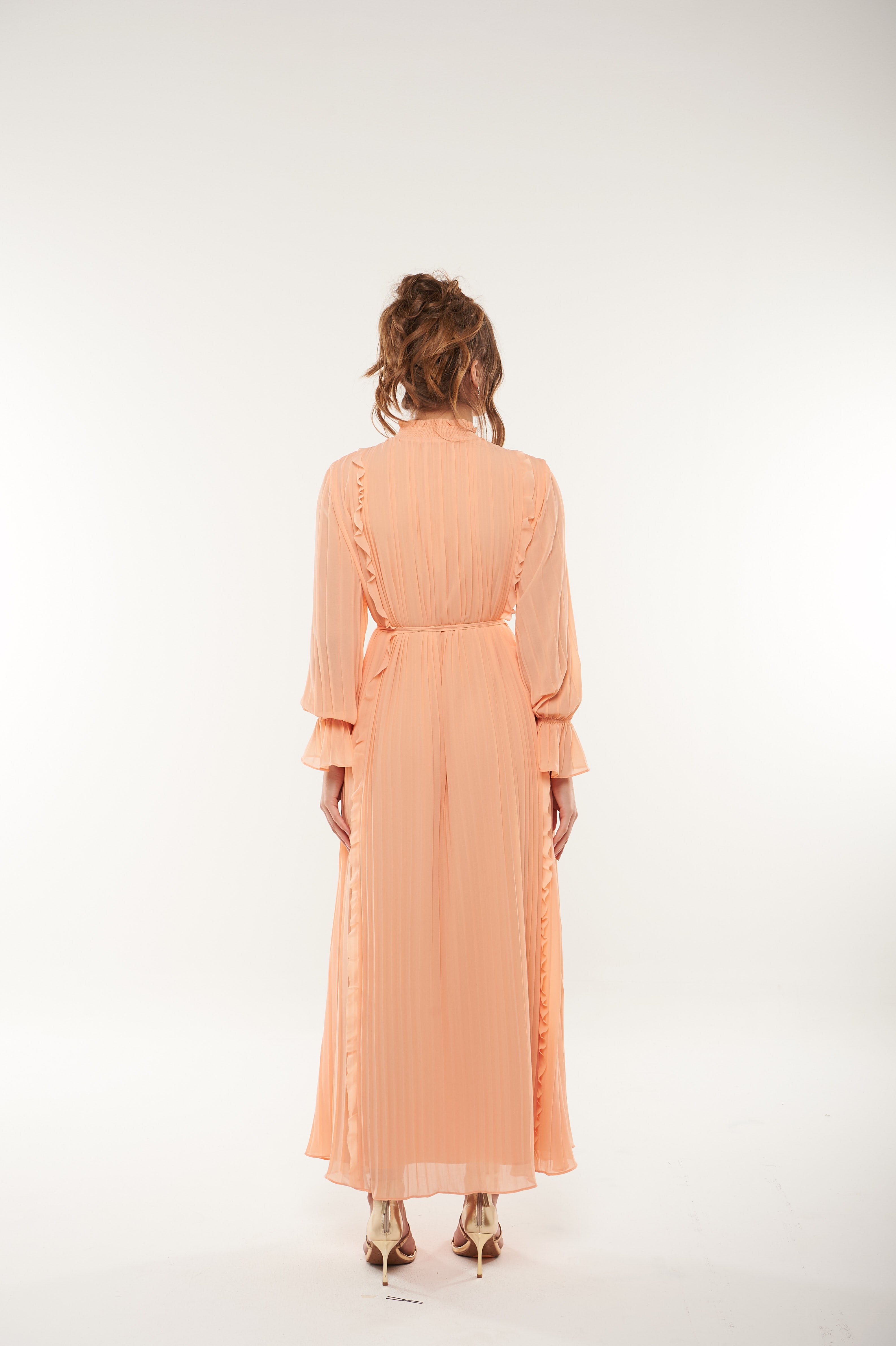 Perfect for the Spring season, this pleated maxi dress combines elegance and comfort in a flowing silhouette. Designed with delicate ruffle trims along the front and sleeves, it features a high neckline and a matching waist tie to define your shape. The lightweight fabric ensures graceful movement, making it ideal for daytime events or evening gatherings.