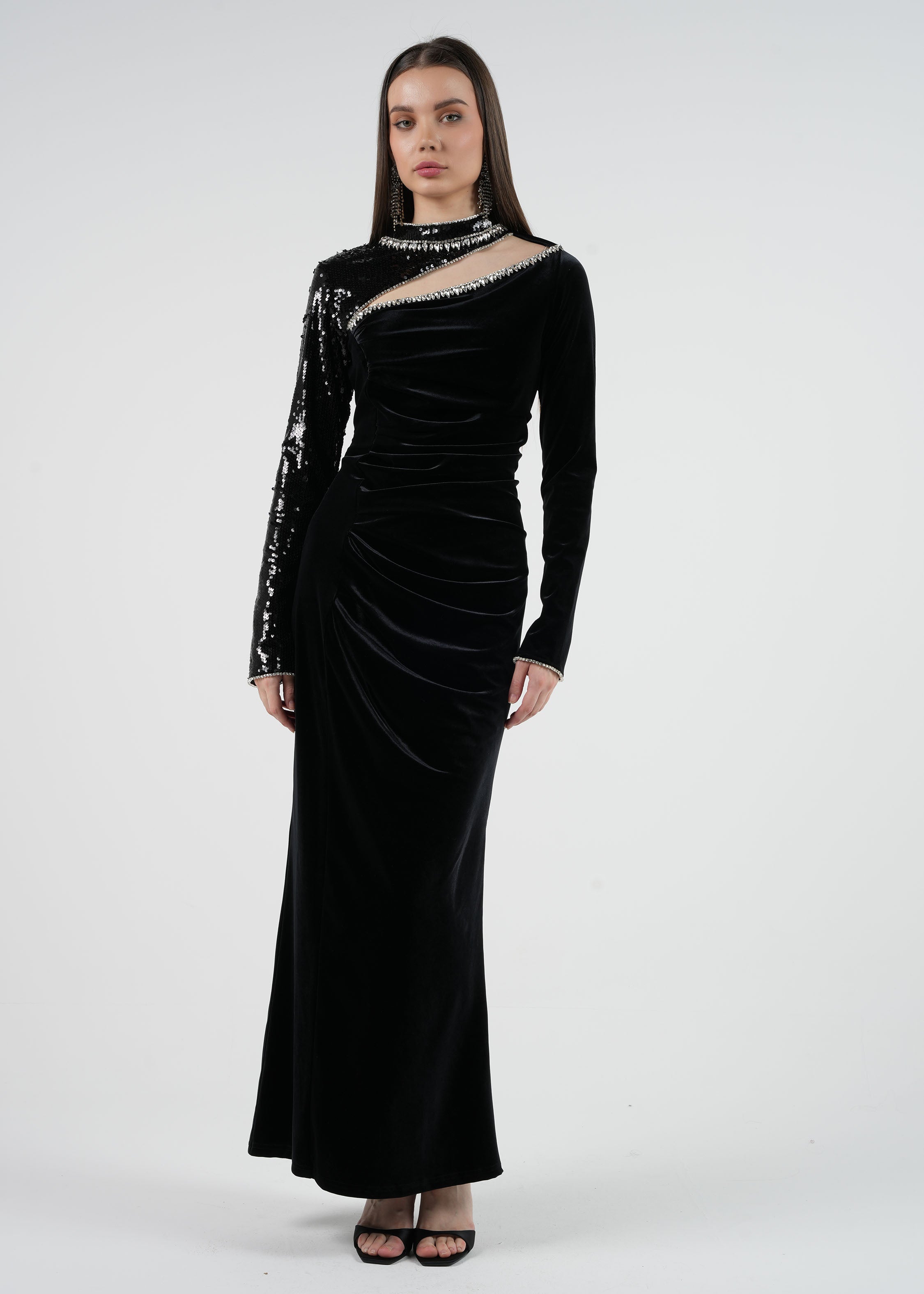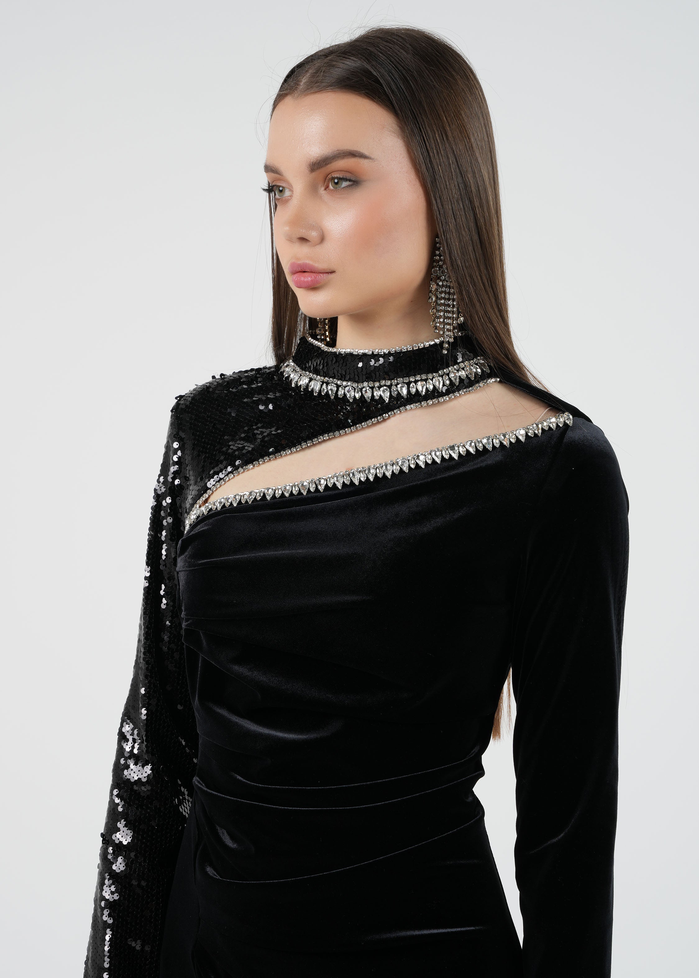 This asymmetrical velvet gown with sequined detailing is your go-to choice for a statement-making evening look.
