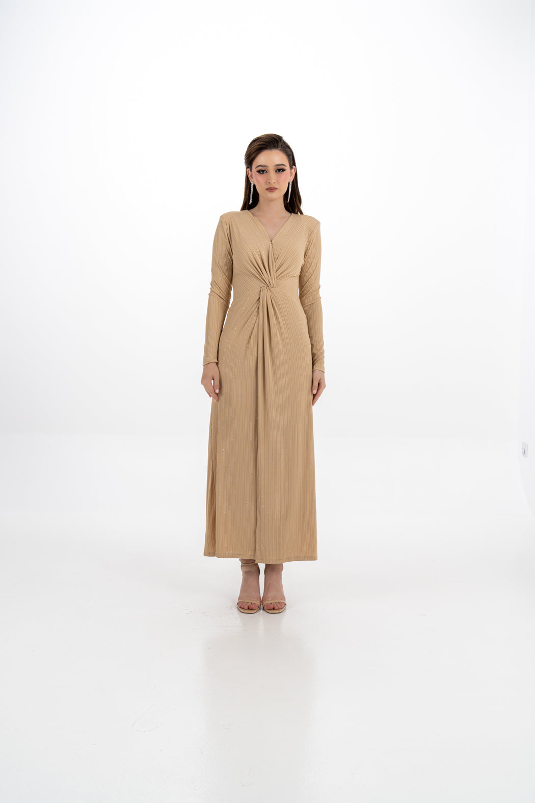 A refined choice for evening wear, this elegant maxi dress is crafted from a soft stretch fabric and adorned with subtle lead dot embellishments that offer a touch of shimmer without being overpowering. The design features a flattering front knot detail at the waist that enhances the silhouette with a gentle drape. Its clean, minimalist cut is elevated by a V-neckline and long sleeves, making it a timeless piece for formal occasions.