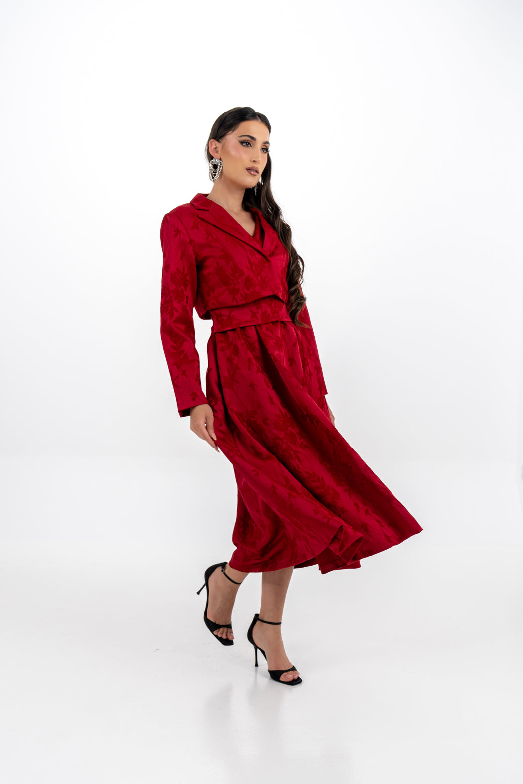 Effortlessly elegant, this sleeveless midi dress is crafted from premium brocade fabric with a delicate floral jacquard pattern. Designed with a flattering wrap-style bodice and wide structured waistband, it creates a refined silhouette that is both feminine and timeless. The A-line skirt flows gracefully to a mid-calf length, offering ease of movement and graceful charm.