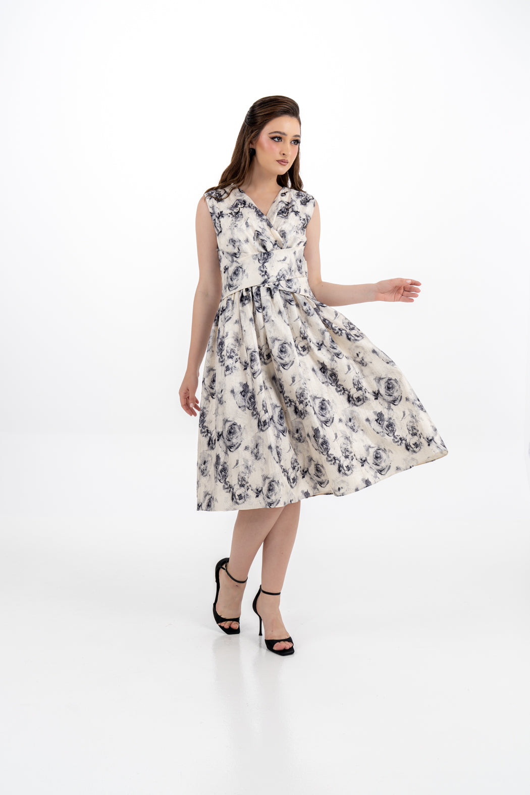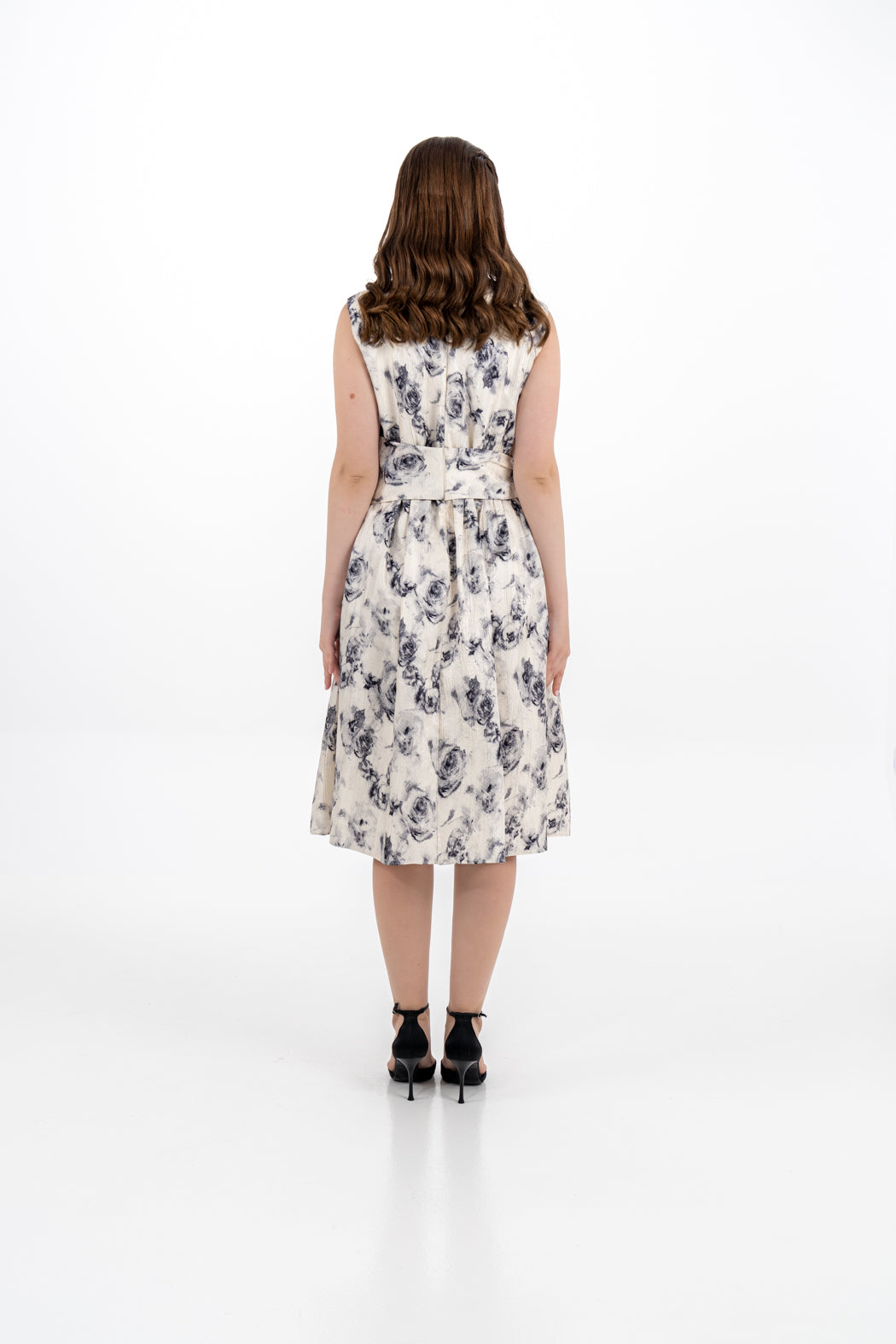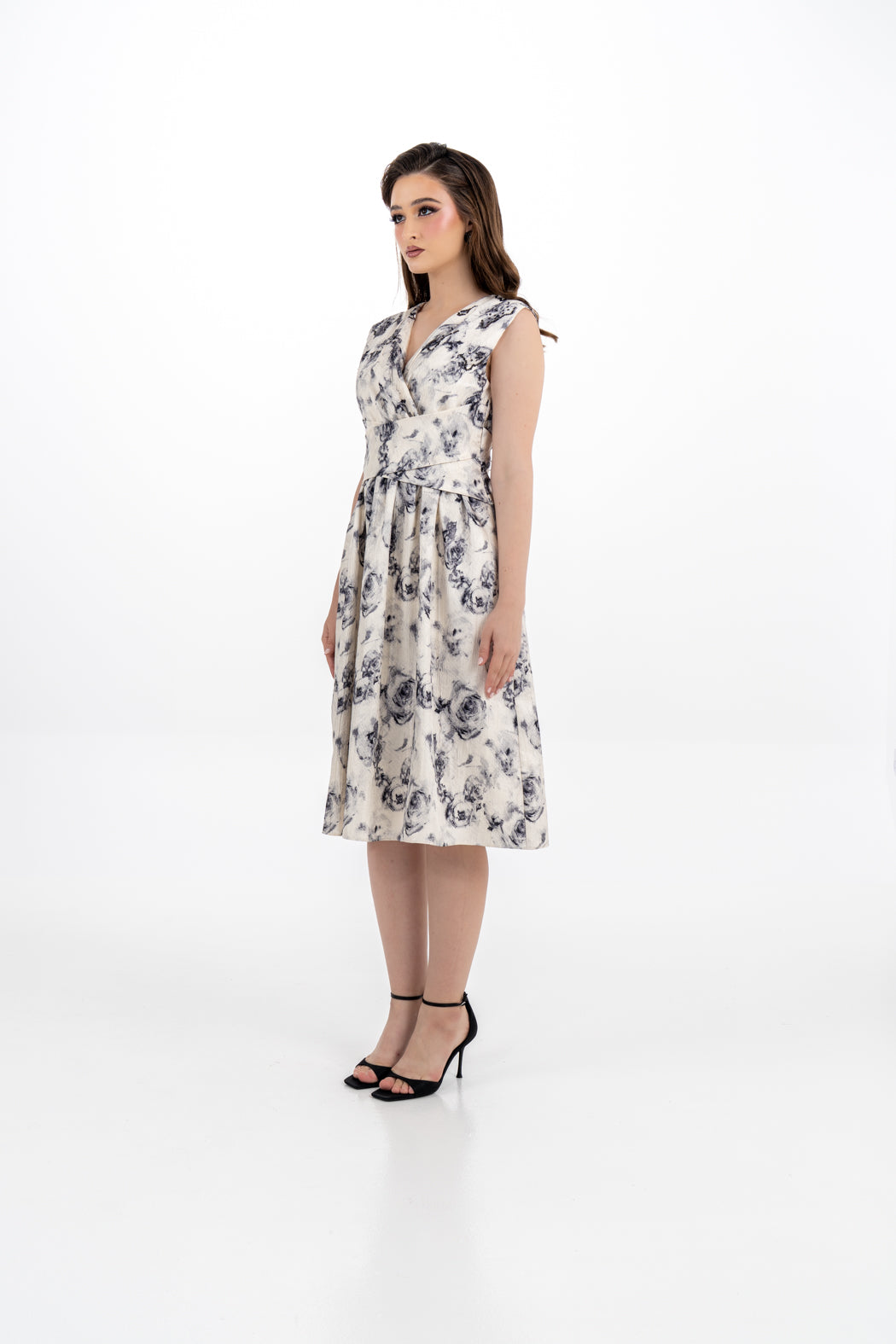 Step into timeless elegance with this sleeveless midi dress featuring a softly structured silhouette and an all-over floral print. The crossover V-neck bodice is complemented by a wide waistband that defines the figure, while the pleated skirt adds graceful volume and movement. Perfect for garden parties, brunches, or daytime events.