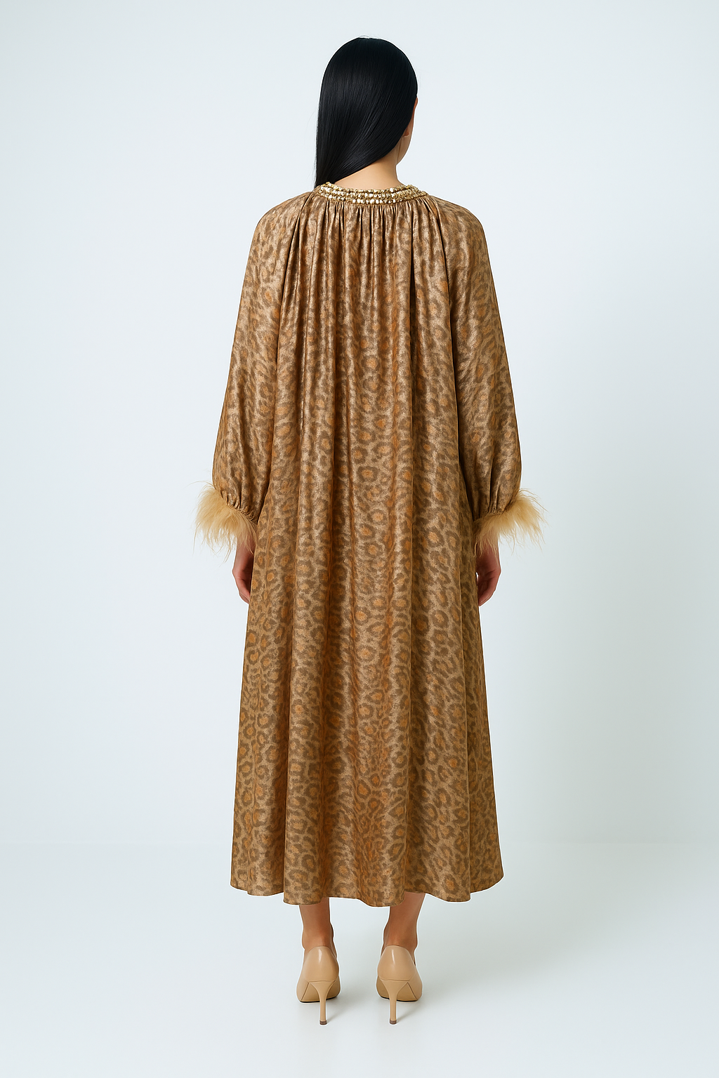 Step into timeless elegance with this animal print maxi dress, designed for women who love bold yet refined style. Crafted with a luxurious flowy silhouette, this dress features an embellished round neckline with intricate beadwork, adding a touch of sparkle and sophistication. The long sleeves are finished with feather-trimmed cuffs for a glamorous statement. An asymmetrical hemline enhances the fluid movement of the dress, making it a standout choice for evening occasions and festive gatherings.