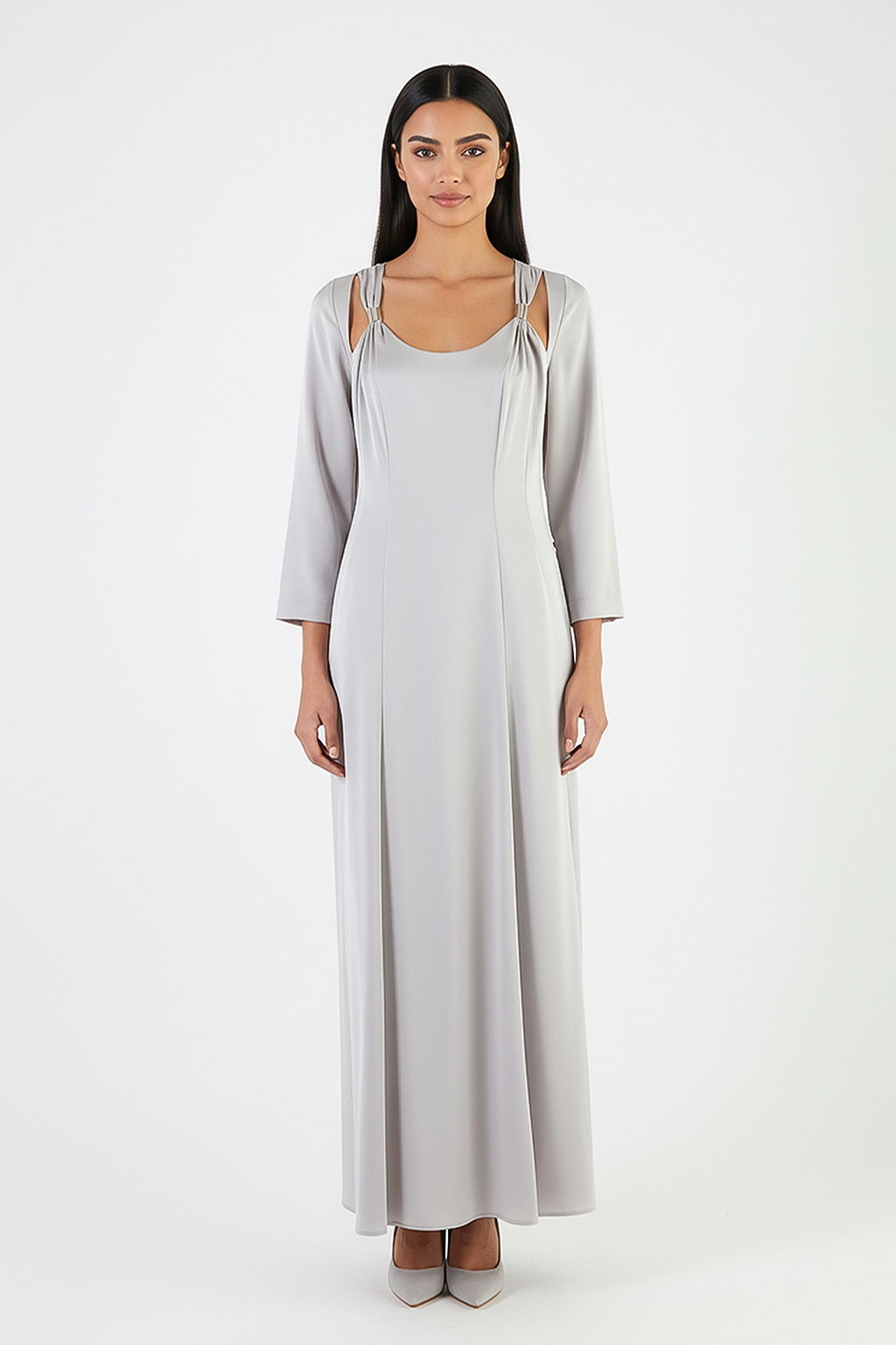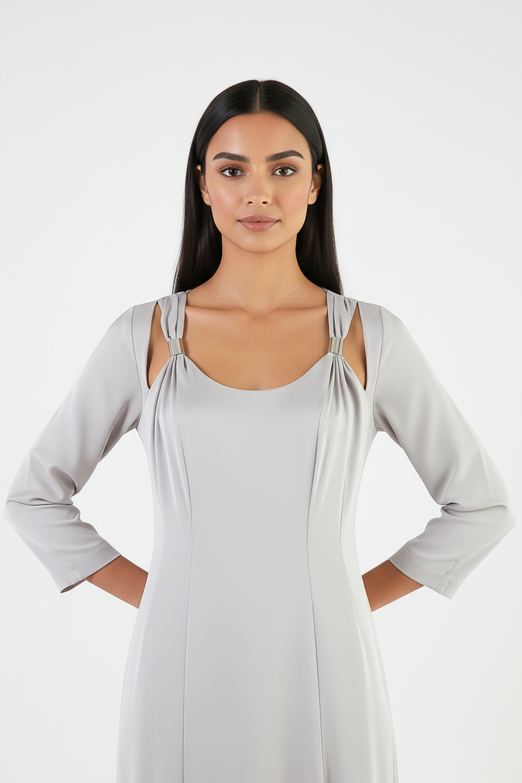 This design features double shoulder straps enhanced with gold metal hardware, adding a luxurious and modern touch. Gentle gathers at the shoulders complement the rounded neckline, giving structure and a feminine finish. The 3/4 sleeves offer modest coverage while maintaining a sleek, contemporary look.