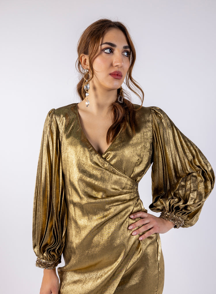 Step into elegance with this stunning gold evening dress that perfectly combines luxury and femininity. Featuring a flattering wrap design at the waist that accentuates your figure, while the voluminous puff sleeves add a dramatic and sophisticated touch. The shimmering fabric gives a radiant glow, making this dress an ideal choice for formal events and special occasions. The intricately embellished sleeve cuffs provide an extra touch of glamour and refinement.
