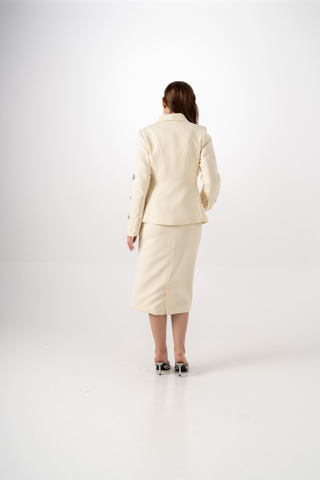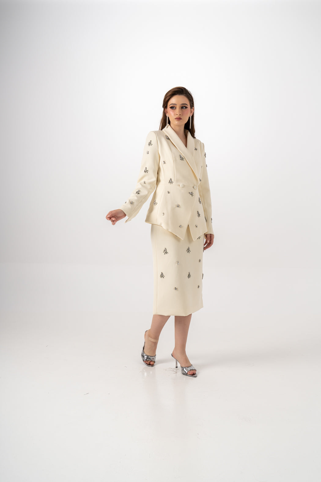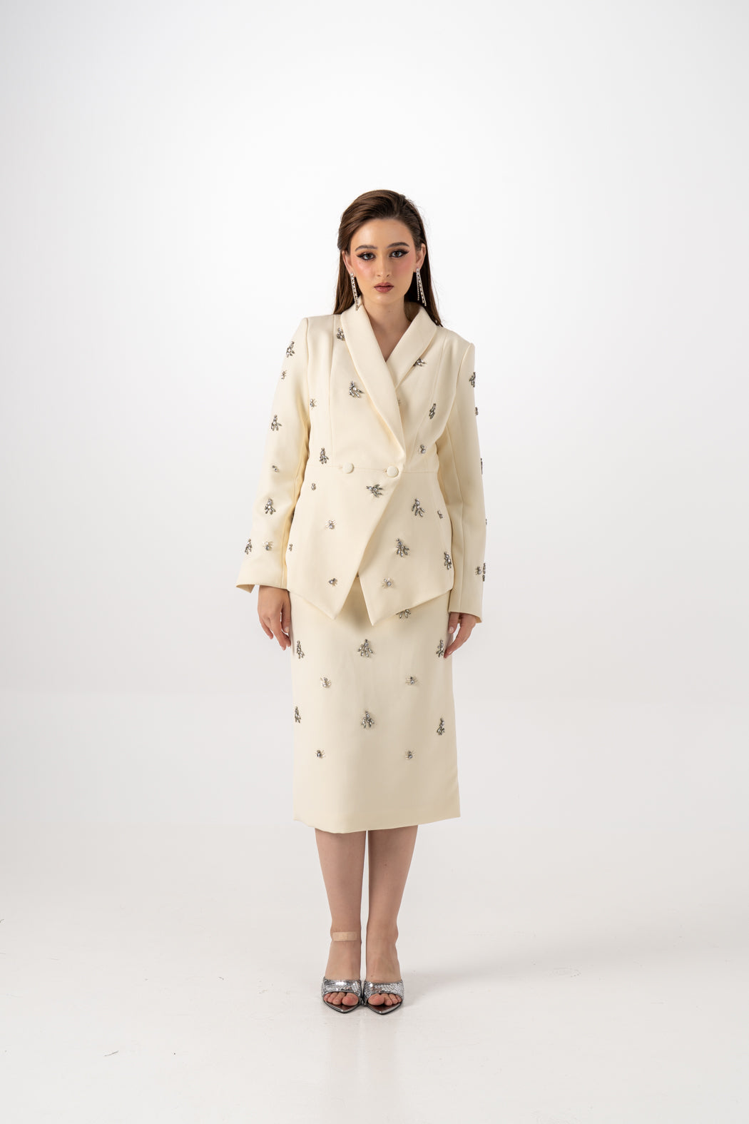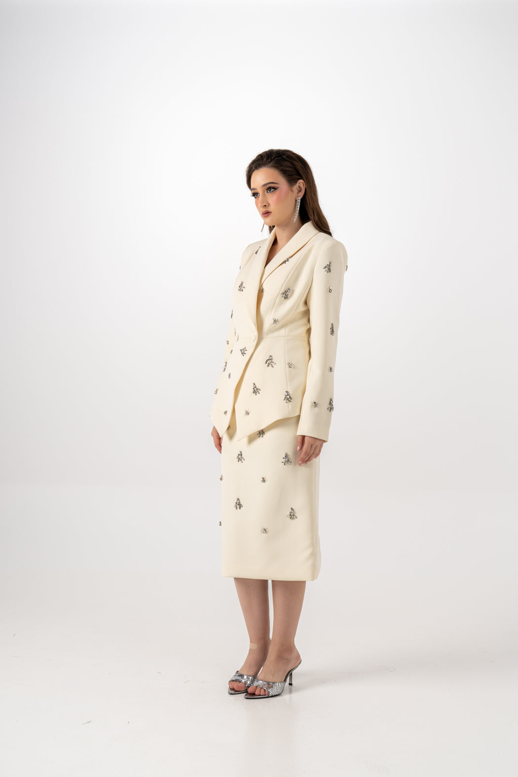Step into refined elegance with this impeccably tailored blazer, a statement piece adorned with hand-applied crystal embellishments that shimmer subtly with every movement. Each embellishment is carefully arranged in clustered floral motifs, adding texture and dimension to the clean silhouette. The embellishments feature varying sizes of rhinestones and beading, giving the piece a luxurious, couture-like finish.