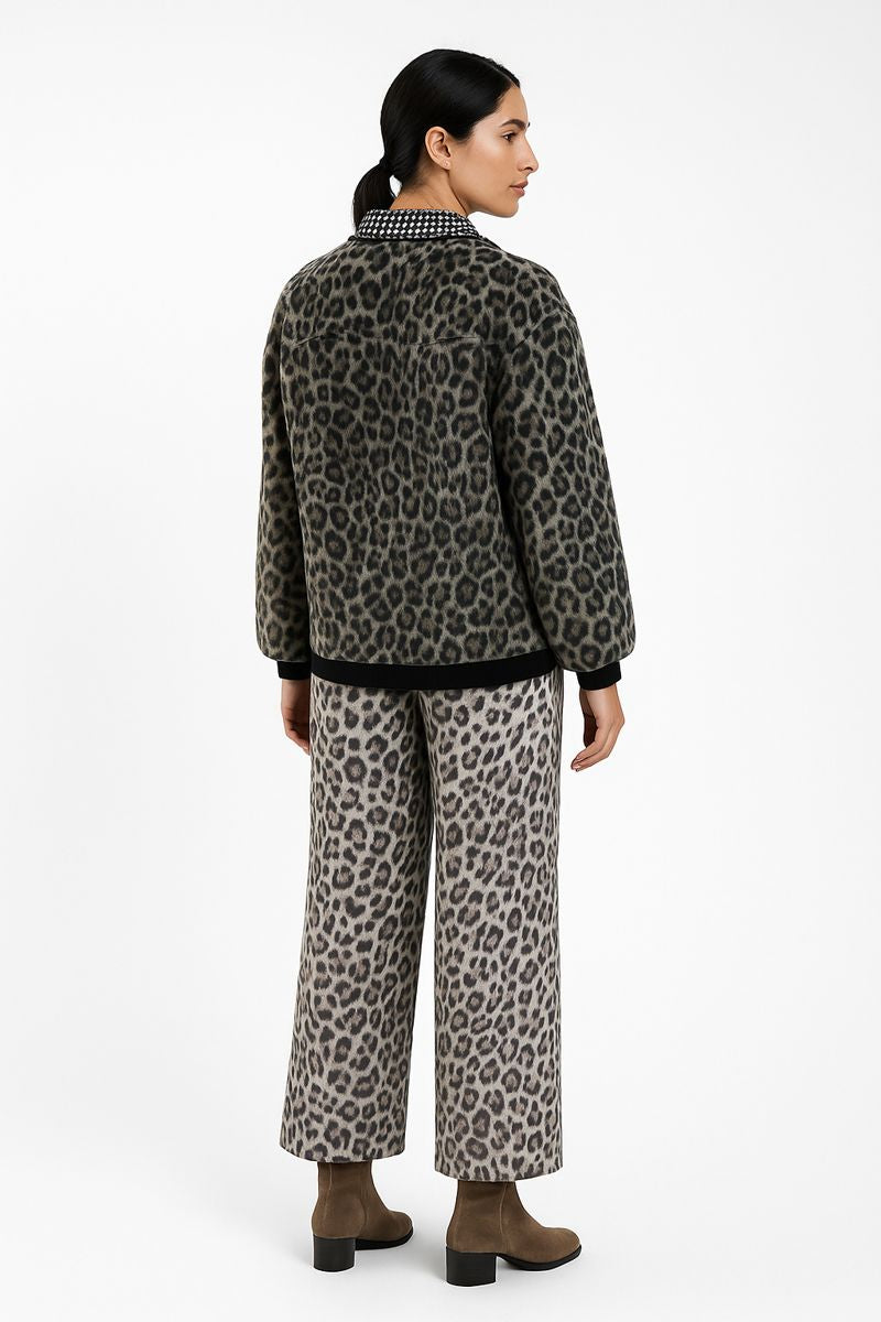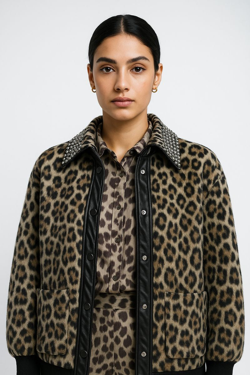 Bold yet refined, the Valeria Leopard Statement Jacket is a modern expression of effortless luxury. Crafted with a rich leopard-patterned outer, this jacket features a relaxed, structured silhouette that balances statement style with everyday wearability. The design is elevated by a distinctive embellished collar, adding a subtle touch of glamour to the otherwise clean and contemporary form.