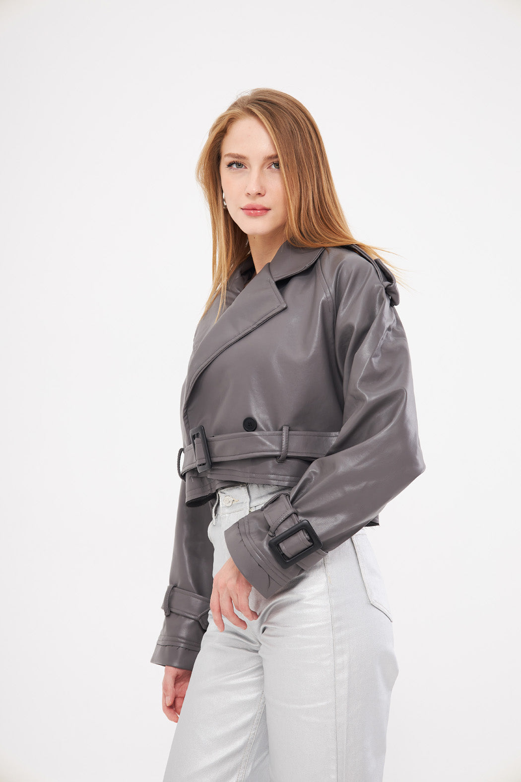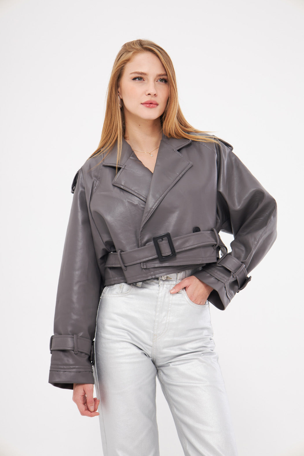 Style: Cropped jacket with a belted waist for a defined shape