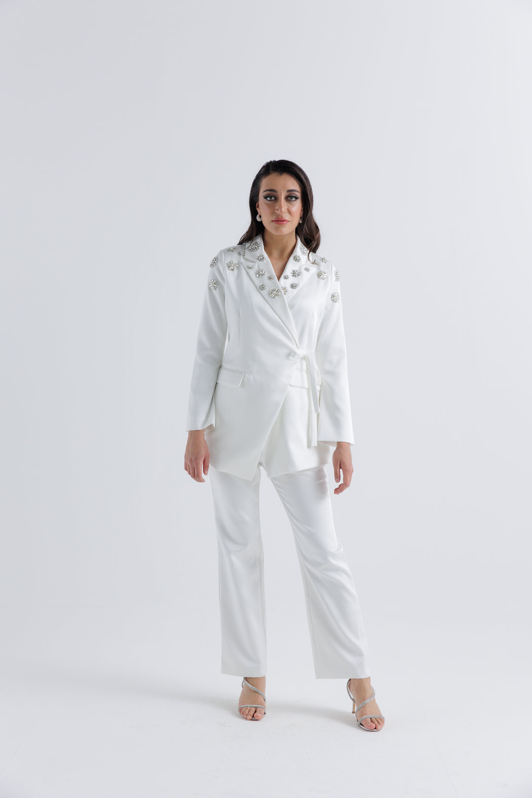 Add a touch of opulence to your formal wardrobe with this statement wrap blazer, adorned with intricately arranged crystal embellishments on the collar and shoulders. Designed in a modern tailored cut with a wrap-around belt closure, this blazer offers both elegance and structure. The smooth woven fabric gives it a polished finish, making it a standout piece for evening occasions, celebrations, or upscale work events. Pair it effortlessly with our Pant (2404330) for a coordinated and elevated look.