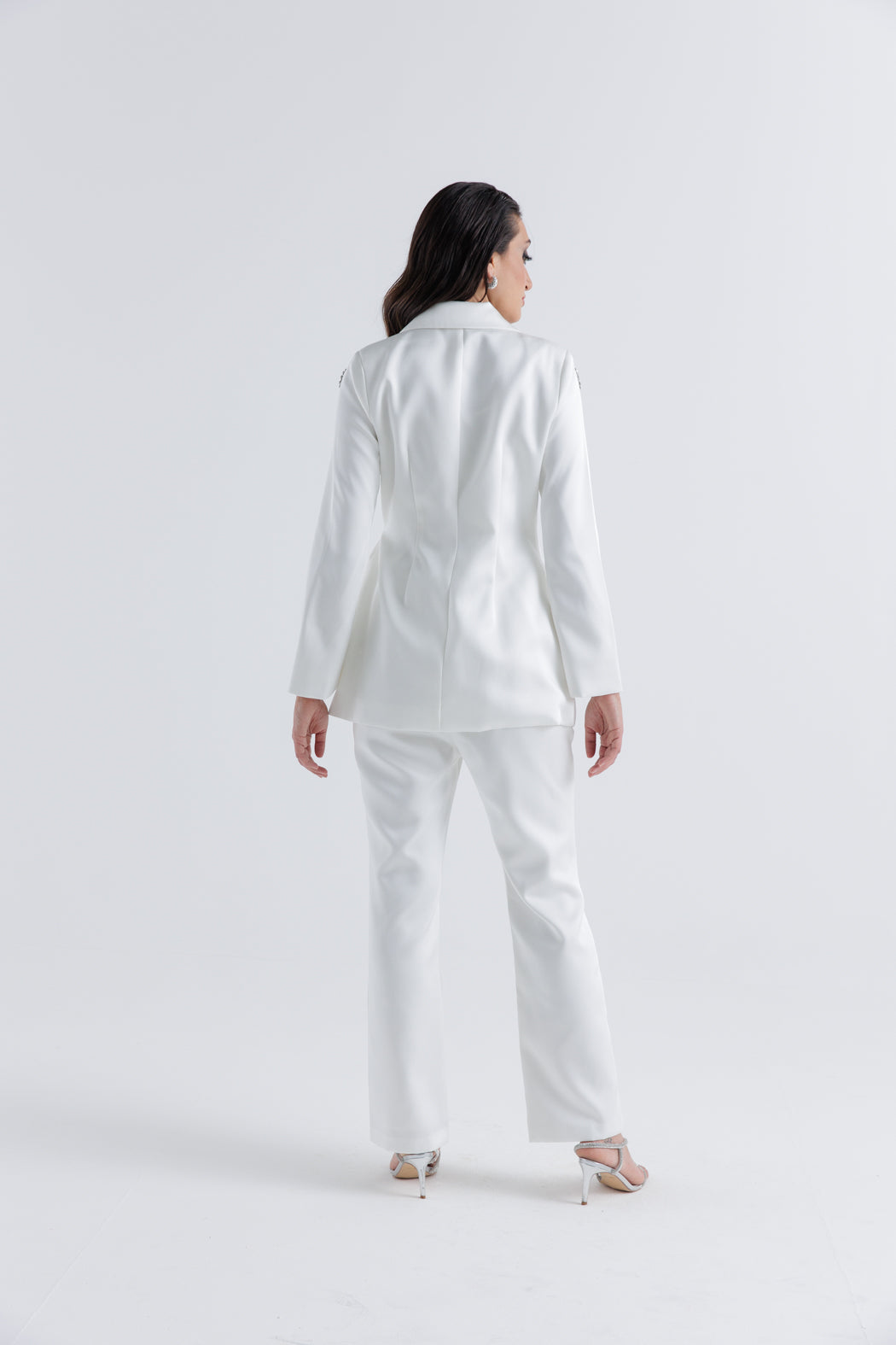 • Embellishment: Hand-applied crystal floral motifs on collar, lapel, and shoulder