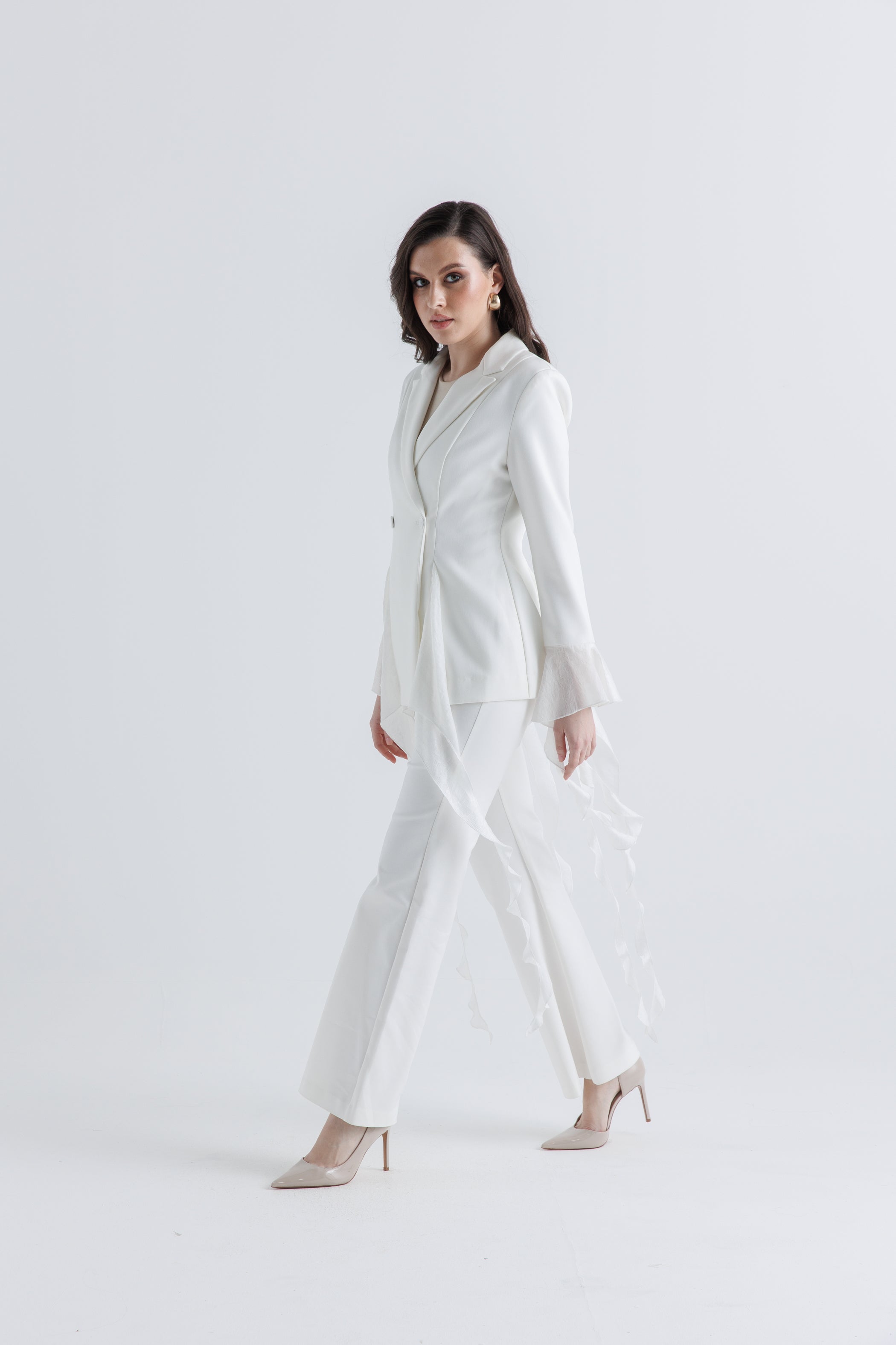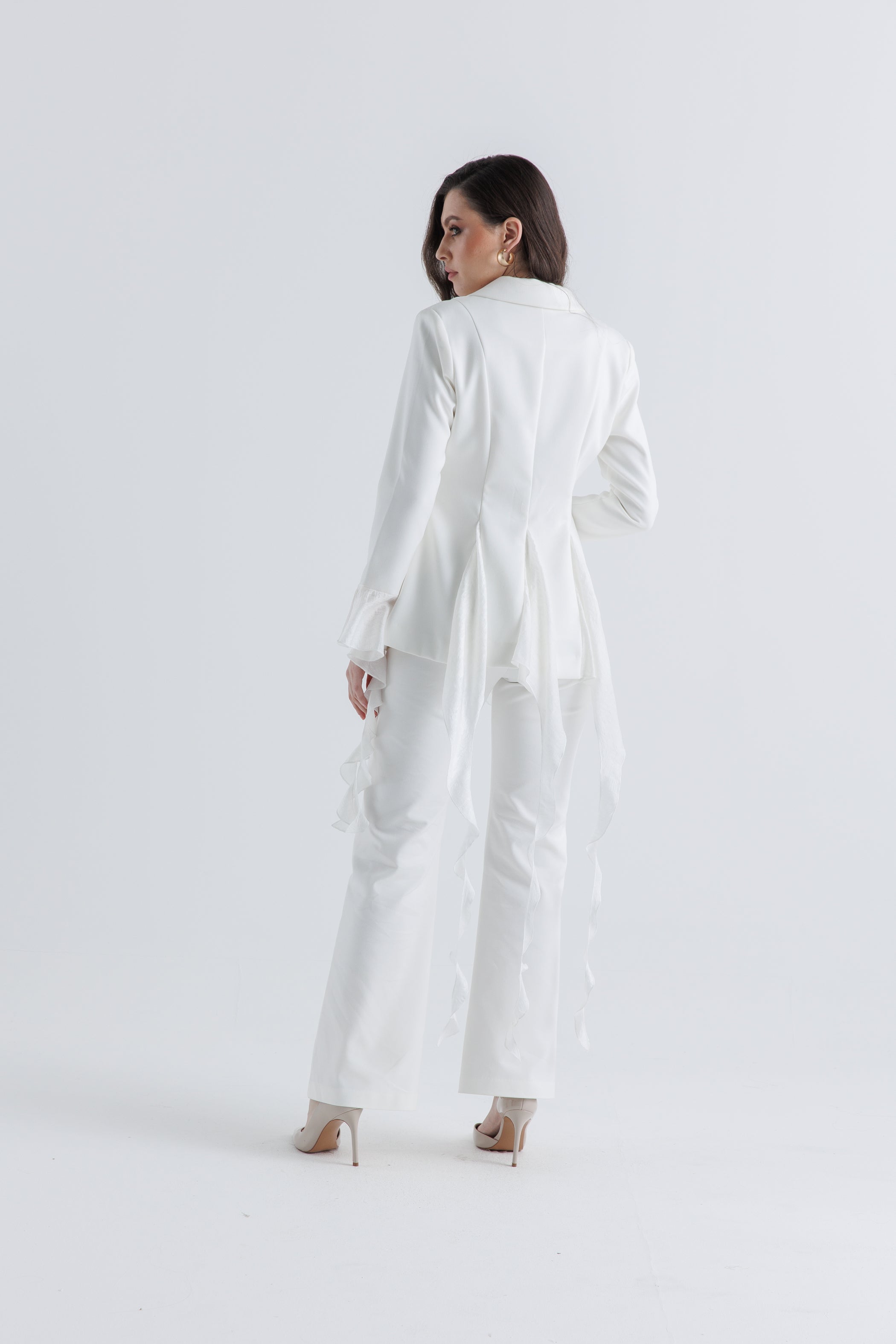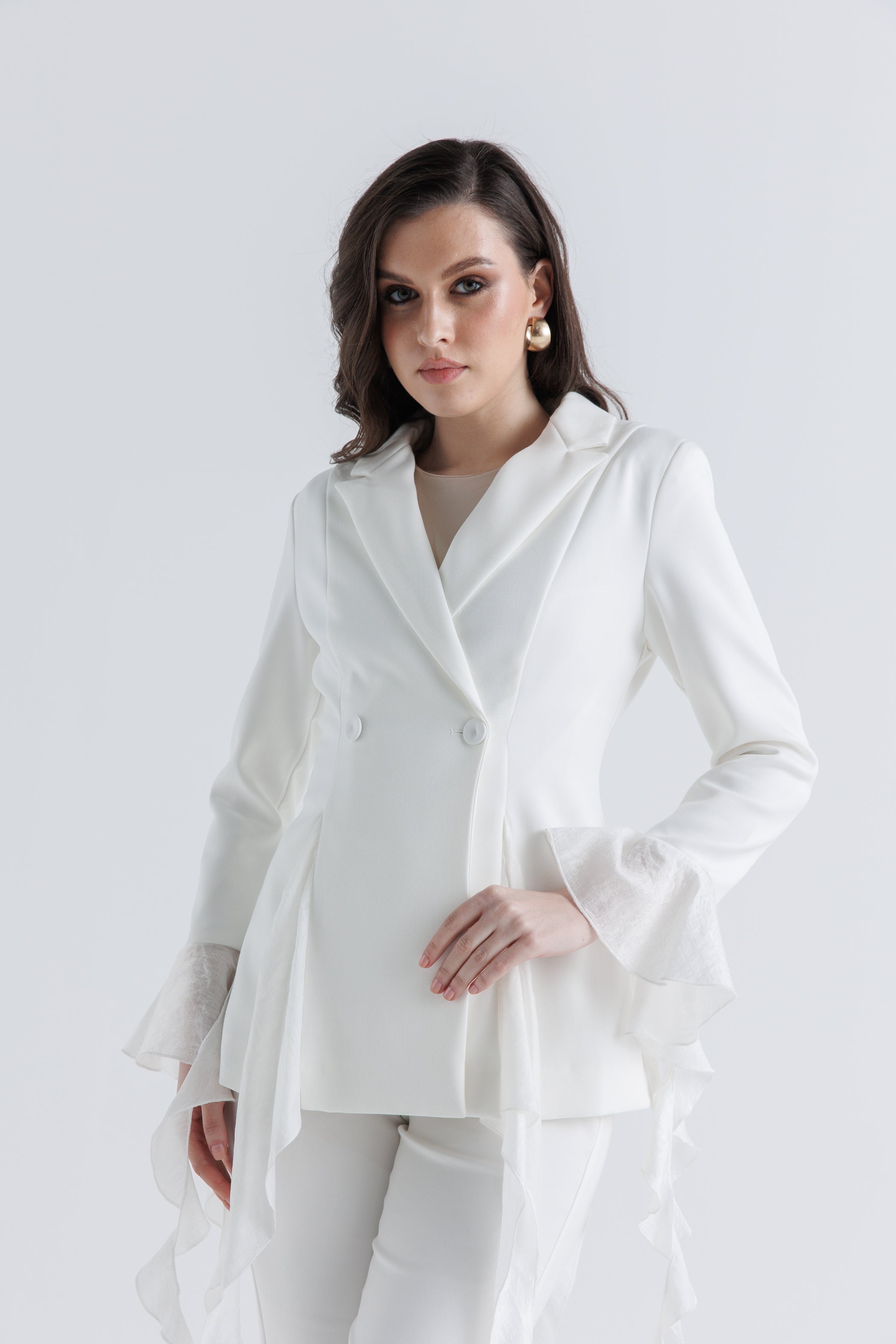 Refined elegance meets modern flair in this tailored double-breasted jacket. Crafted from structured woven fabric for a sleek silhouette, it features a notched lapel, fitted waist, and asymmetrical ruffle detailing that cascades along the sides and sleeve cuffs. The double-button front enhances its sharp tailored look, while the sheer textured ruffle panels bring fluidity and softness to the ensemble. Whether styled with matching pants or a statement skirt, this piece exudes contemporary sophistication.