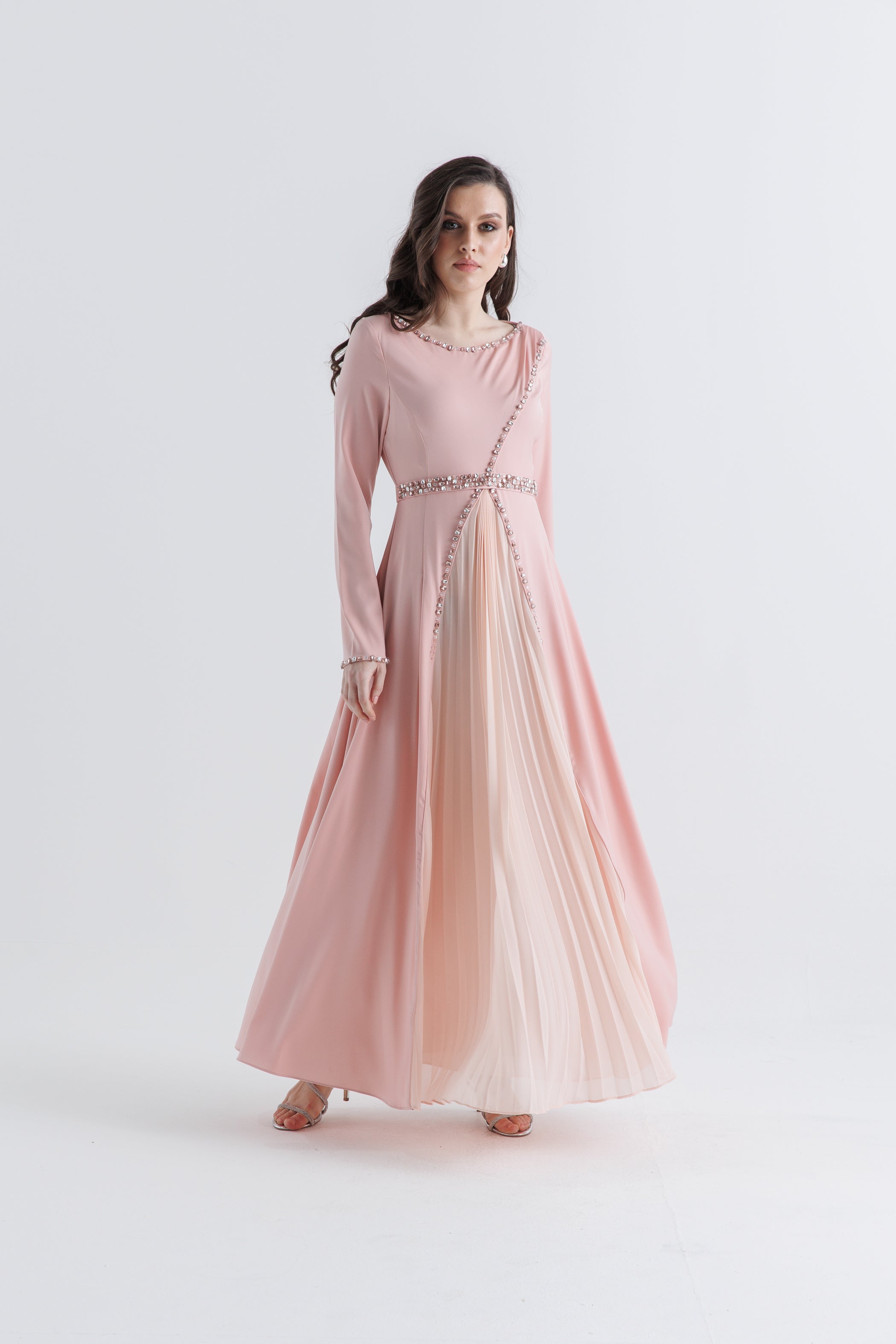 Elevate your style with this luxurious embellished pleated maxi gown, designed for special occasions like Ramadan gatherings, Eid celebrations, and formal evening events. Crafted from premium chiffon blend fabric, this gown combines elegance with a touch of sophistication.