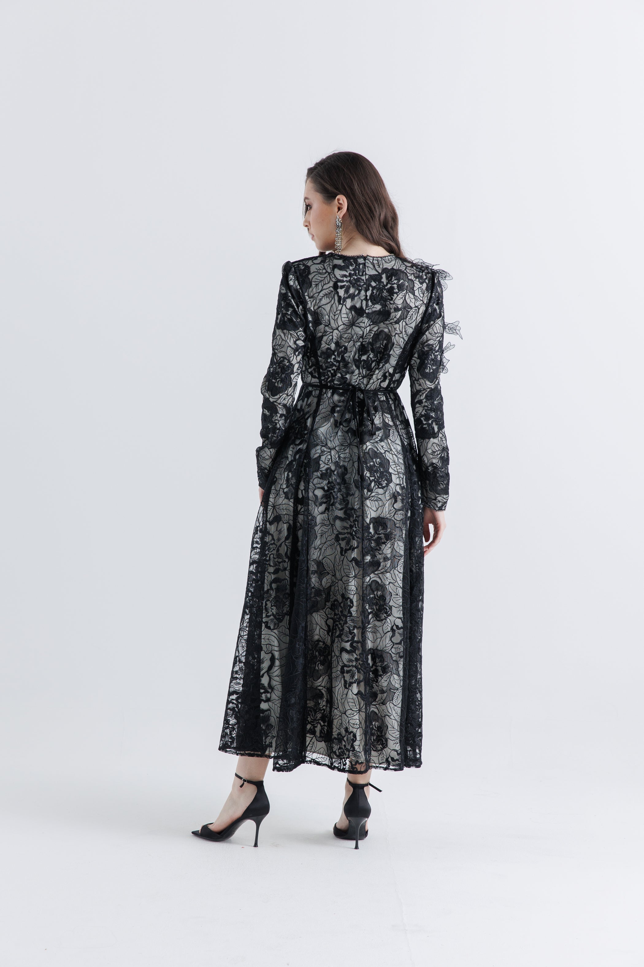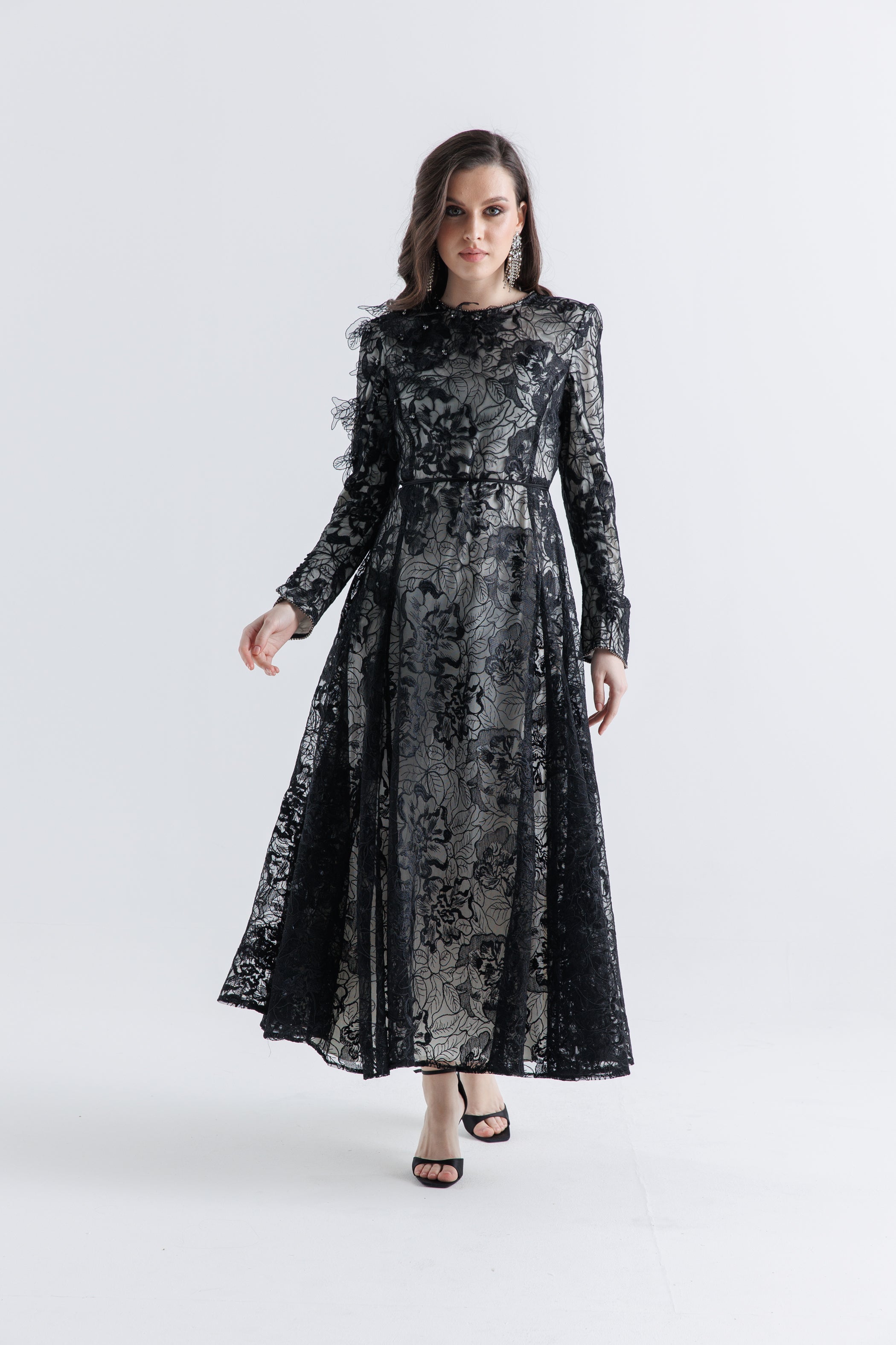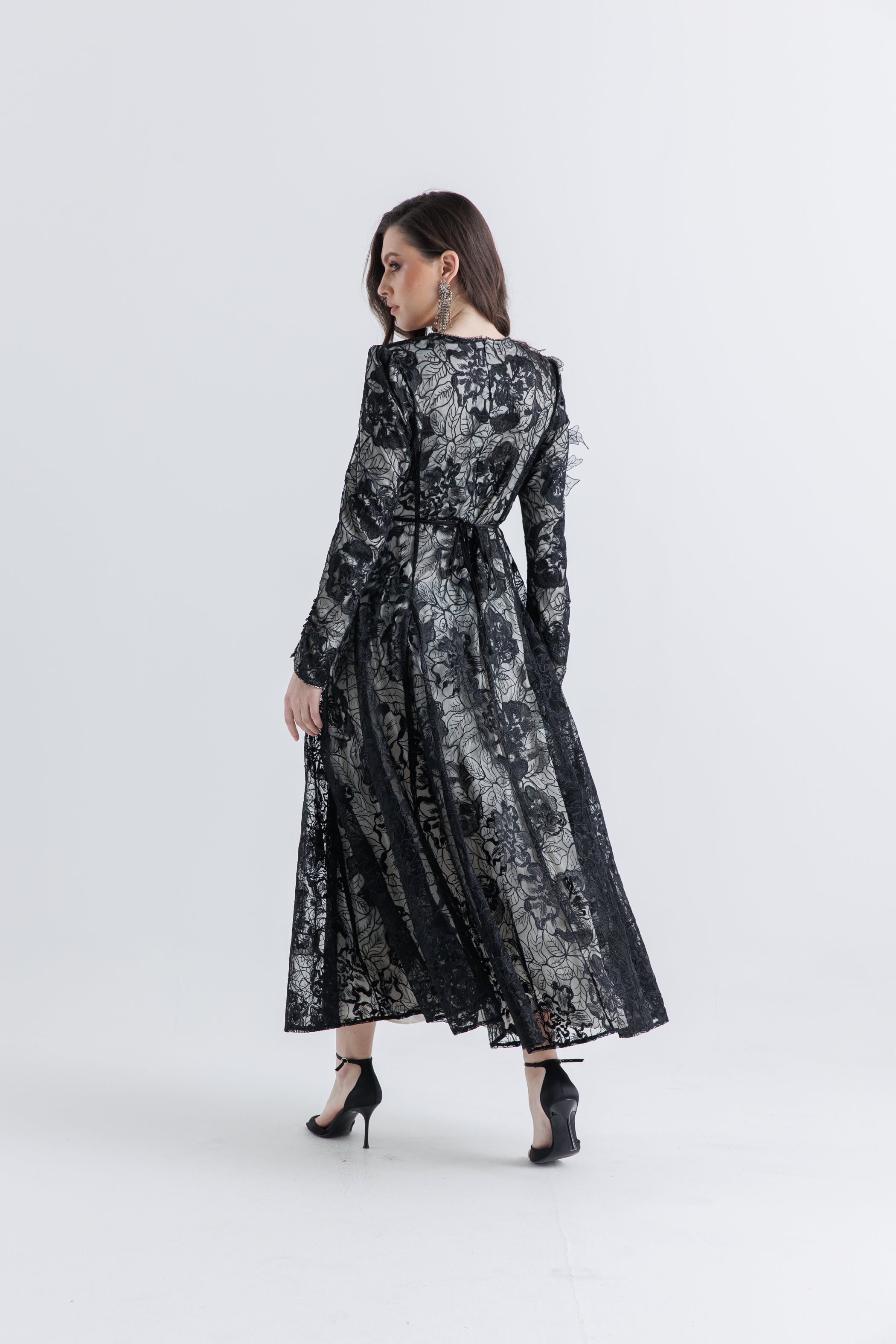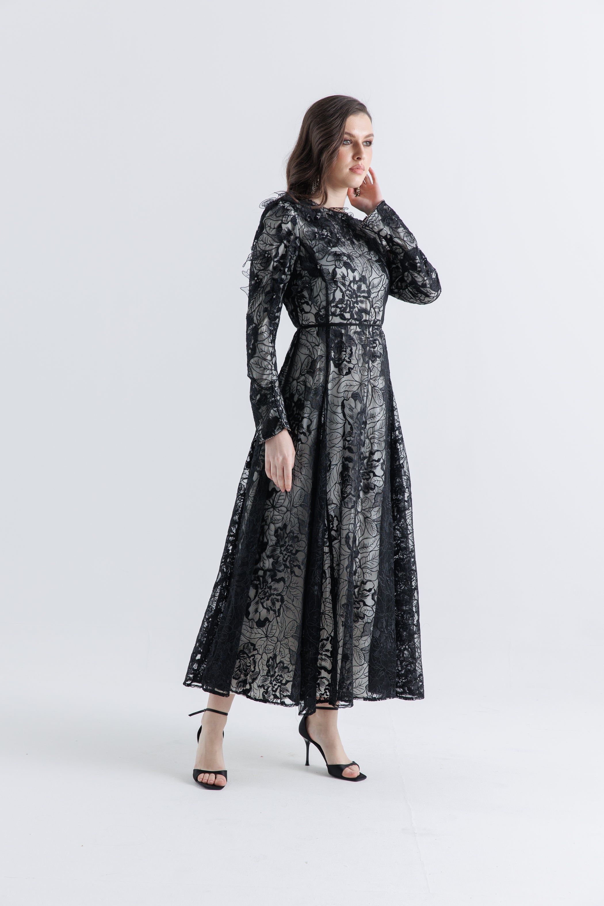 Elevate your wardrobe with this stunning floral lace maxi dress, designed to embody sophistication and grace. Crafted for the modern woman who appreciates Arabic fashion, this dress features intricate lace embroidery with subtle embellishments, making it a timeless statement piece for special gatherings and formal occasions.