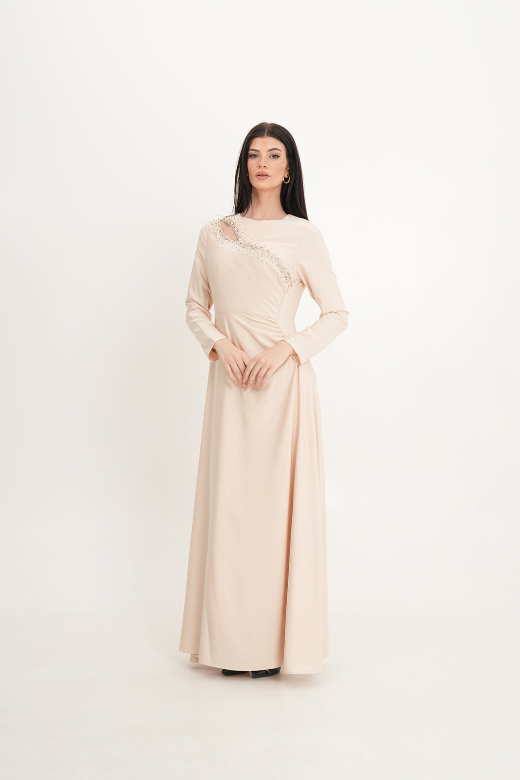 Make an elegant statement with this full-length gown crafted from fluid, soft-touch satin. The dress features a unique asymmetrical cut-out across the chest, delicately outlined with hand-applied crystal beads that catch the light beautifully. Gentle pleating along one side enhances the waistline while creating a flattering draped effect. Finished with a concealed back zipper, this piece blends sophistication with subtle sparkle—perfect for formal evenings or special celebrations.