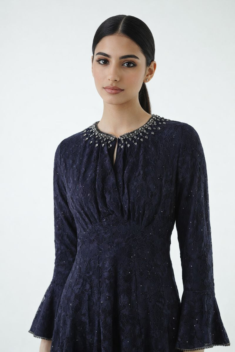 A subtly embellished neckline adds a luxurious highlight, secured with a neat front hook closure at the neck for a polished finish. The look is completed with long sleeves and statement bell cuffs, each enhanced with delicate embellishment to elevate the overall design.