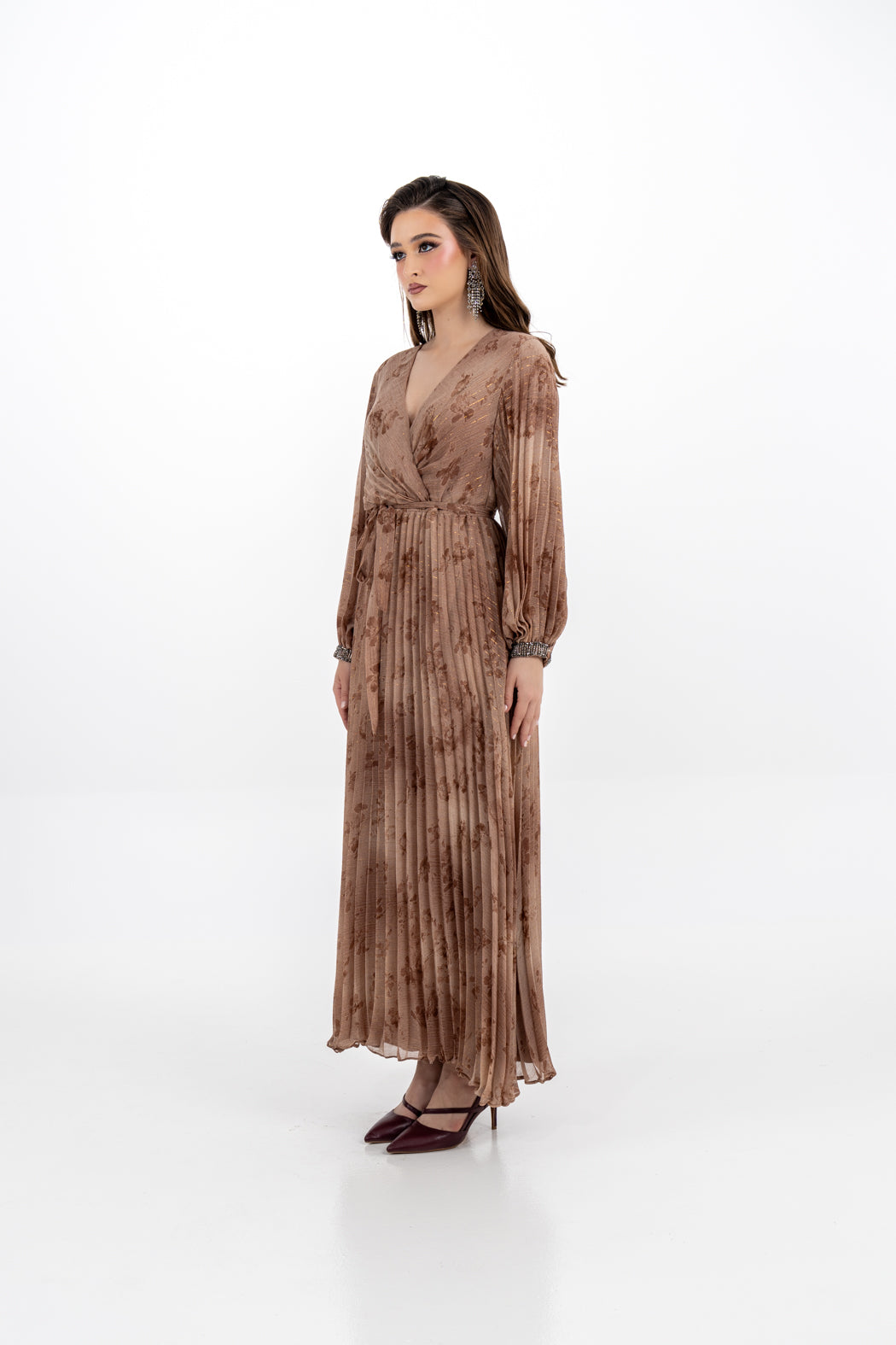 Elevate your wardrobe with this stunning pleated maxi dress, designed with elegance and comfort in mind. Featuring a flattering V-neckline and a belted waist that accentuates your silhouette, this dress flows into a graceful pleated skirt that moves beautifully with every step. The long sleeves with embellished cuffs add a touch of luxury, making it ideal for formal occasions or stylish gatherings. The dress length is approximately 142 cm, offering full coverage with effortless sophistication.