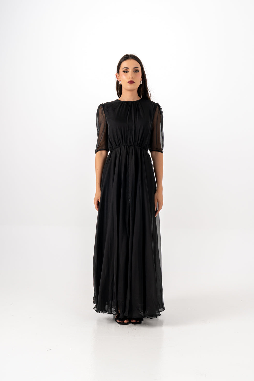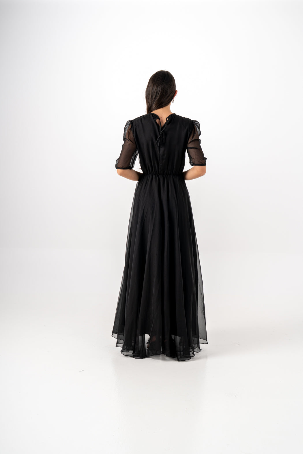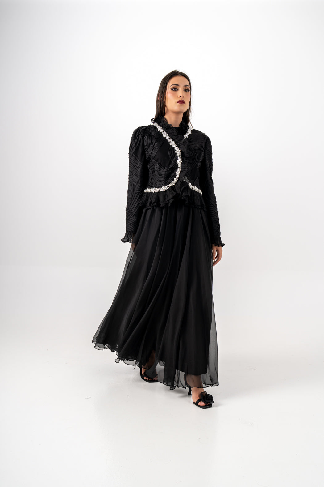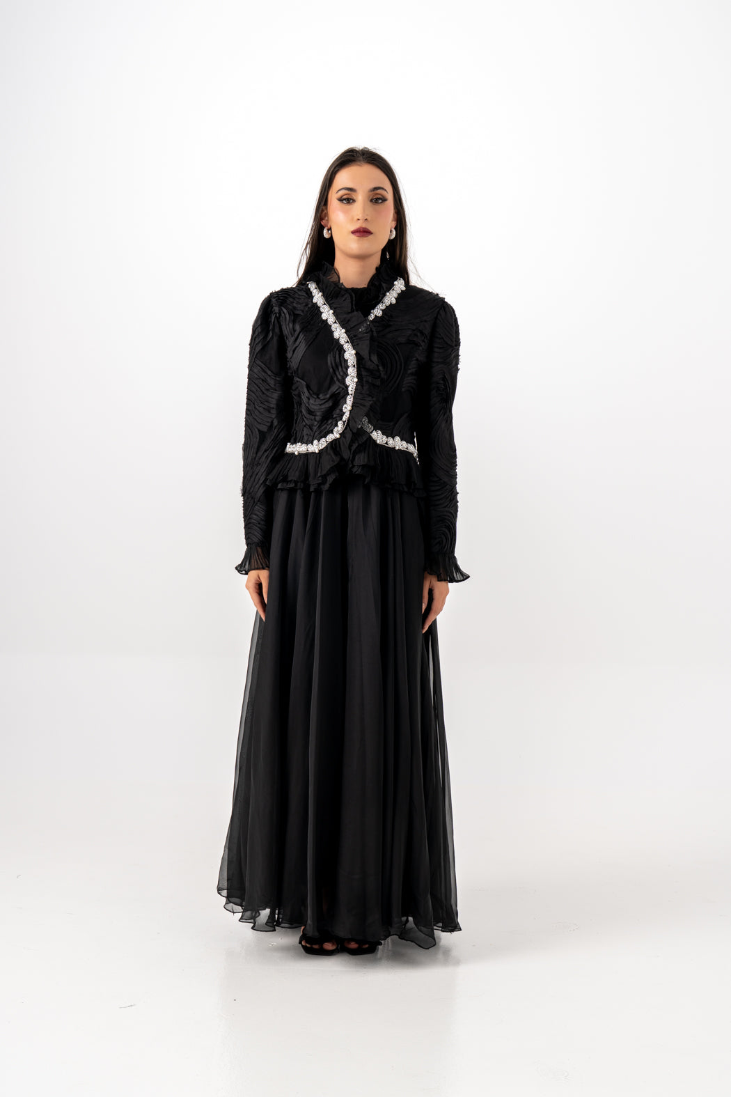 This stunning two-piece ensemble blends elegance and craftsmanship in perfect harmony. The look features a classic black or ivory maxi dress with a soft, flowing silhouette and sheer half sleeves, paired with a statement removable jacket adorned with intricate textured fabric and crystal embellishments.