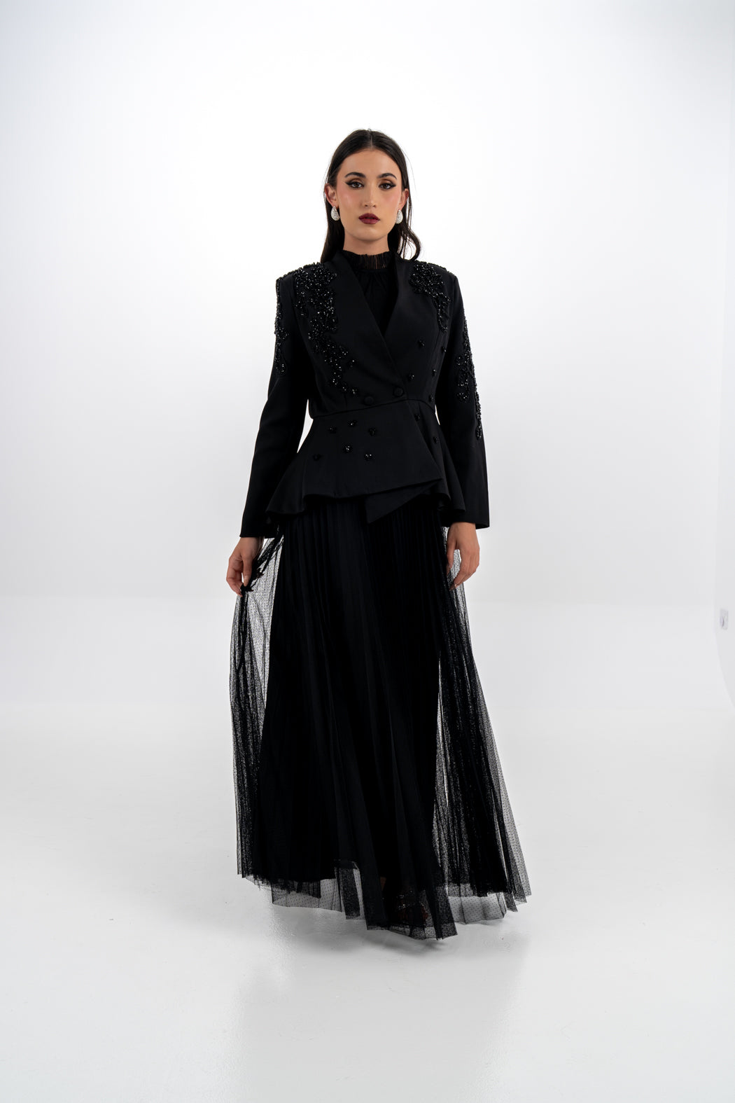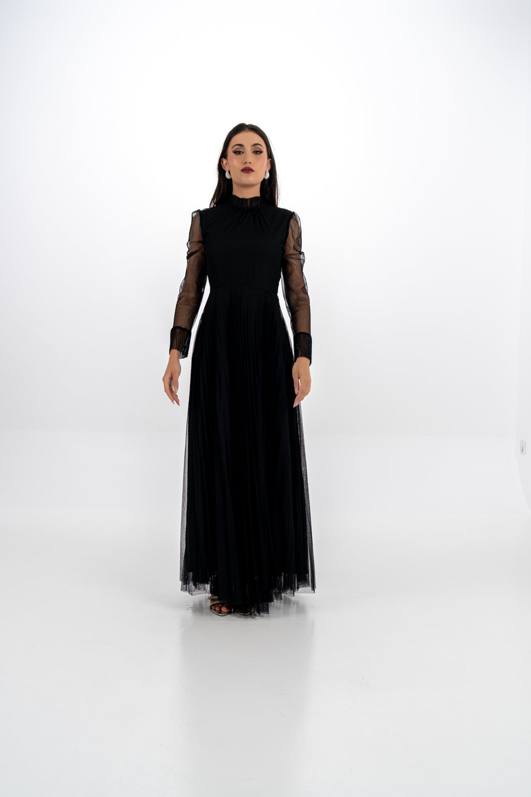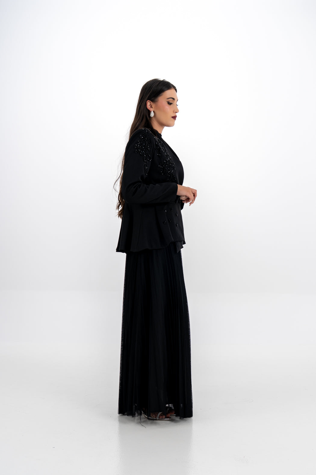 An elegant two-piece design featuring a soft, flowing pleated maxi dress paired with a beautifully embroidered removable jacket. The dress has a gathered high neckline, long sheer sleeves with a delicate dotted pattern, and a full-length pleated skirt measuring 150 cm.