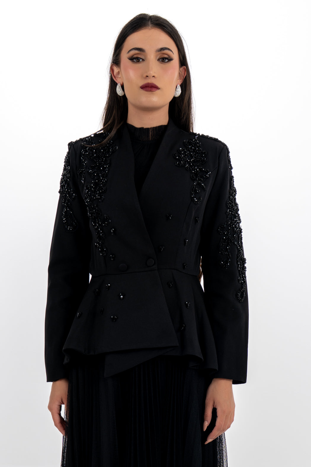 The removable jacket is embellished with intricate bead and thread embroidery on the shoulders and sleeves, adding a luxurious touch. A matching embellished belt is included to define the waist and complete the look with elegance.