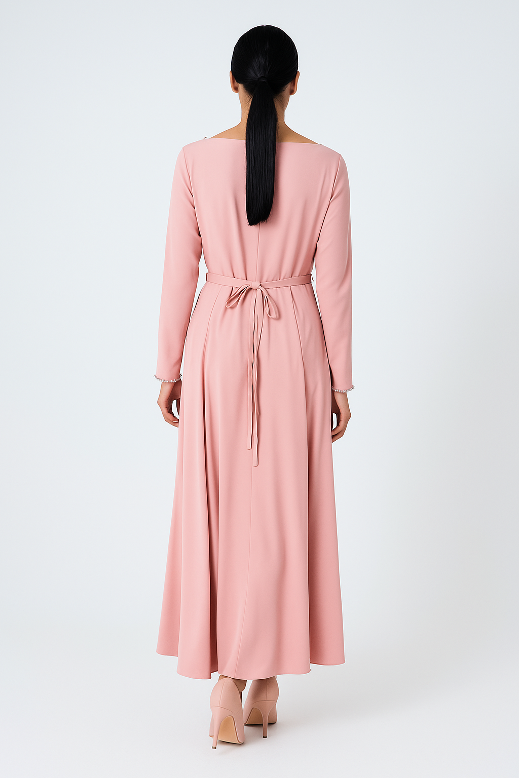Pair this embellished long dress with nude heels and a clutch for evening wear, Ramadan gatherings, or Eid celebrations.