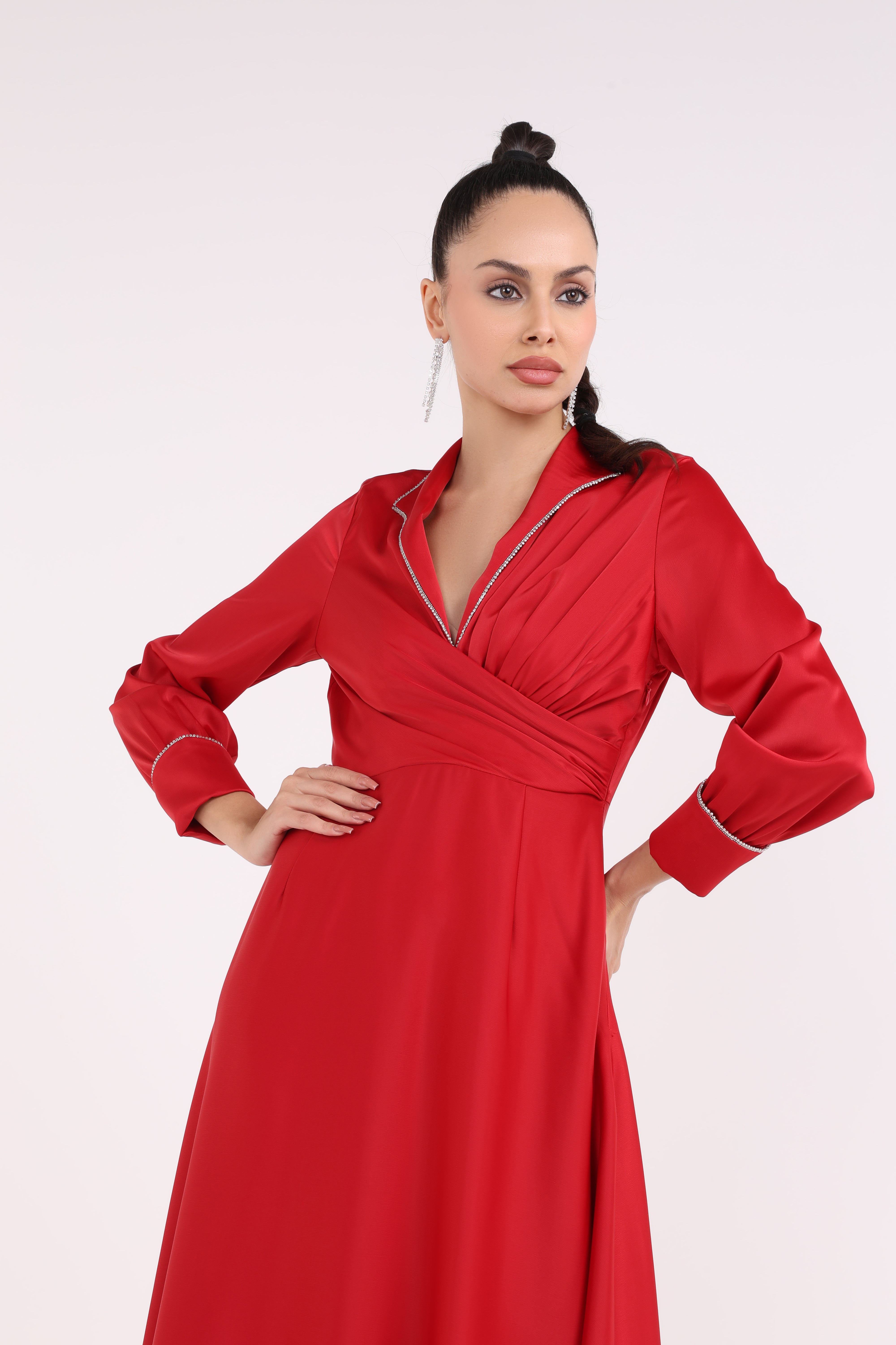 Step into sophistication with this flowy V-neck maxi dress, designed to blend elegance with comfort. Featuring a gracefully pleated collar, shimmering crystal accents, and a flattering A-line silhouette, this dress is perfect for formal occasions and evening gatherings. Its lightweight fabric and full lining ensure a smooth, luxurious drape that moves with you.