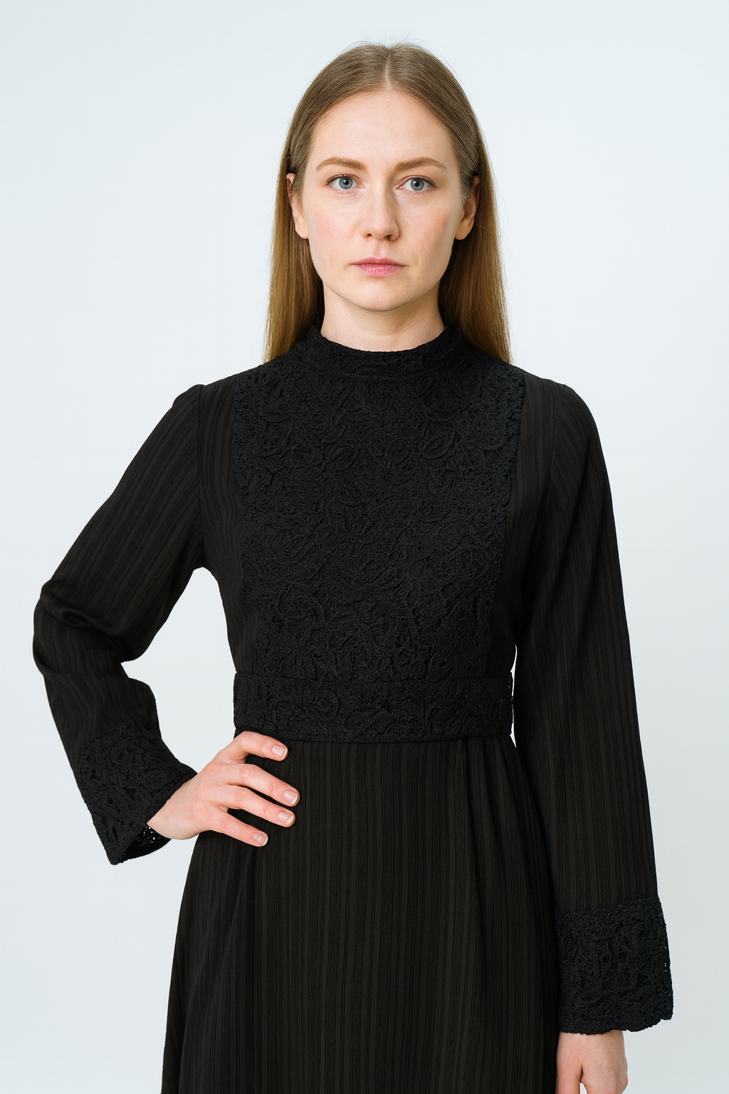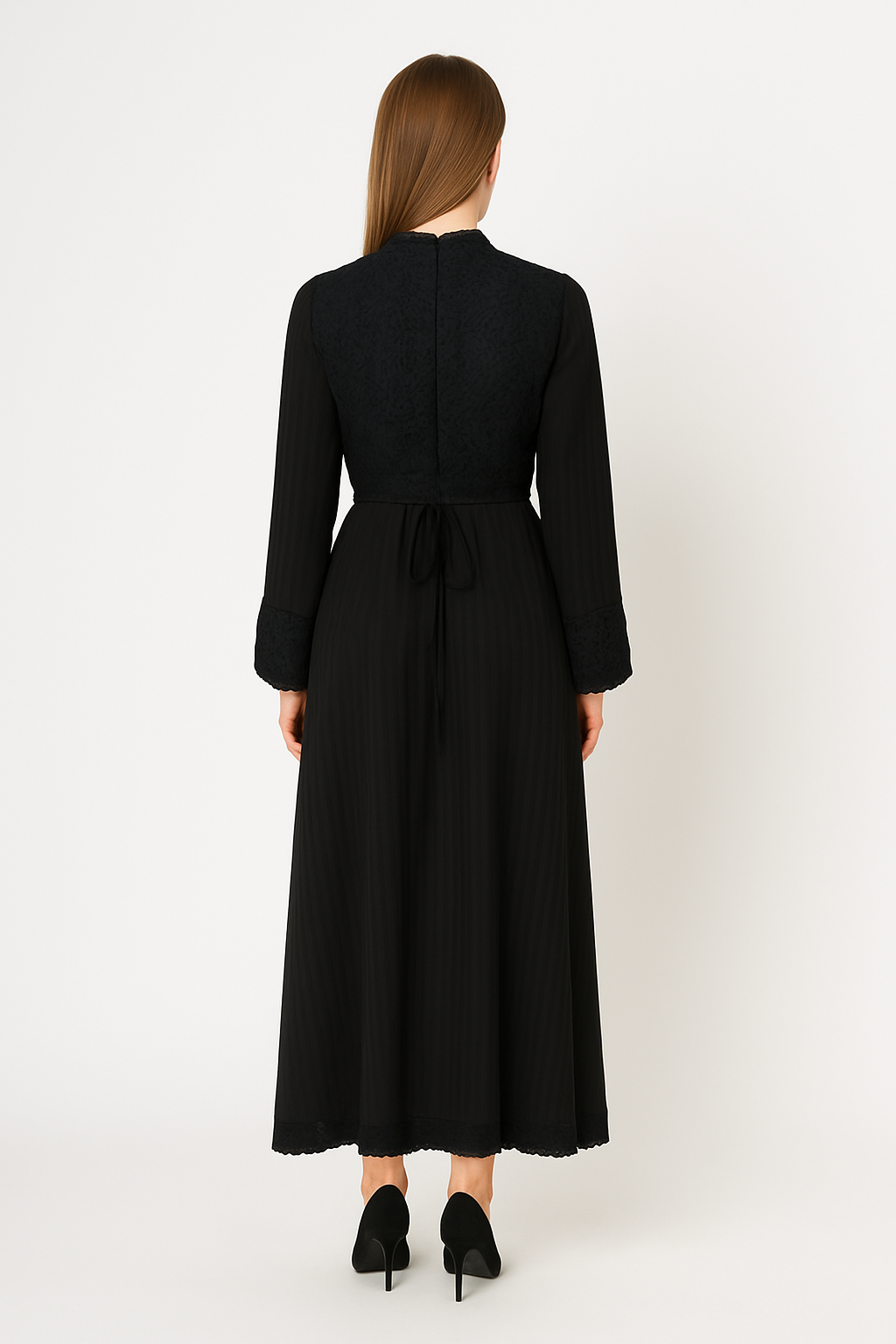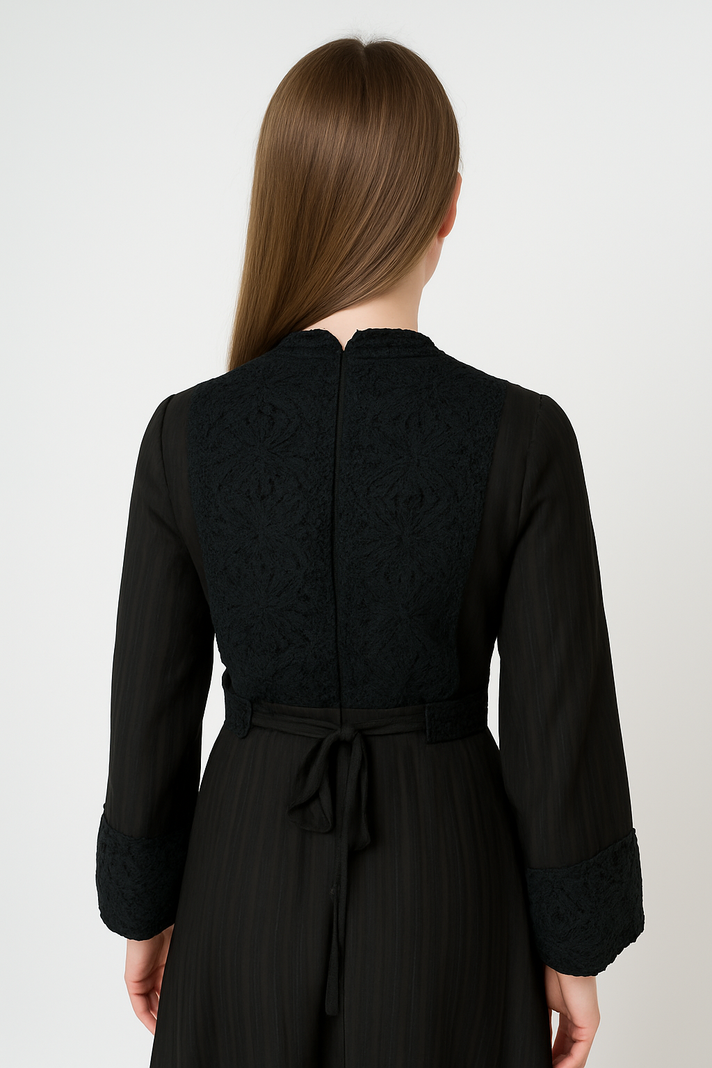 This elegant maxi dress blends timeless sophistication with feminine charm. Designed with intricate lace details on the bodice, cuffs, and hemline, it adds a refined touch to your wardrobe. The long sleeves and flowing silhouette provide both modesty and grace, while the flattering waist tie at the back enhances the fit. Perfect for special occasions or chic evening wear, this dress is crafted to ensure comfort without compromising on elegance.