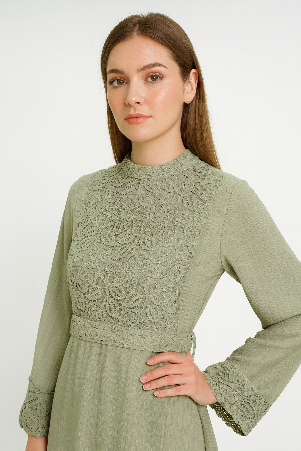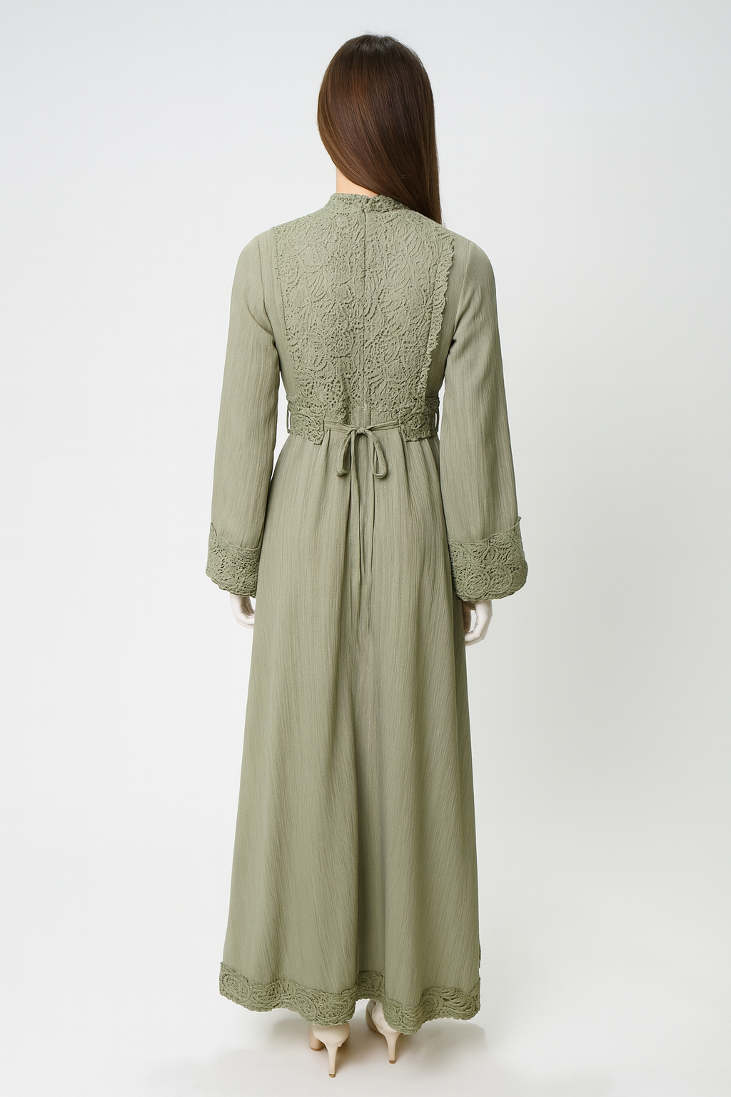 This elegant maxi dress blends timeless sophistication with feminine charm. Designed with intricate lace details on the bodice, cuffs, and hemline, it adds a refined touch to your wardrobe. The long sleeves and flowing silhouette provide both modesty and grace, while the flattering waist tie at the back enhances the fit. Perfect for special occasions or chic evening wear, this dress is crafted to ensure comfort without compromising on elegance.