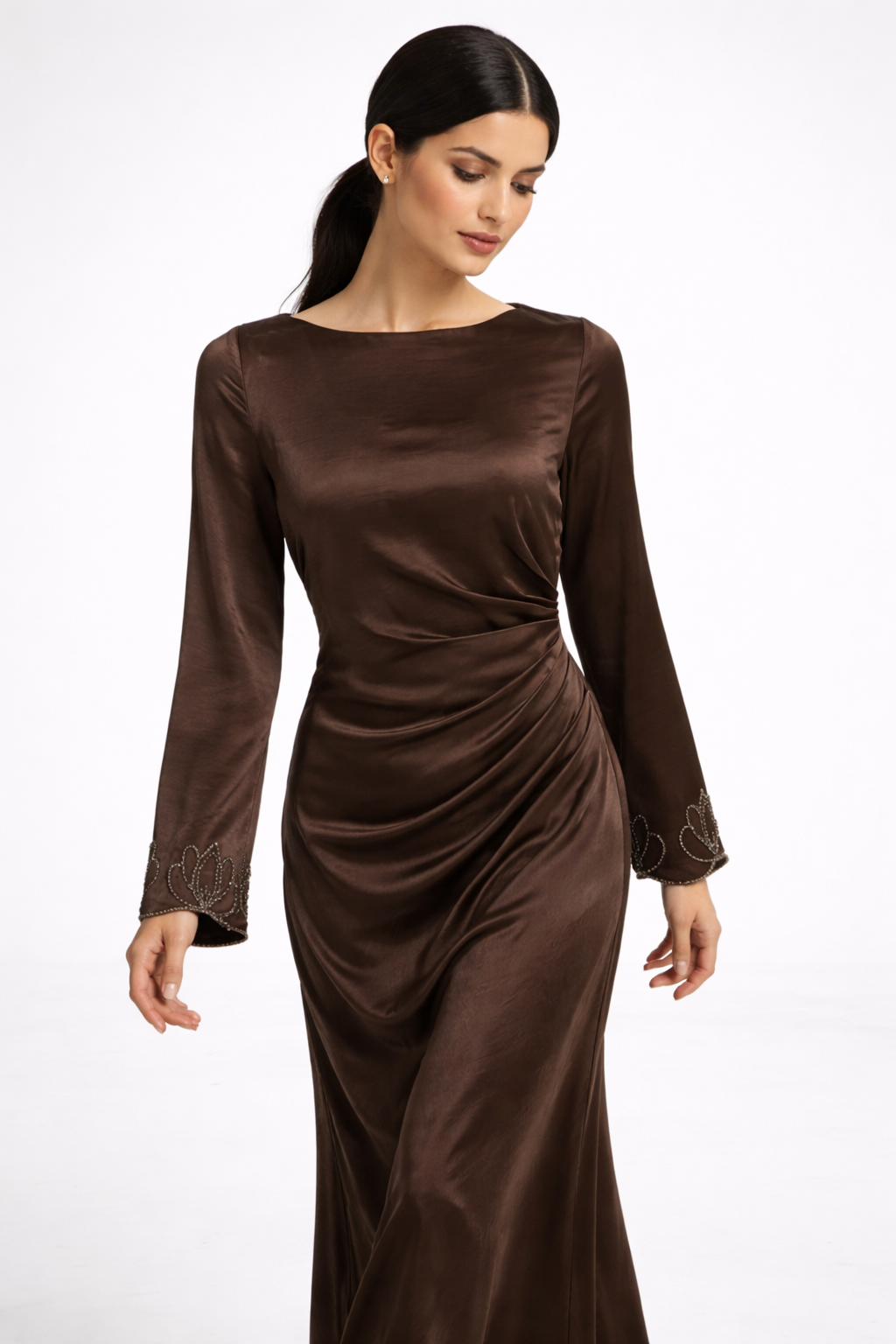 Designed for refined Ramadan and Eid dressing, this elegant maxi dress features a clean bateau neckline and a softly draped silhouette that flatters the body with understated sophistication. The gathered waist detail creates graceful movement while enhancing the natural shape, flowing seamlessly into a fluid full-length skirt. Crafted from a smooth satin-finish fabric, it offers a luminous sheen and a soft, luxurious handfeel. Long sleeves are finished with delicate handcrafted embellishment at the cuffs, adding a subtle artisanal touch without overpowering the design. A concealed side zipper and a clean back with minimal detailing ensure a polished, effortless finish throughout.