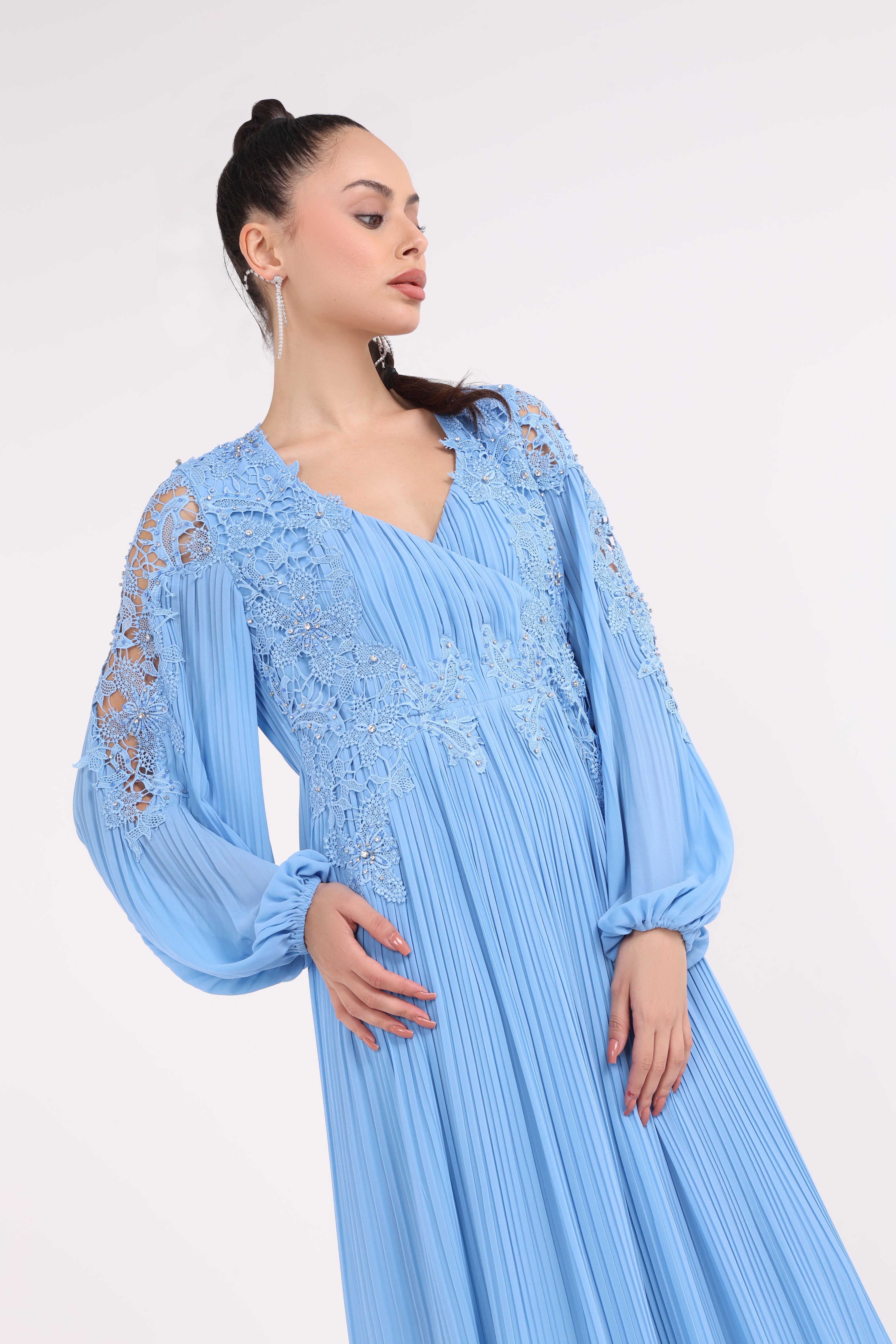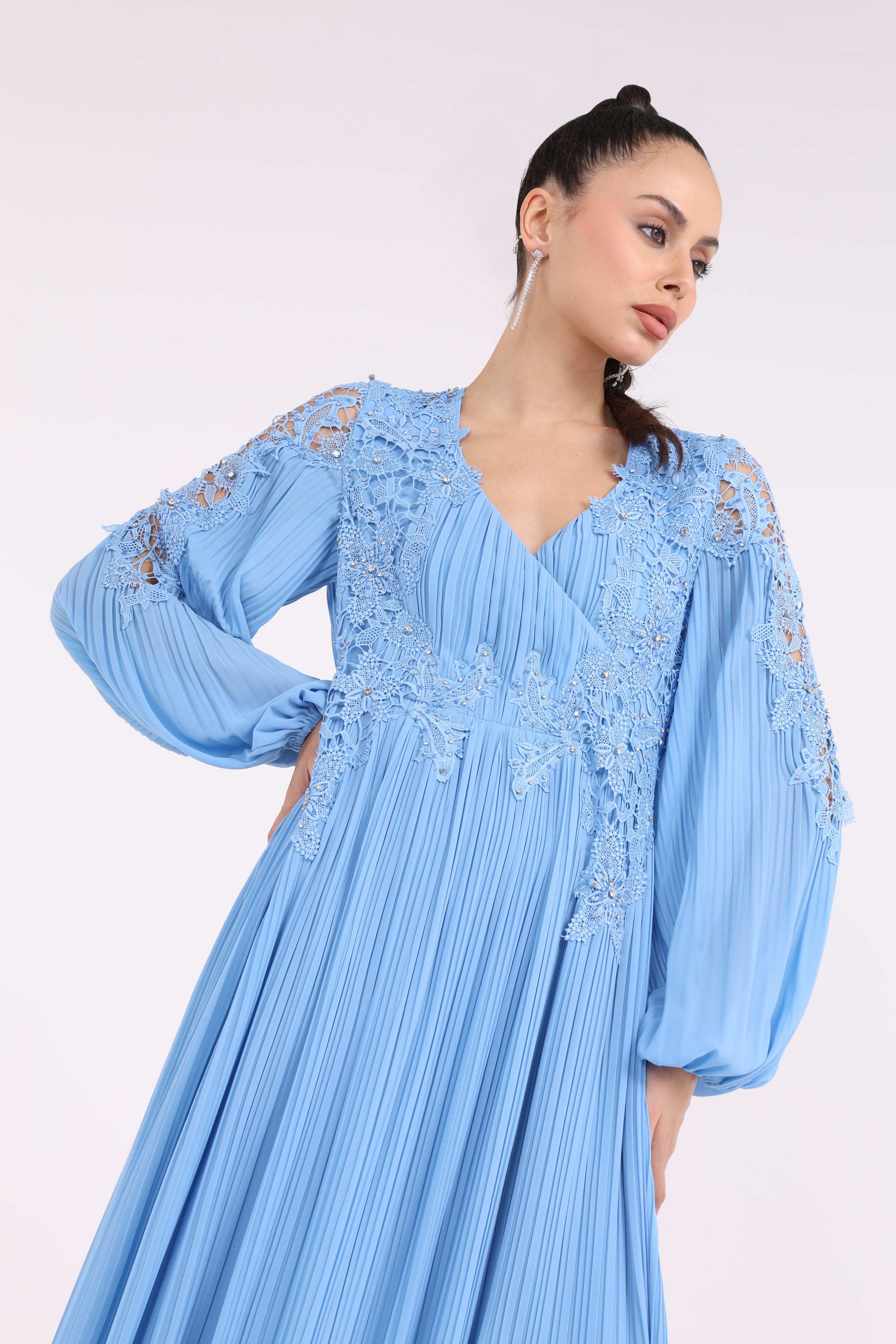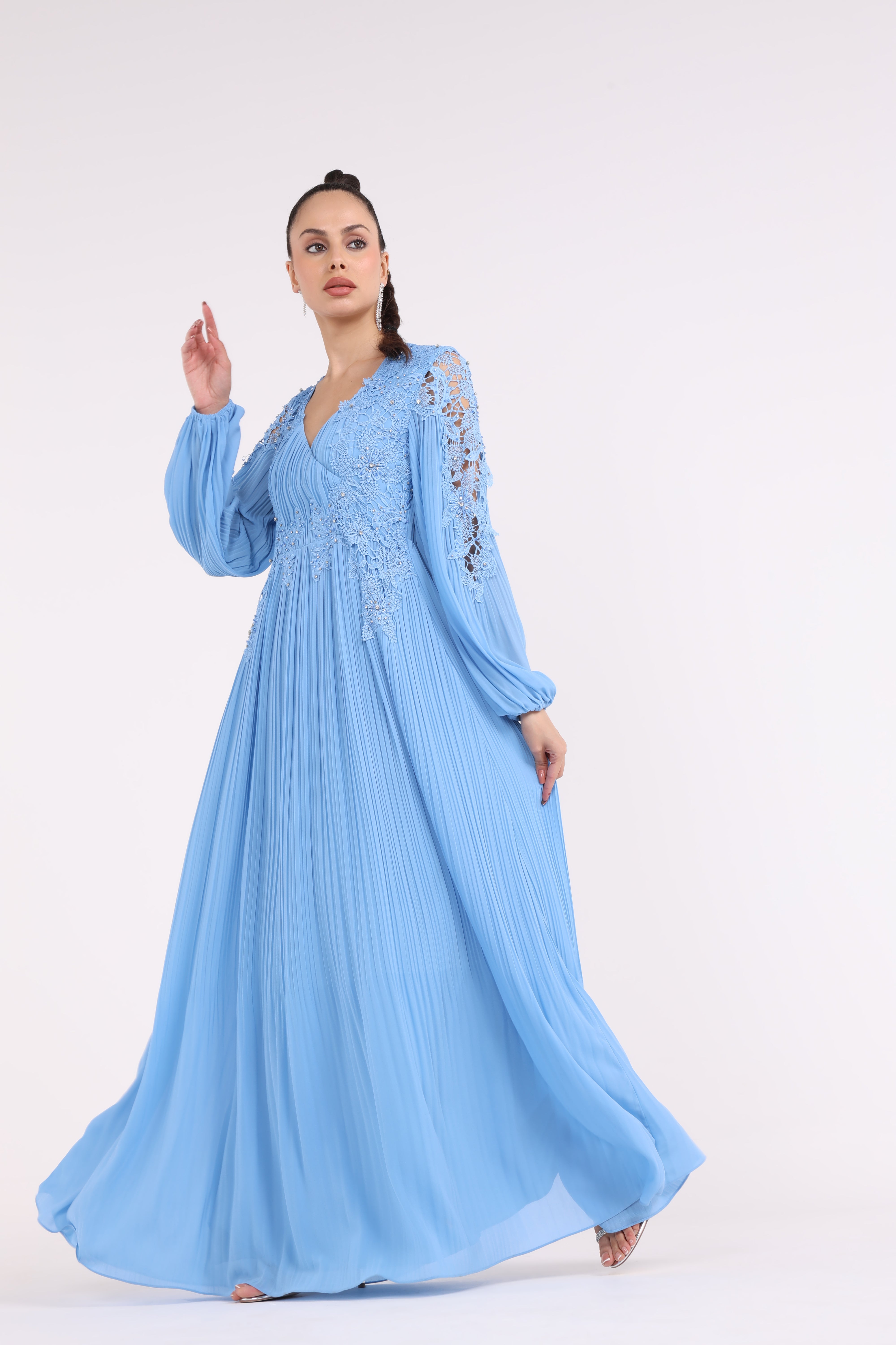 Make a statement in this ethereal sky blue gown, designed for the modern woman who loves elegance with a touch of flair. The intricate lace detailing on the shoulders and bodice adds a luxurious feel, while the plisse skirt flows beautifully for a captivating silhouette. With its long, billowy sleeves and flattering V-neckline, this dress exudes grace and charm. Whether attending a special event or simply wanting to feel glamorous, this gown is sure to turn heads.