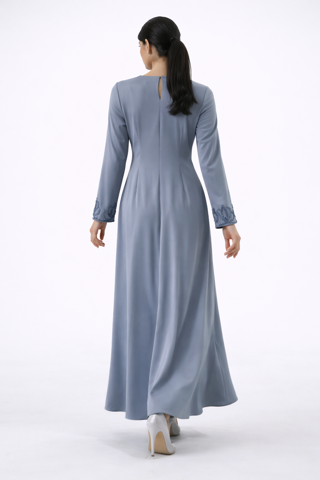 Designed for refined elegance, this luxurious maxi dress features a flattering V-neckline with a softly twisted front that creates graceful draping across the bodice. The gently gathered waist enhances the silhouette, offering a feminine and polished shape. Crafted from a smooth satin-finish fabric, it flows effortlessly with fluid movement and a graceful fall. Long sleeves are finished with exquisite handmade embellishment cuffs, adding a subtle touch of artisanal luxury. Completed with a concealed side zipper and keyhole hook closure, this 150 cm dress is ideal for Ramadan and Eid occasions.