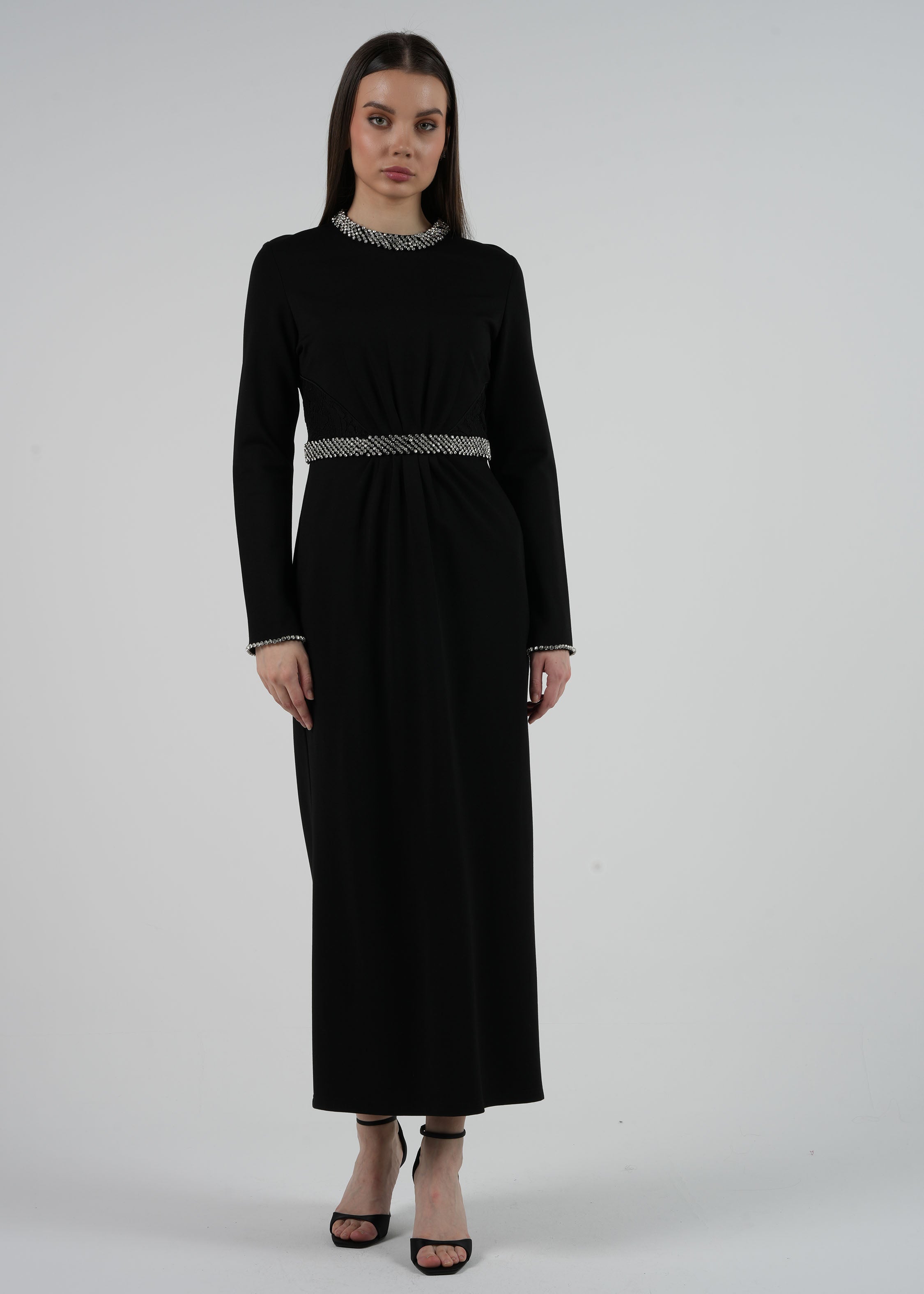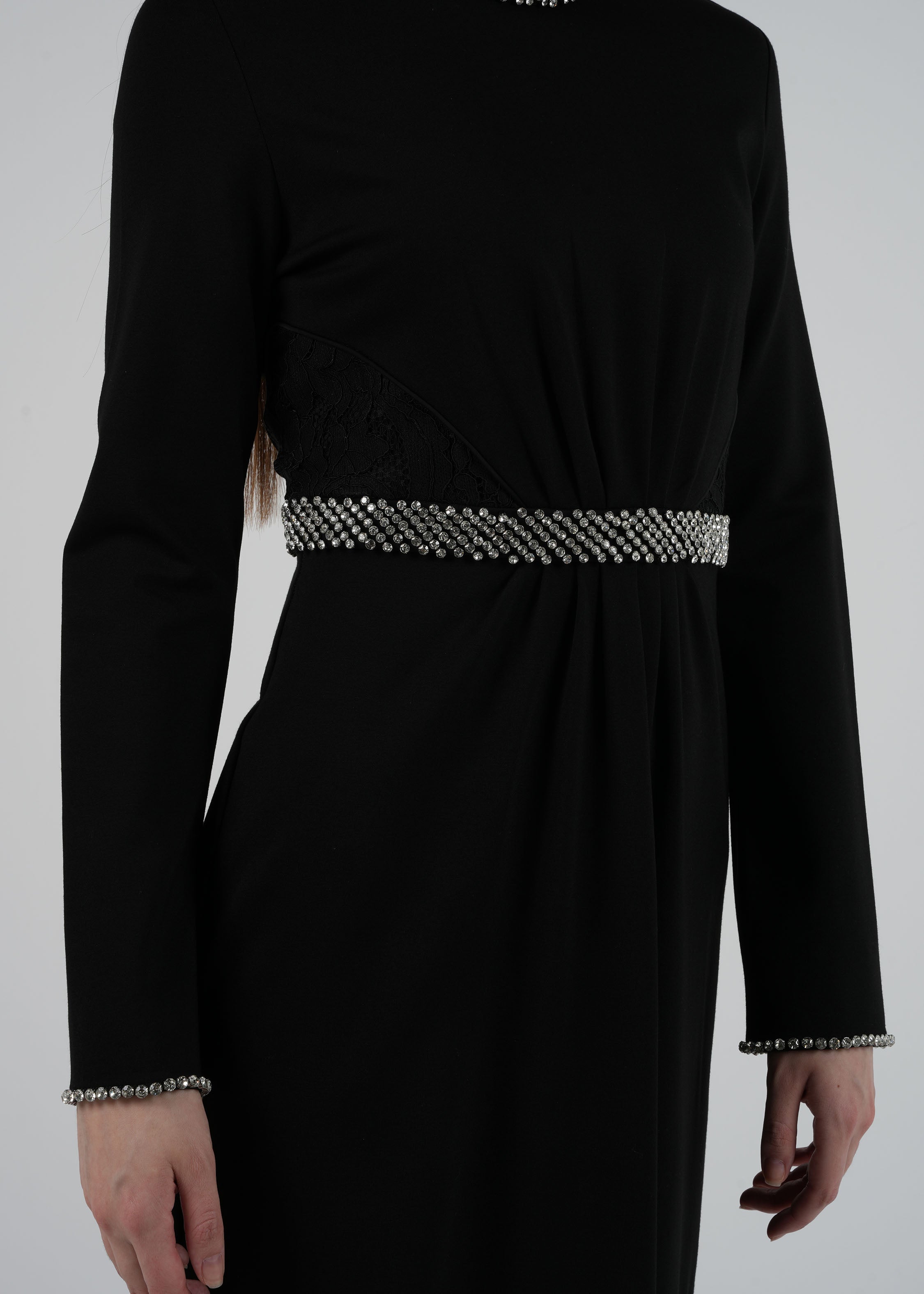 Step into refined elegance with this Elegant Crystal Embellished Maxi Dress, designed to exude sophistication and grace. Featuring a high neckline and long sleeves, this dress is adorned with exquisite crystal embellishments on the neckline, cuffs, and waistline. Delicate lace inserts at the waist add a touch of femininity and charm, enhancing the overall silhouette. The subtle pleats create a flattering fit, making it the perfect choice for formal events and special occasions.