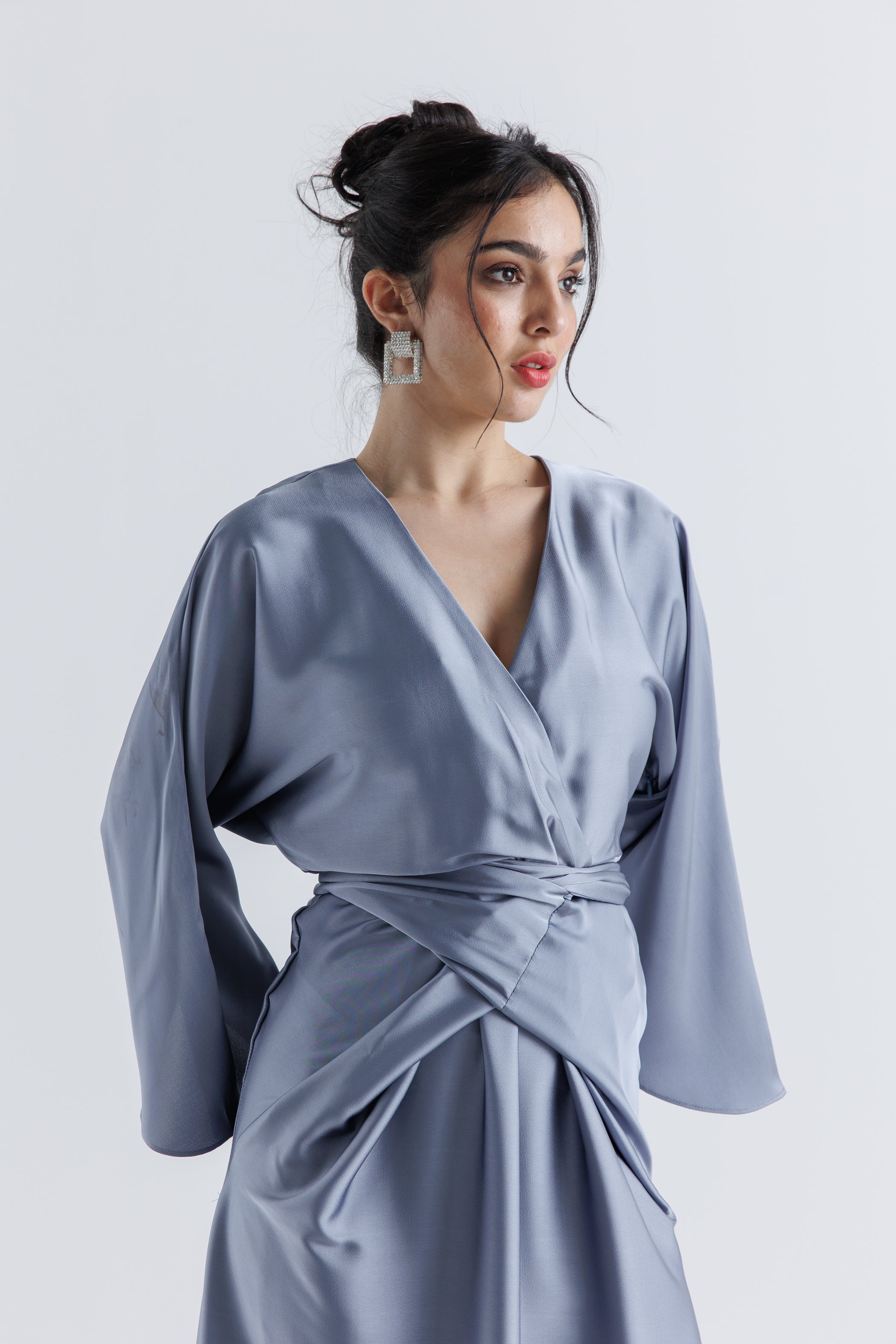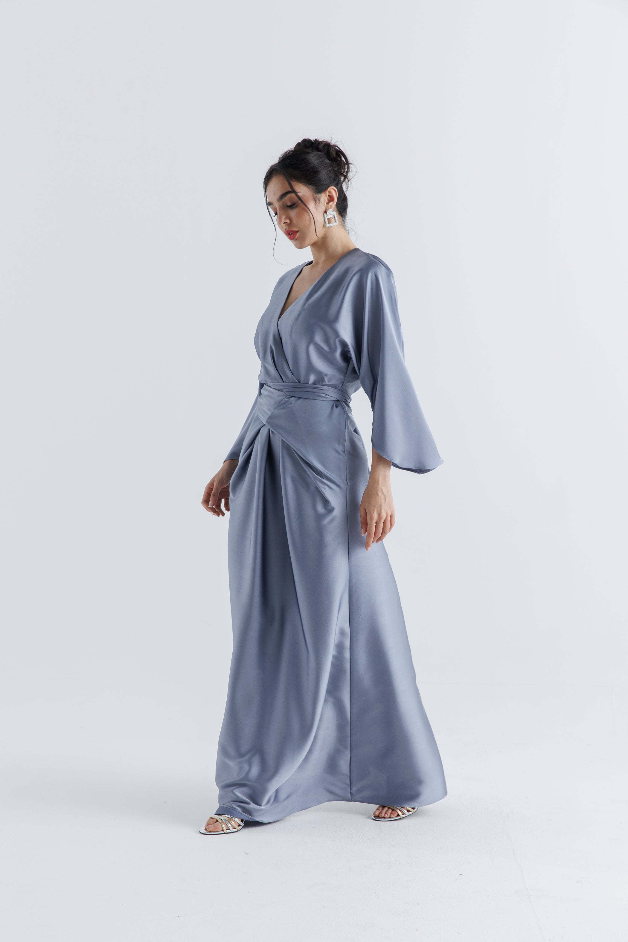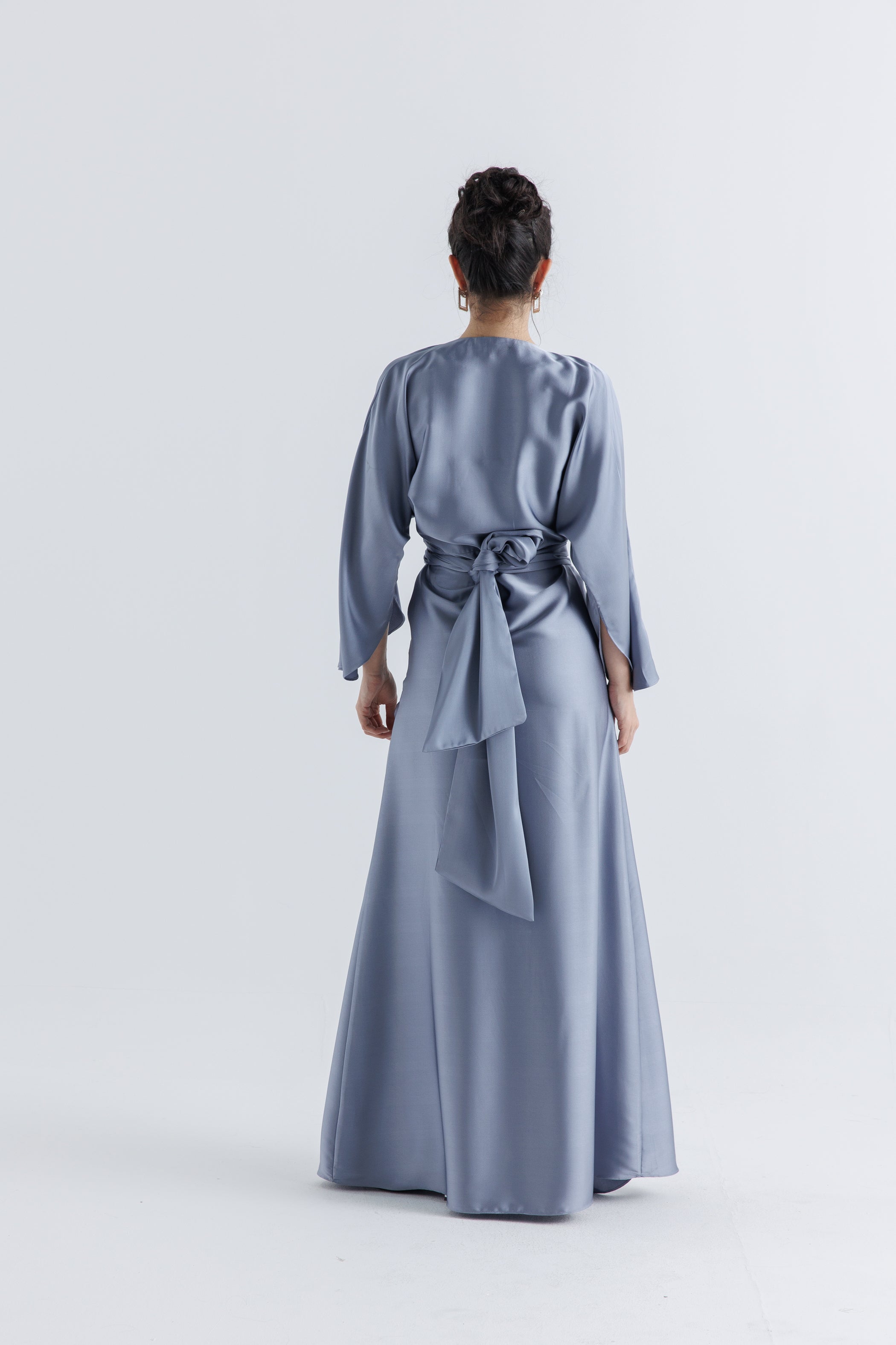 Sleek, soft, and effortlessly graceful—this wrap-effect satin maxi dress is a timeless piece for sophisticated occasions. Designed with a V-neckline and wide kimono-style sleeves, the dress features a beautifully gathered waist that ties into an elegant bow at the back. The fluid drape and subtle sheen of the satin fabric create a flattering silhouette that moves with elegance.