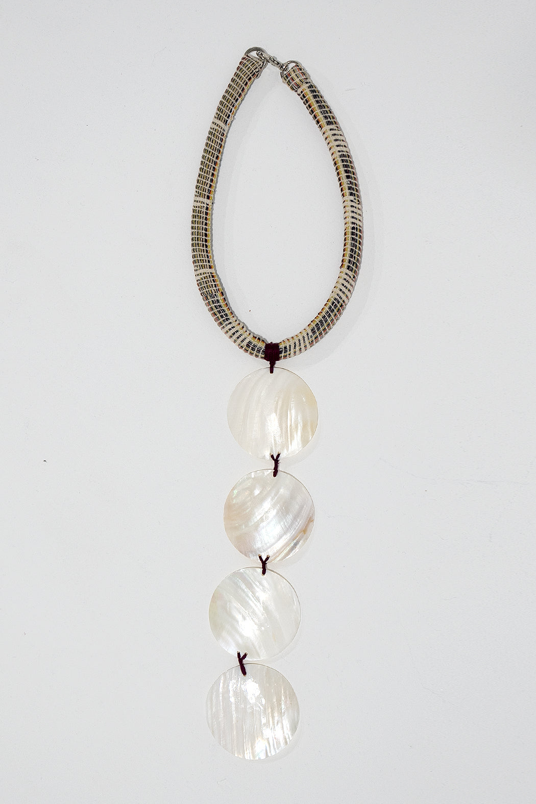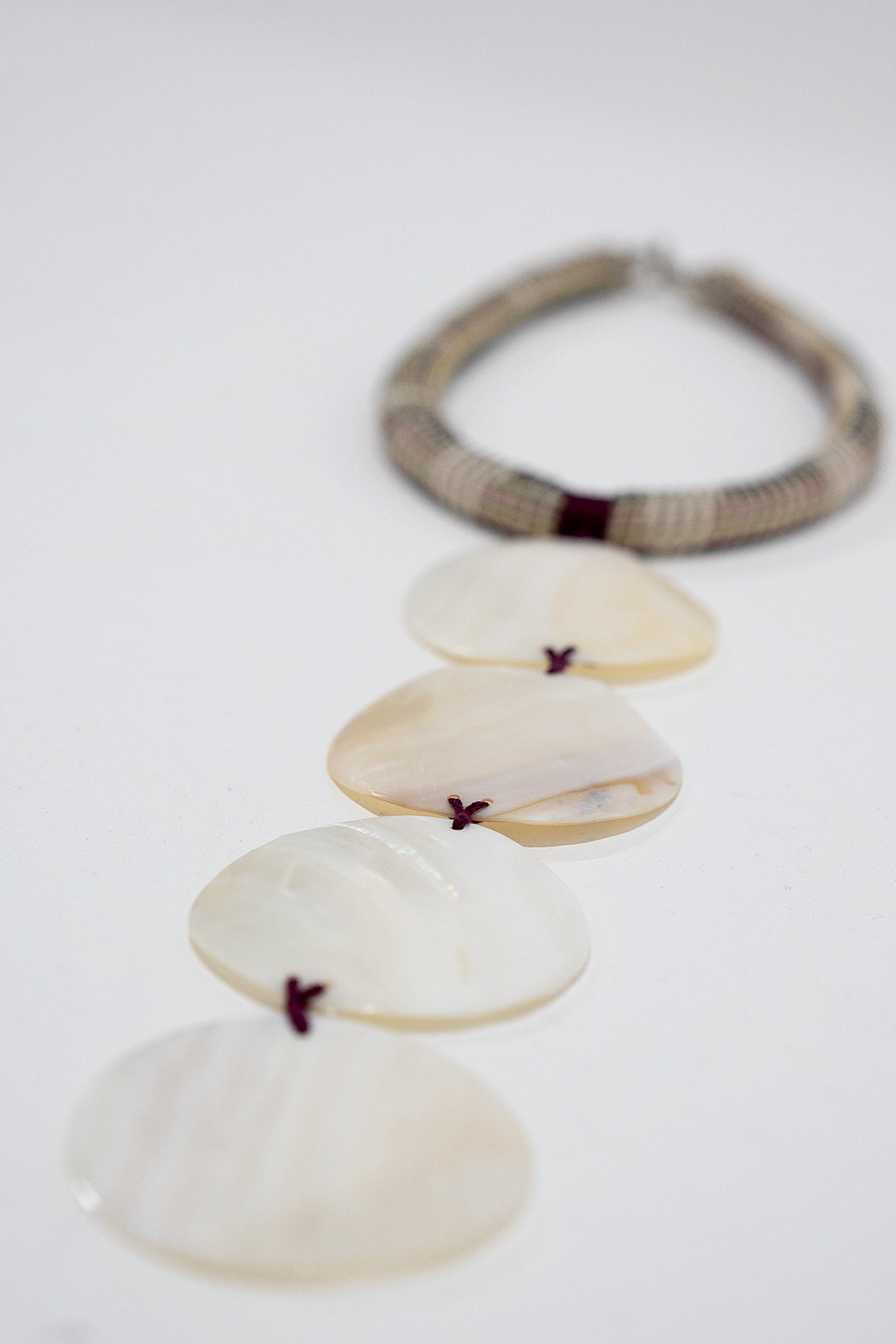 This handcrafted statement necklace, exclusively designed by ABRAR AL MUBARAK, is a perfect blend of artistry and natural beauty. Featuring a fabric-covered tubular structure, crafted from woven cotton with intricate patterns, this necklace offers both comfort and a distinctive bohemian aesthetic.