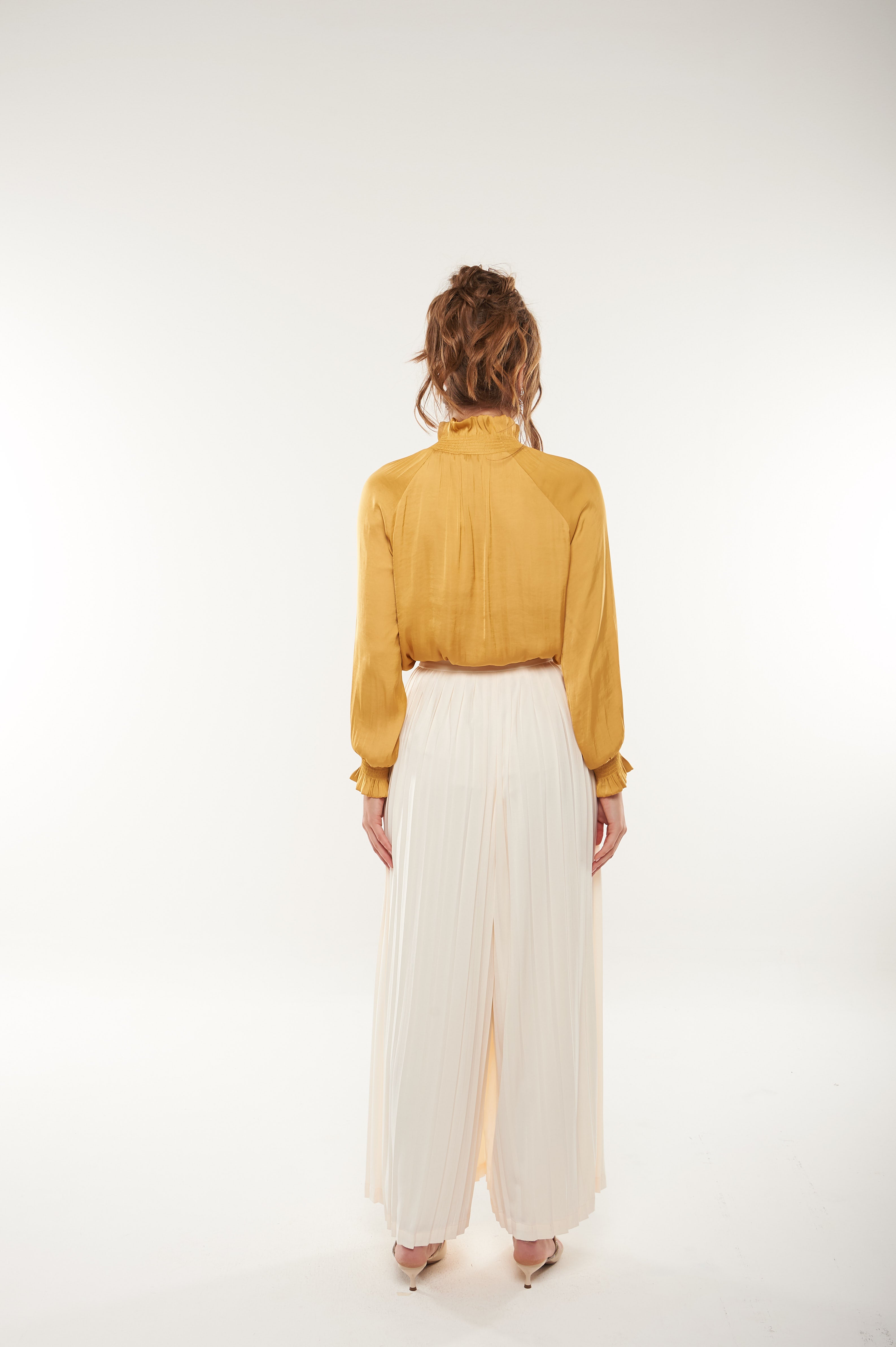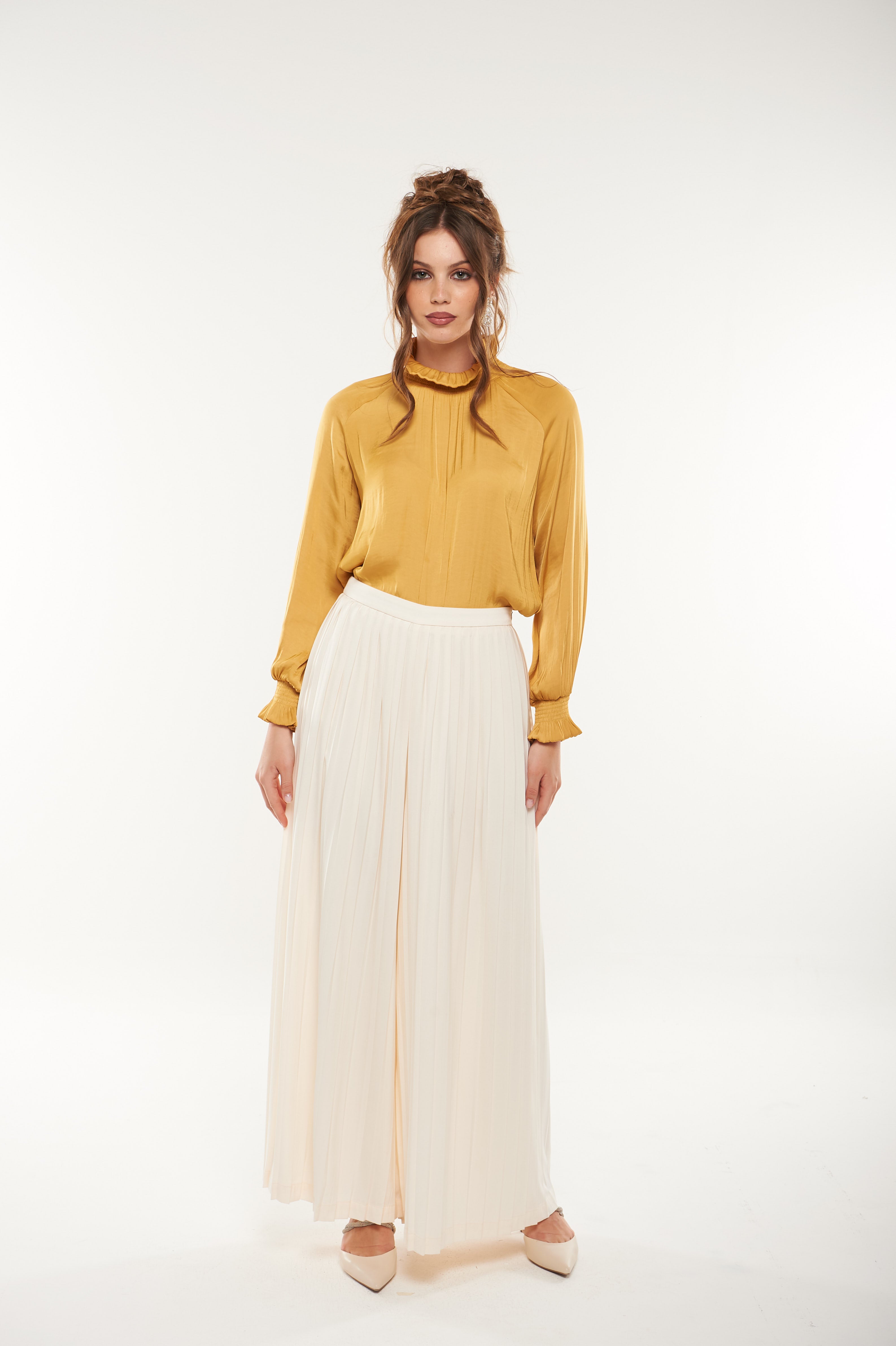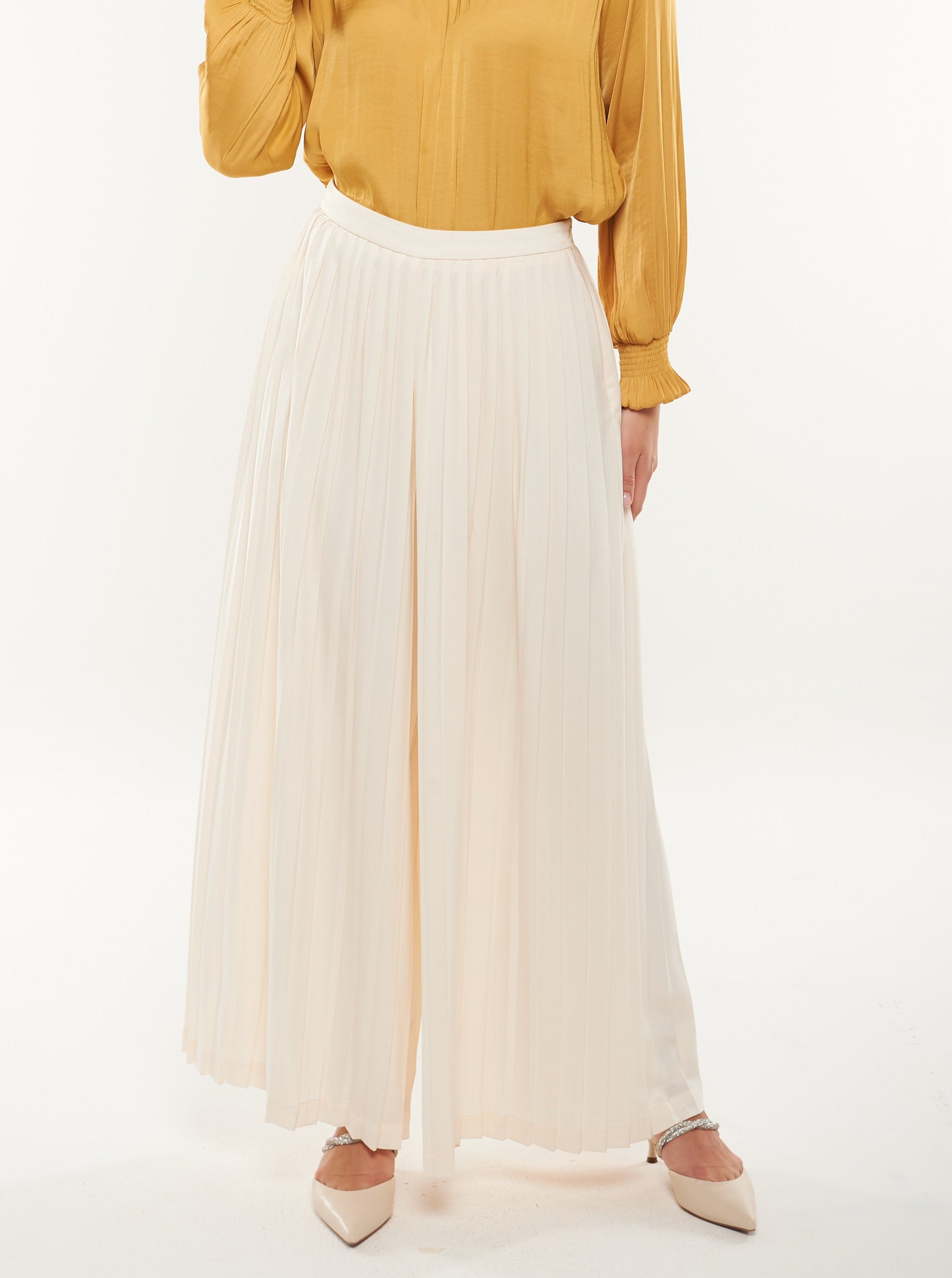 Elevate your wardrobe with these elegant pleated wide-leg pants designed for both comfort and refined style. Featuring a high-rise waist and graceful all-over pleats, this flowing silhouette creates effortless movement with every step. The lightweight chiffon-effect fabric offers a soft drape, making it ideal for both casual and semi-formal settings. Fully lined for added comfort, these pants combine timeless femininity with everyday versatility.