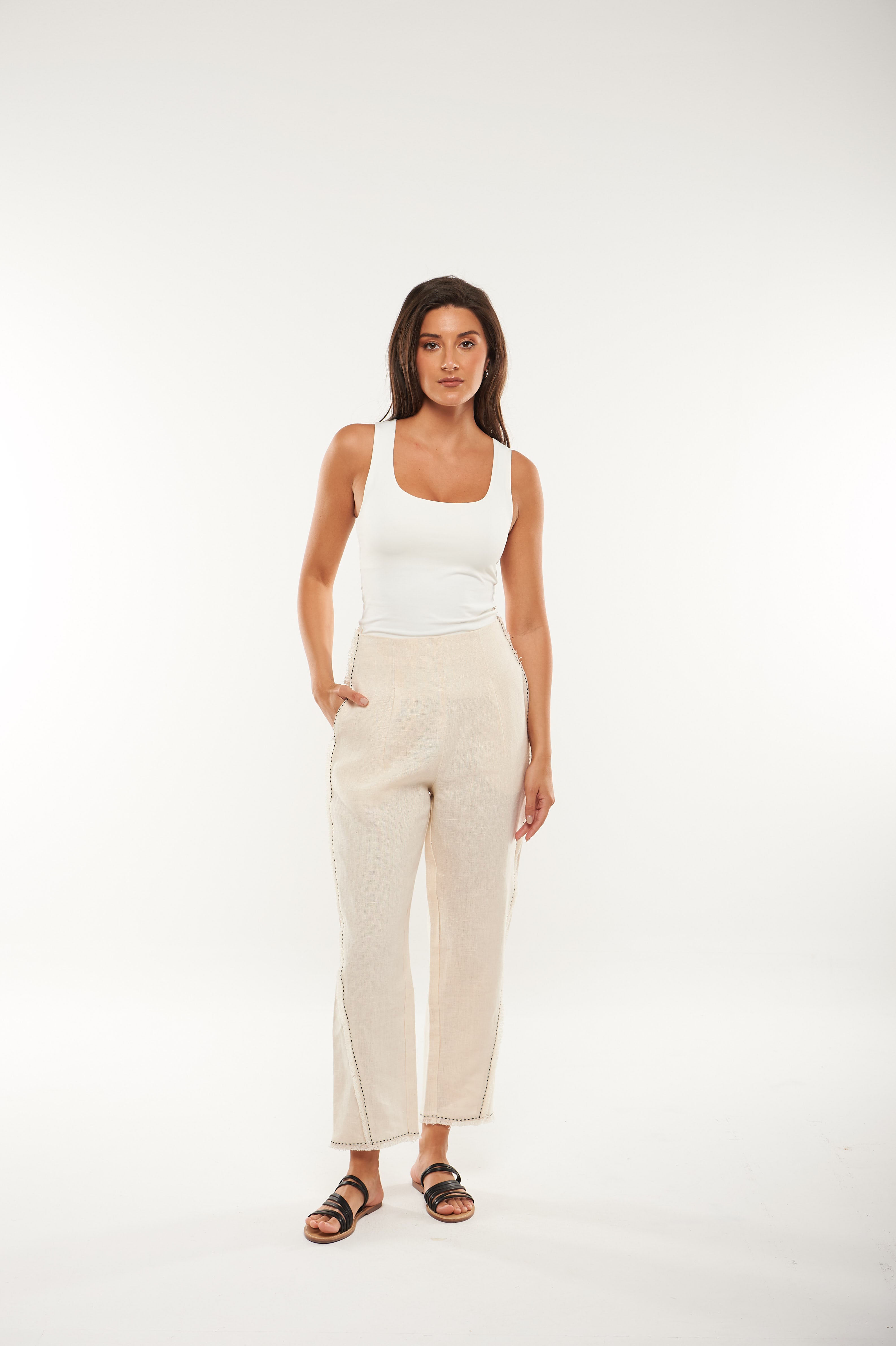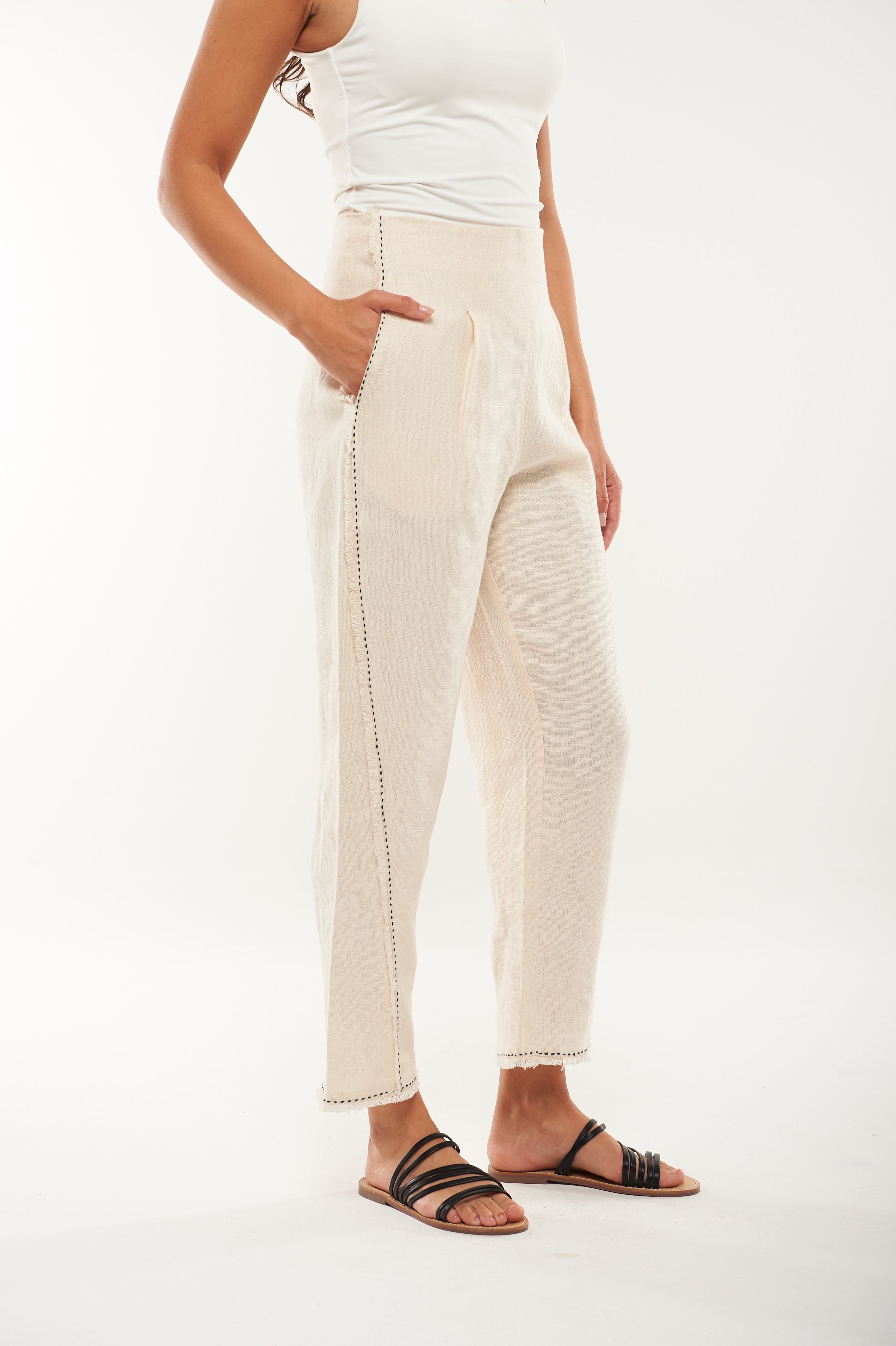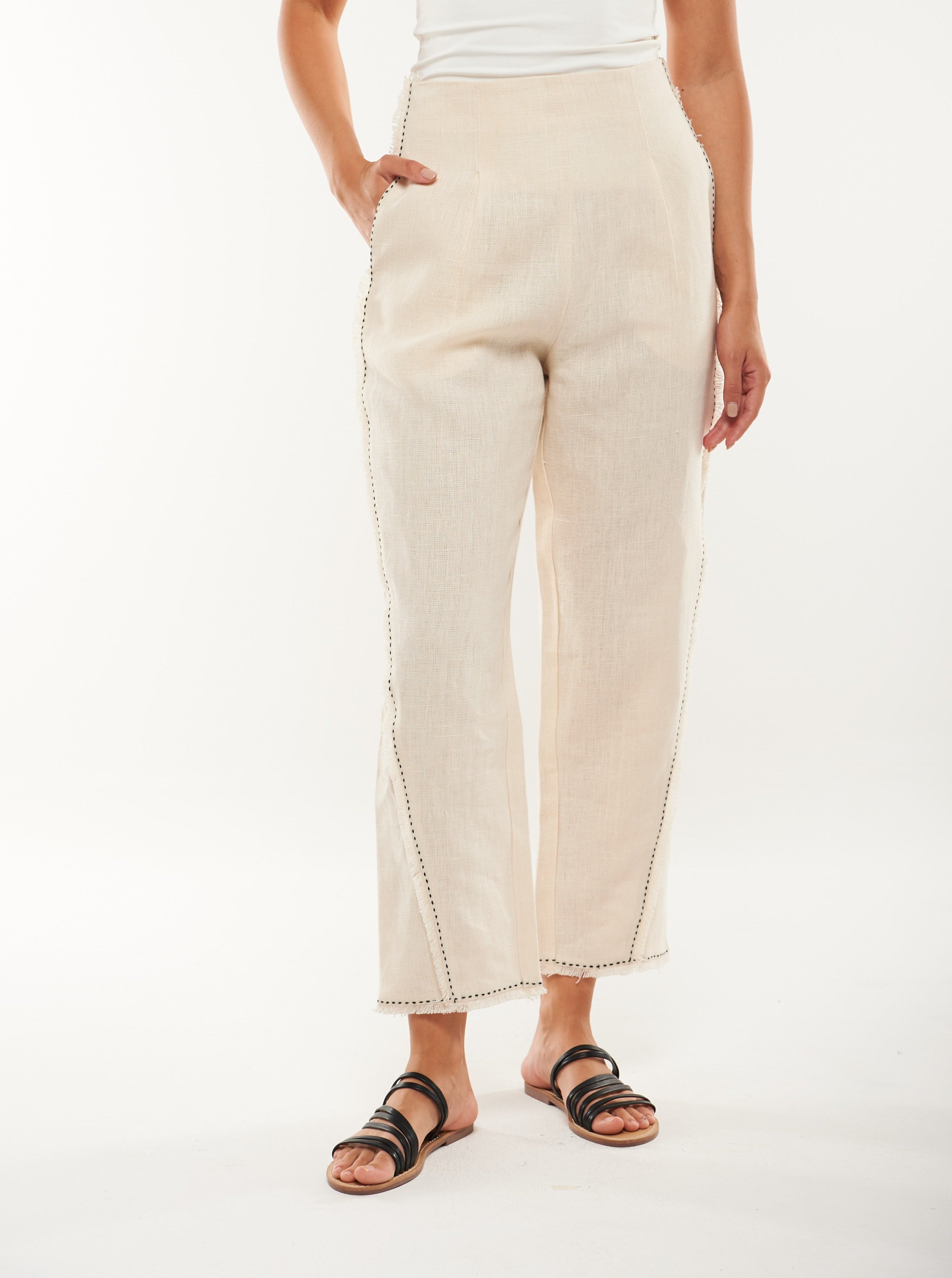 Part of our exclusive Eid & Ramadan collection, these high-waist straight-leg pants are crafted from a breathable linen blend for effortless elegance. Featuring delicate side stitch detailing and subtle frayed edges, they combine comfort with refined style. Designed with side pockets for practicality, they are perfect for both festive gatherings and everyday wear.