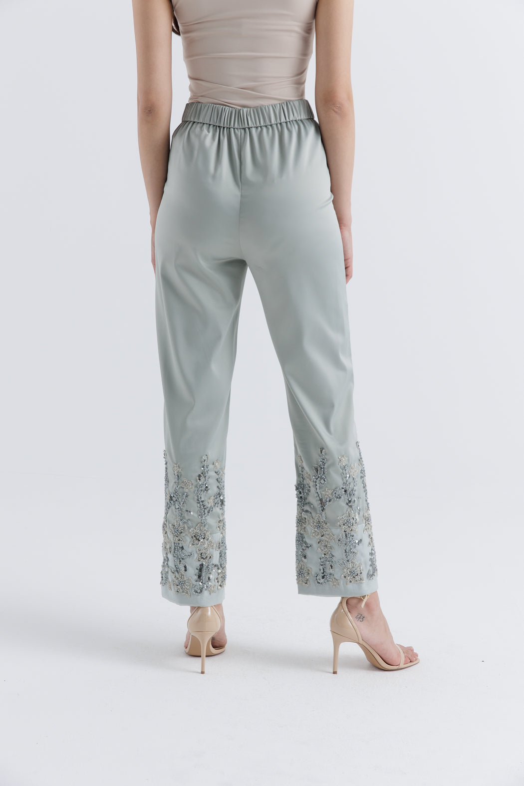 Step into refined luxury with these exquisitely designed tapered pants, perfect for Eid and special occasions. Crafted with premium fabric, the pants feature delicate hand-embellished floral motifs along the hemline, adding a sophisticated sparkle to your look. The sleek, high-waisted silhouette offers both elegance and comfort, making it an ideal choice for modern Arabic fashion.