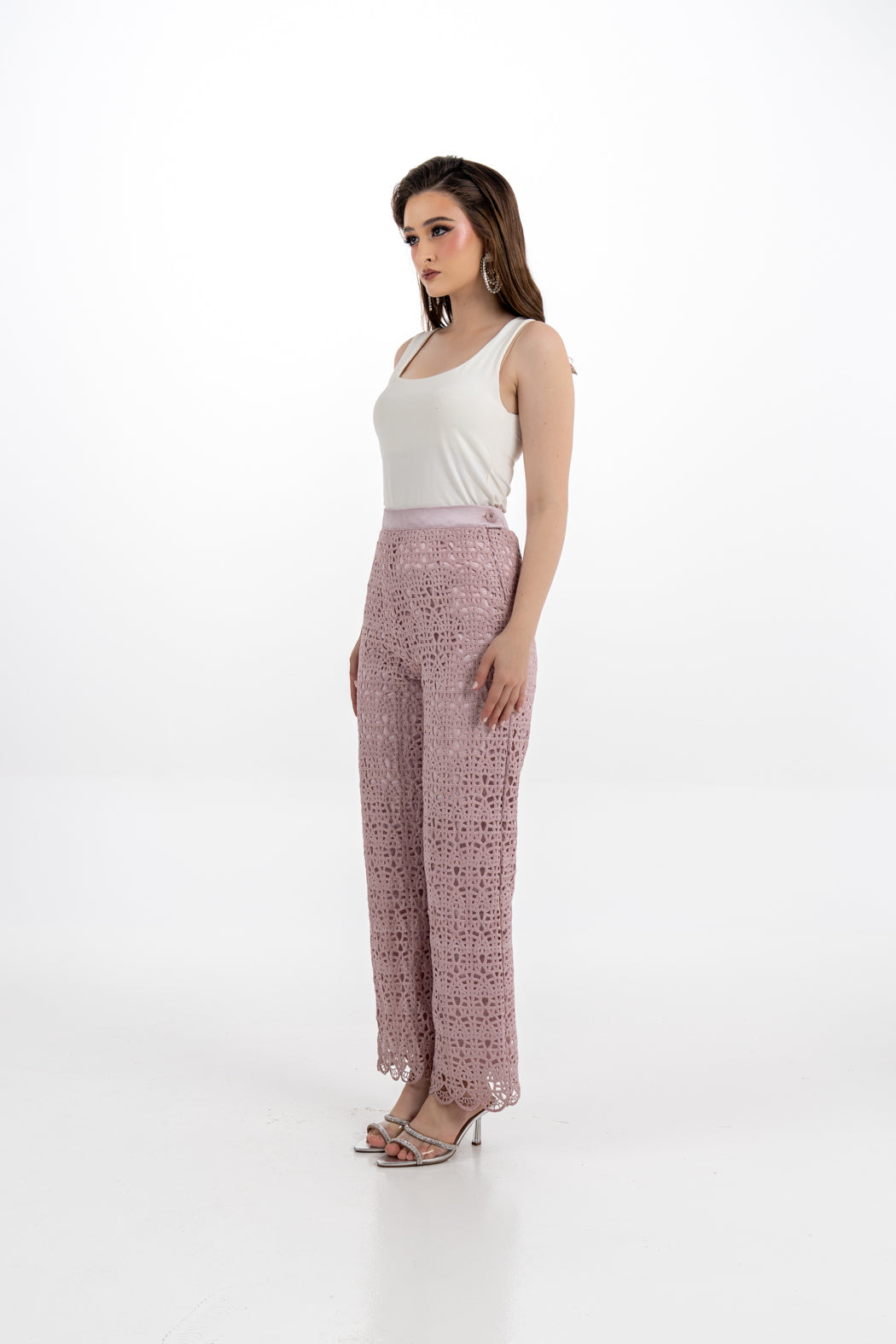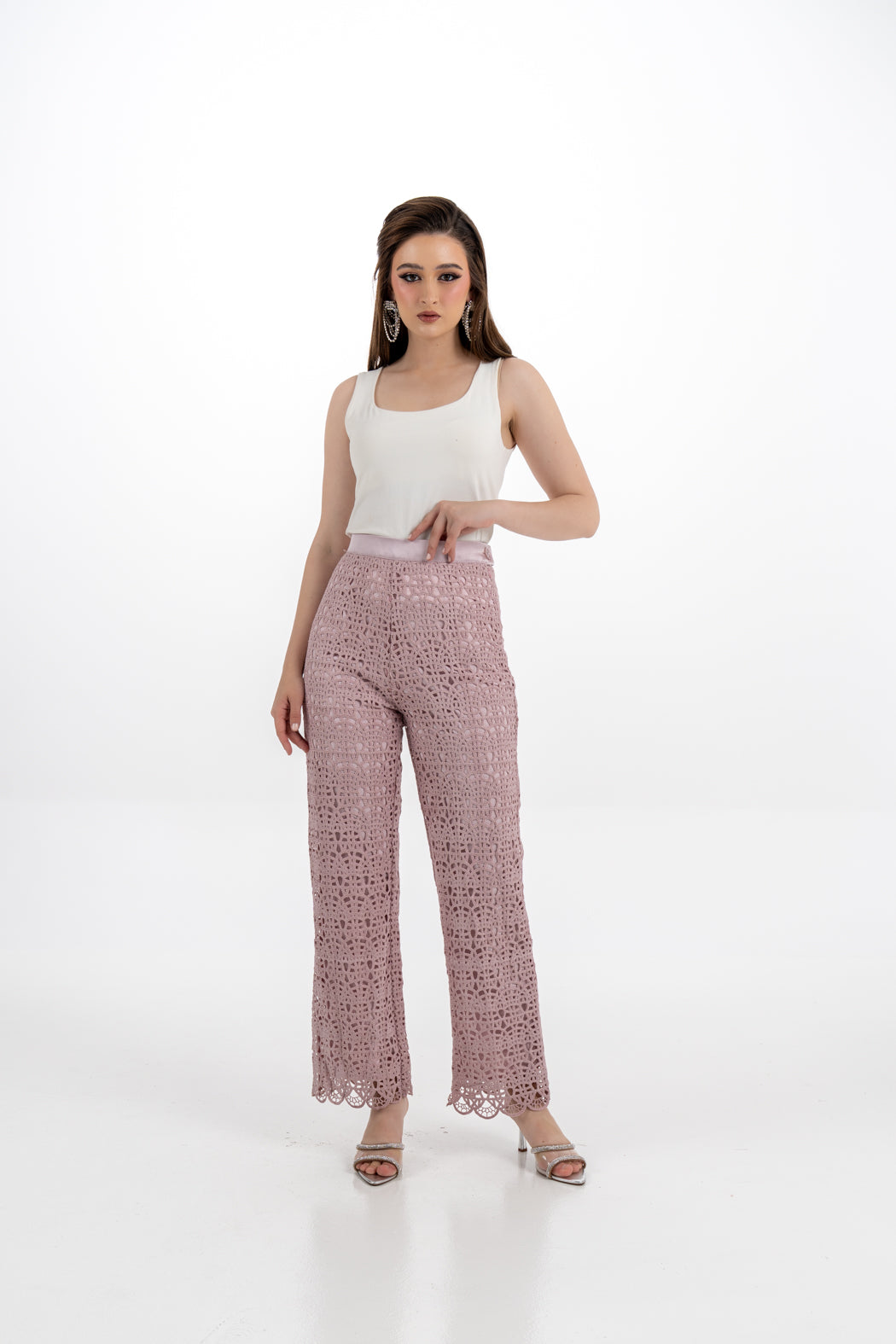 Elevate your wardrobe with these elegant wide-leg pants, featuring an intricate geometric lace overlay for a refined and feminine look. Designed with a high-waisted silhouette and a satin waistband, these pants offer both structure and softness. The fully lined interior ensures comfort and modesty, while the delicate scalloped hem adds a graceful finish. Whether styled for a daytime event or an evening outing, this piece blends charm and sophistication effortlessly.