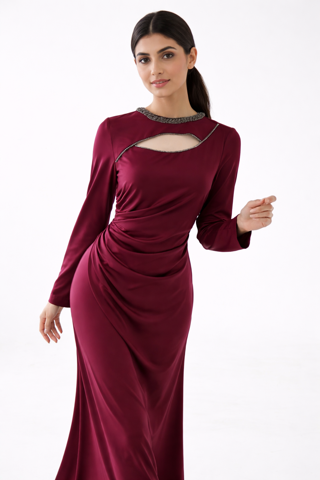 Pair the Amara Embellished Cut-Out Evening Dress with classic heels in nude, metallic, or matching tones. For Ramadan gatherings, style with a soft shawl, and for Eid, complete the look with refined jewelry and a structured clutch.