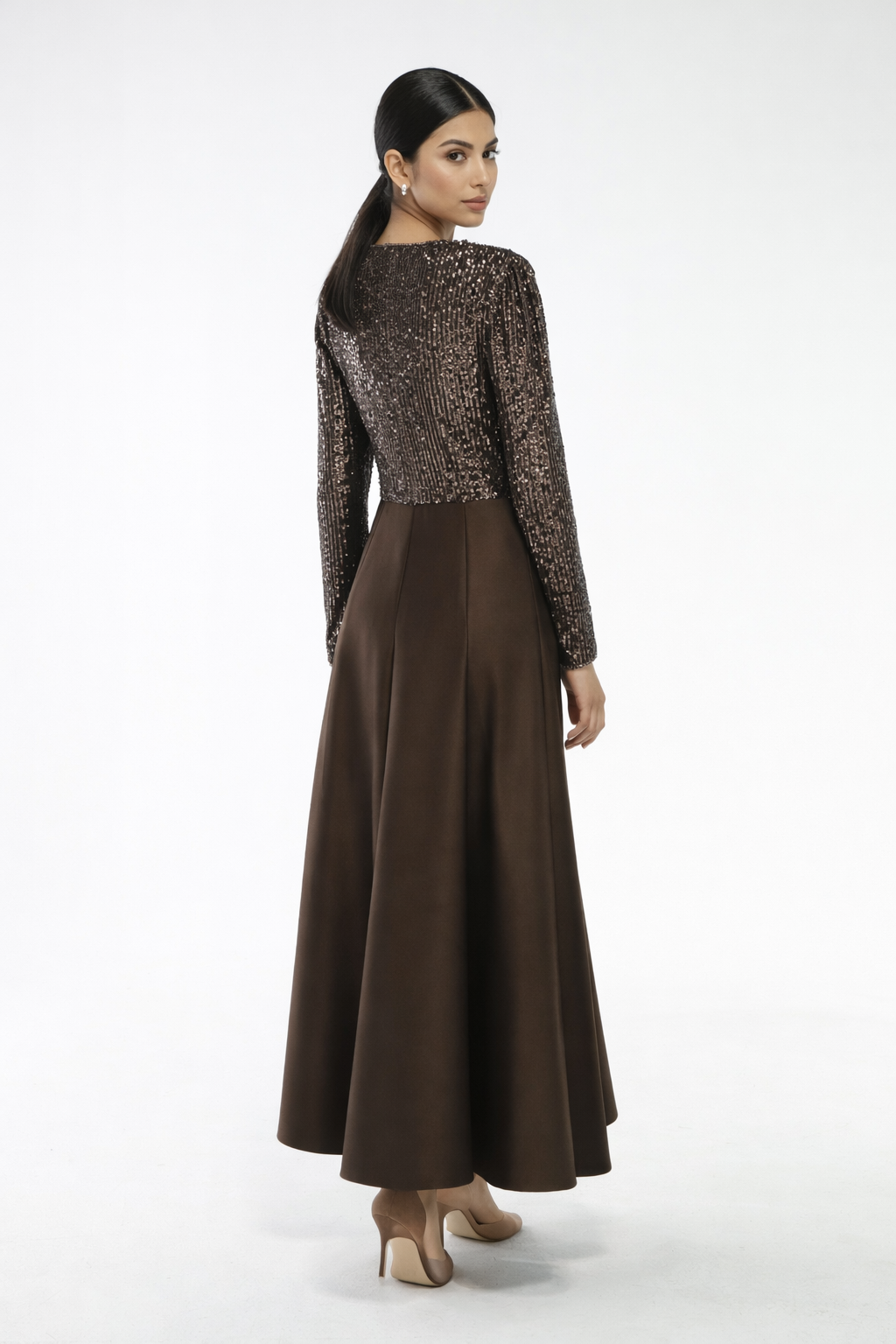 An exquisite fusion of modern glamour and timeless elegance, the Celestia Embellished Evening Dress features a delicately shimmering bodice with fine linear texture and subtle hand-applied embellishments. The wrap-style V-neckline flatters the décolletage, while the structured waist flows seamlessly into a graceful full-length skirt. Long fitted sleeves balance the luminous upper silhouette with refined sophistication. Designed to move effortlessly, the dress offers elegance with every step. With an approximate length of 150 cm, it is ideal for elevated evening and formal occasions.