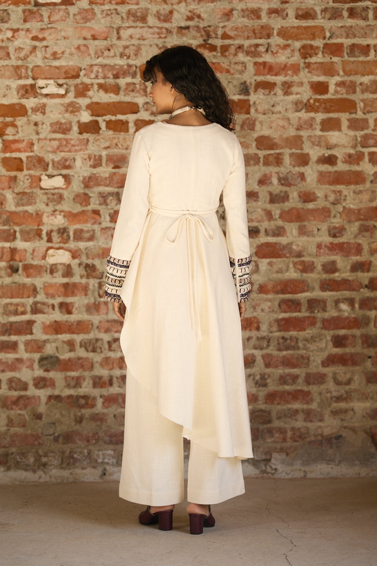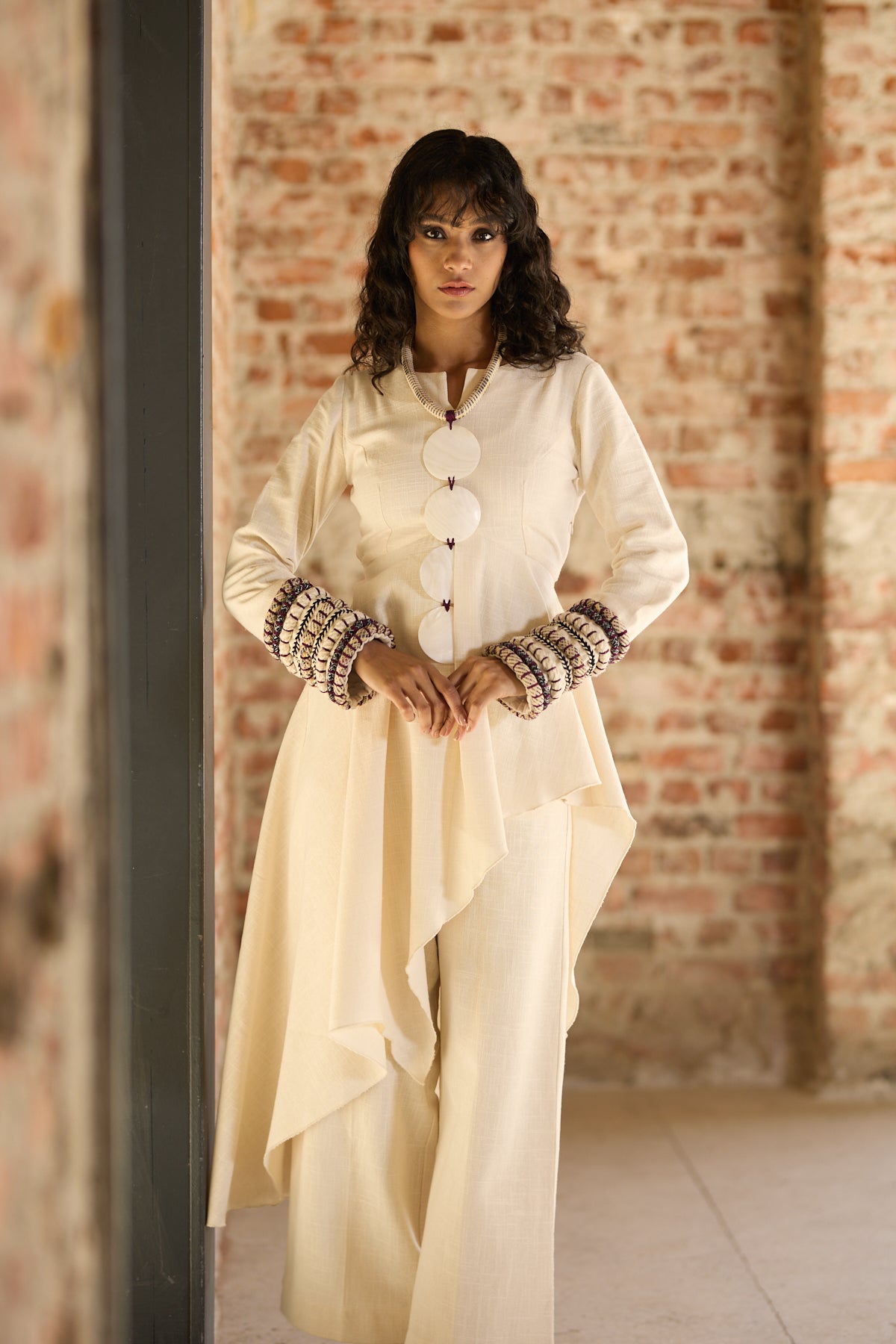 Designed by Abrar Al Mubarak, this exquisite ensemble combines traditional craftsmanship with a modern silhouette. The asymmetrical top features intricate handmade cuffs, showcasing delicate detailing that elevates the design. Paired with flowy wide-leg pants measuring approximately 103cm in length, this set is the epitome of elegance, making it a perfect choice for Ramadan and special gatherings.