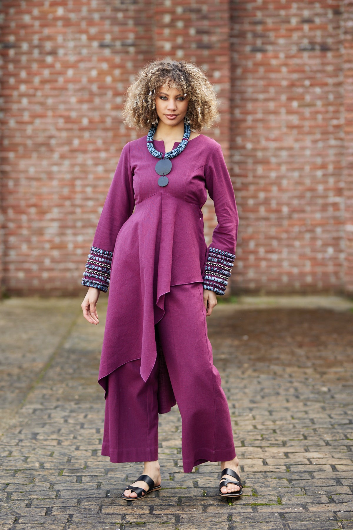 Designed by Abrar Al Mubarak, this exquisite ensemble combines traditional craftsmanship with a modern silhouette. The asymmetrical top features intricate handmade cuffs, showcasing delicate detailing that elevates the design. Paired with flowy wide-leg pants measuring approximately 103cm in length, this set is the epitome of elegance, making it a perfect choice for Ramadan and special gatherings.