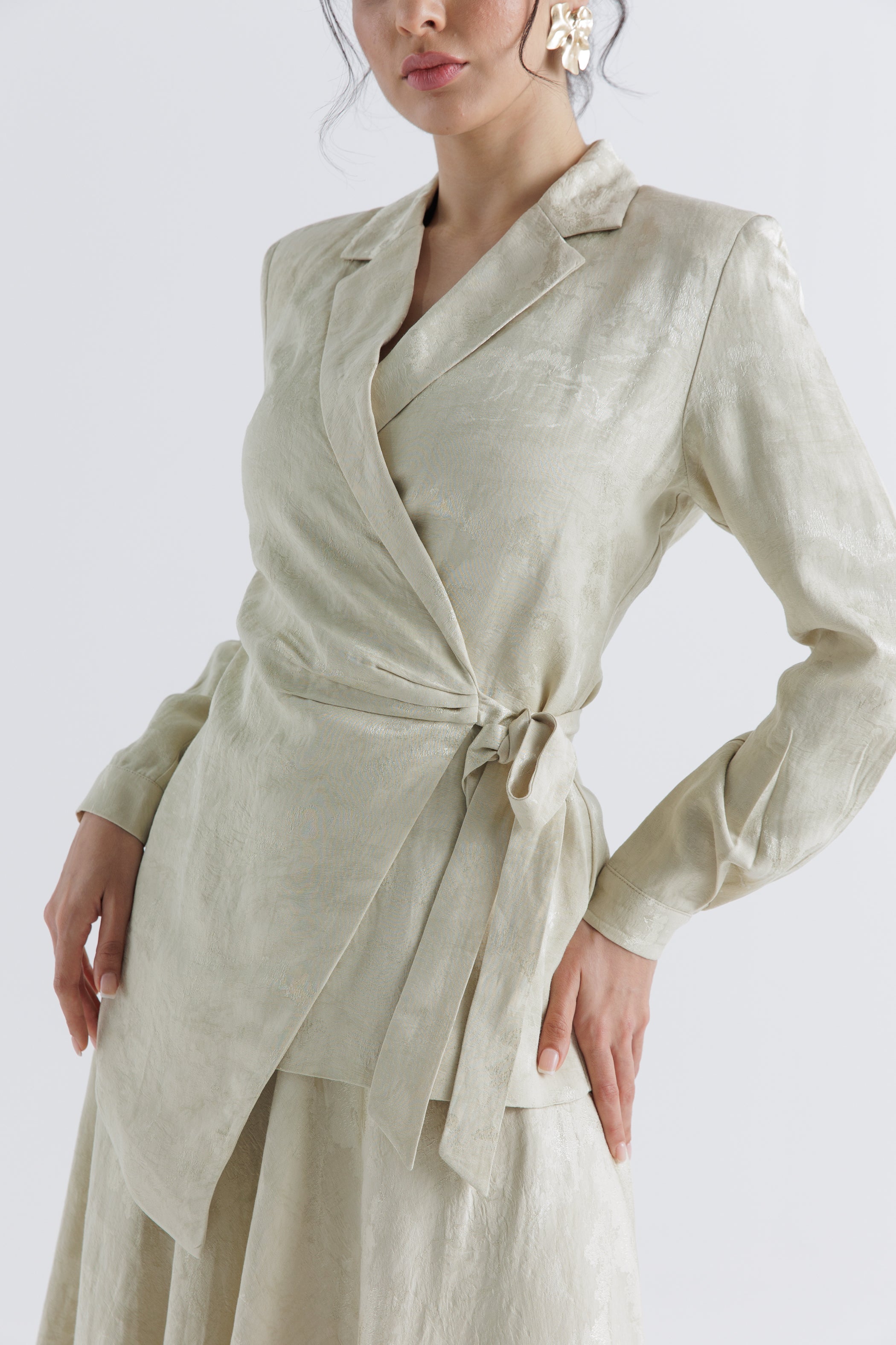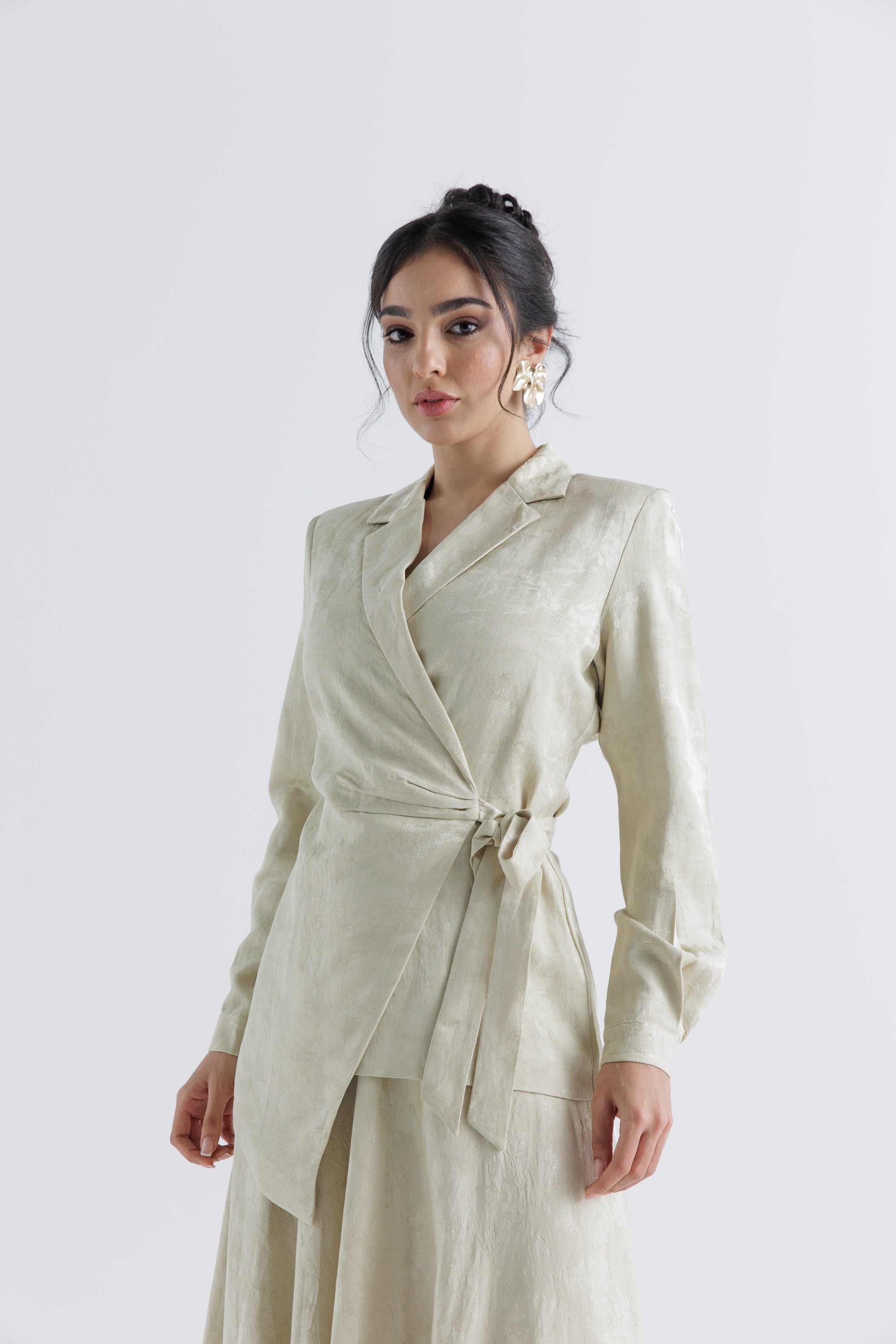 Elevate your festive wardrobe with this elegant asymmetrical jacquard satin wrap jacket, designed to bring sophistication and grace to your Ramadan and Eid celebrations. Crafted from luxurious jacquard satin with a subtle sheen, this jacket offers a structured yet feminine silhouette. The asymmetrical wrap-style front with a side tie closure ensures a flattering and modern fit, while the notched lapel adds a polished finish.