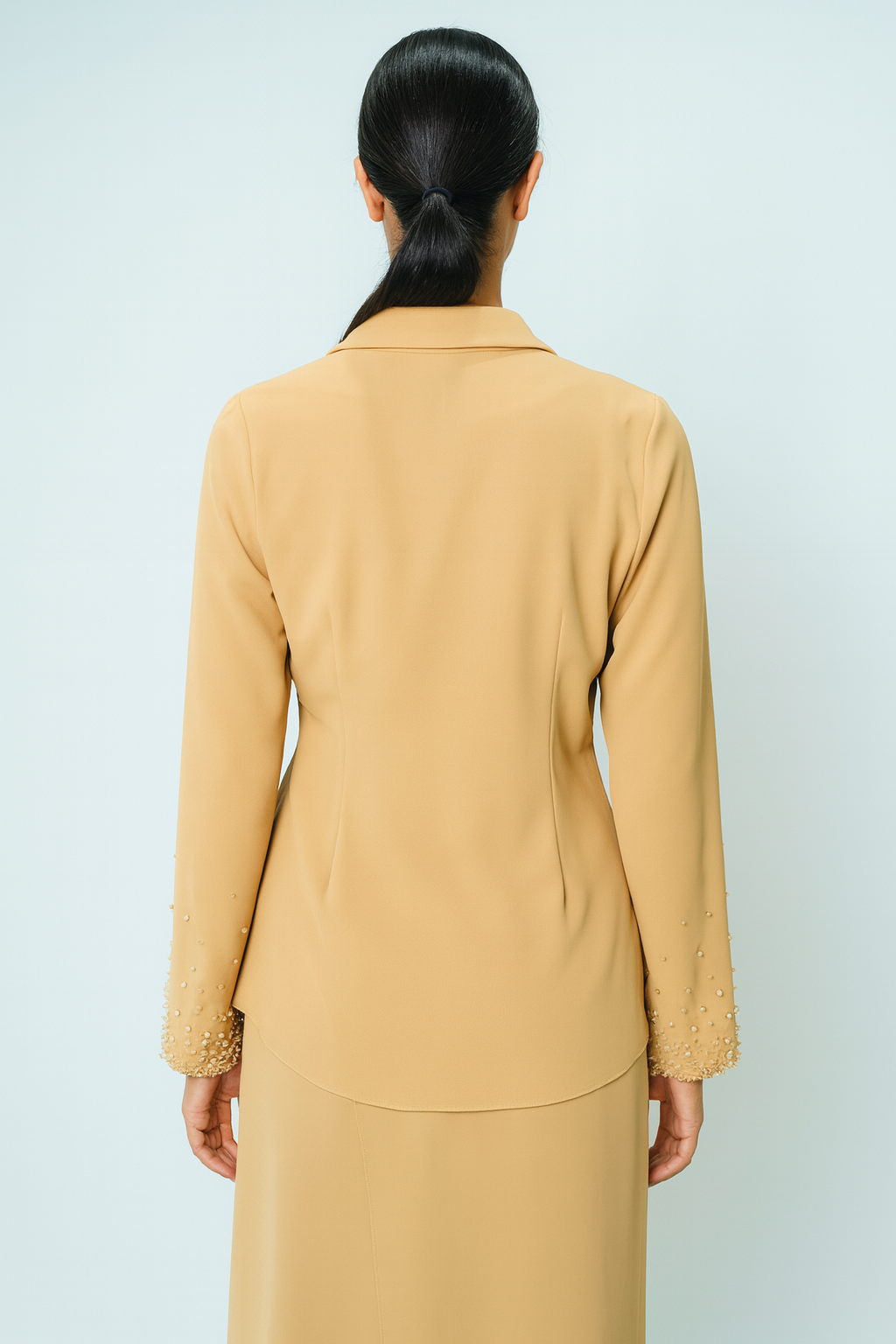 Elevate your wardrobe with this elegant wrap-style collared blouse, designed with a flattering draped front and side gathering for a refined silhouette. It features an asymmetrical hem for a modern touch and long sleeves finished with bead-embellished cuffs, adding subtle sparkle and texture. The classic shirt collar frames the neckline, while the wrap design creates a graceful, feminine shape. With a comfortable 67cm length, it pairs beautifully with skirt style 2501027 for a coordinated look that transitions effortlessly from formal events to refined daywear.