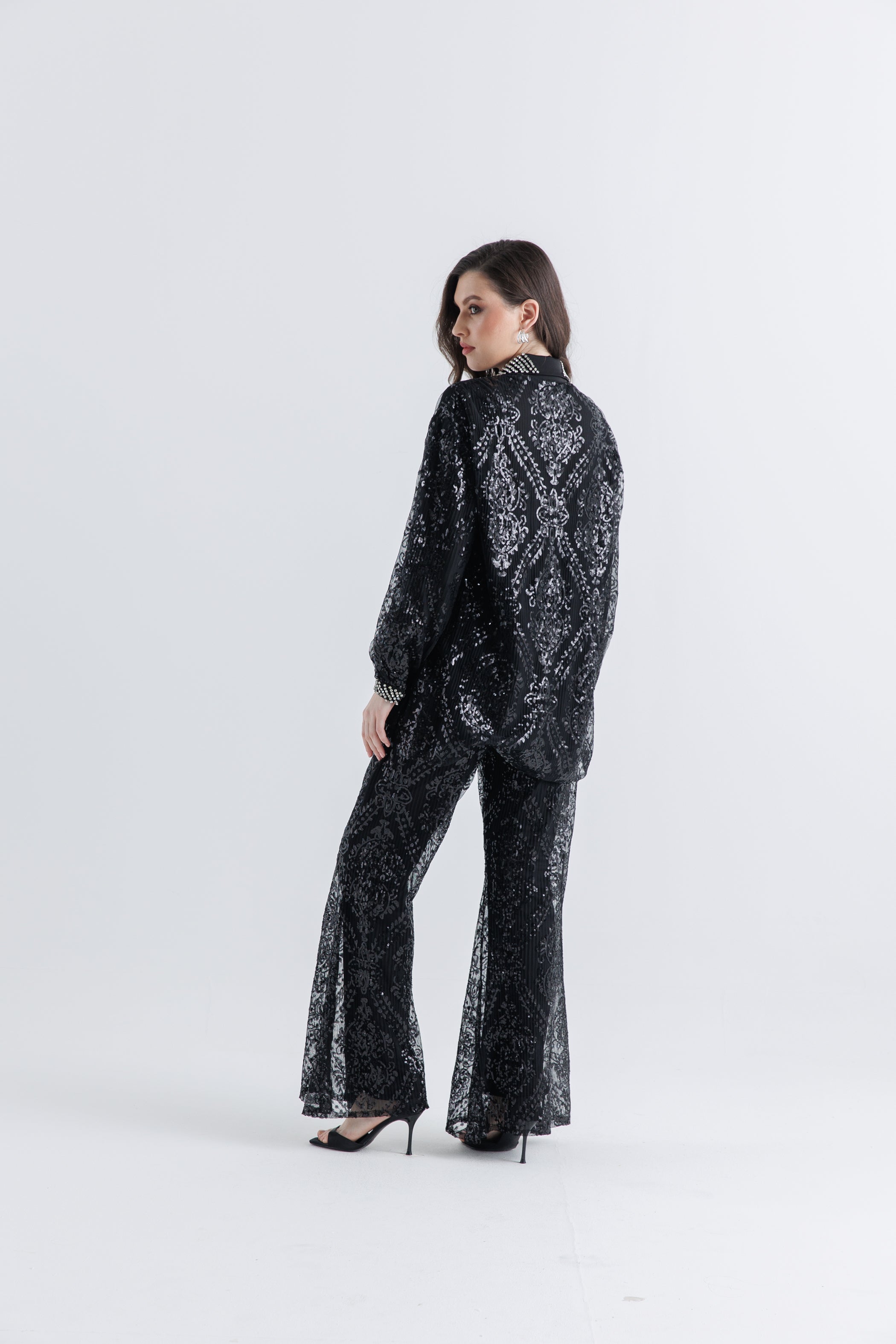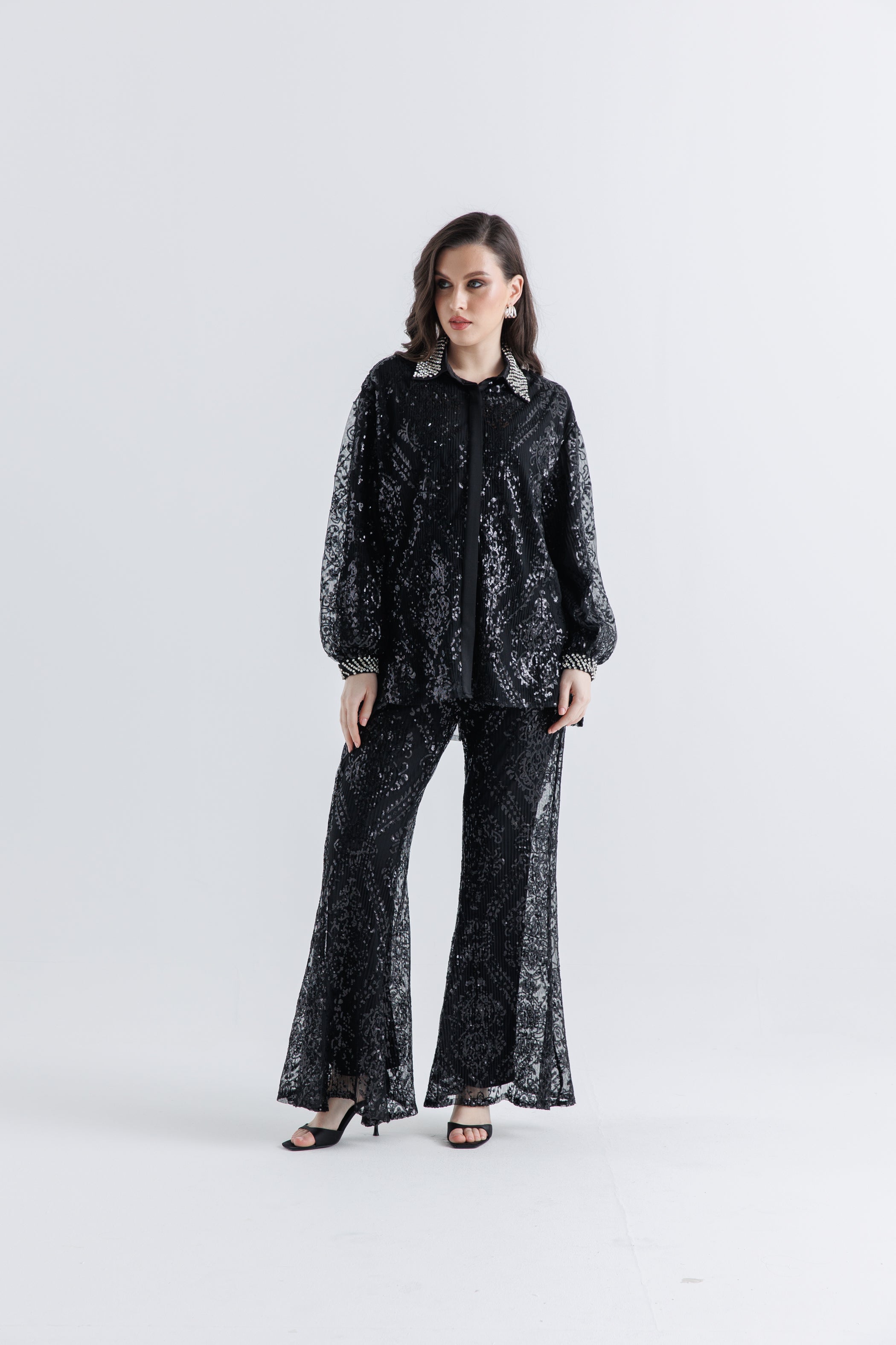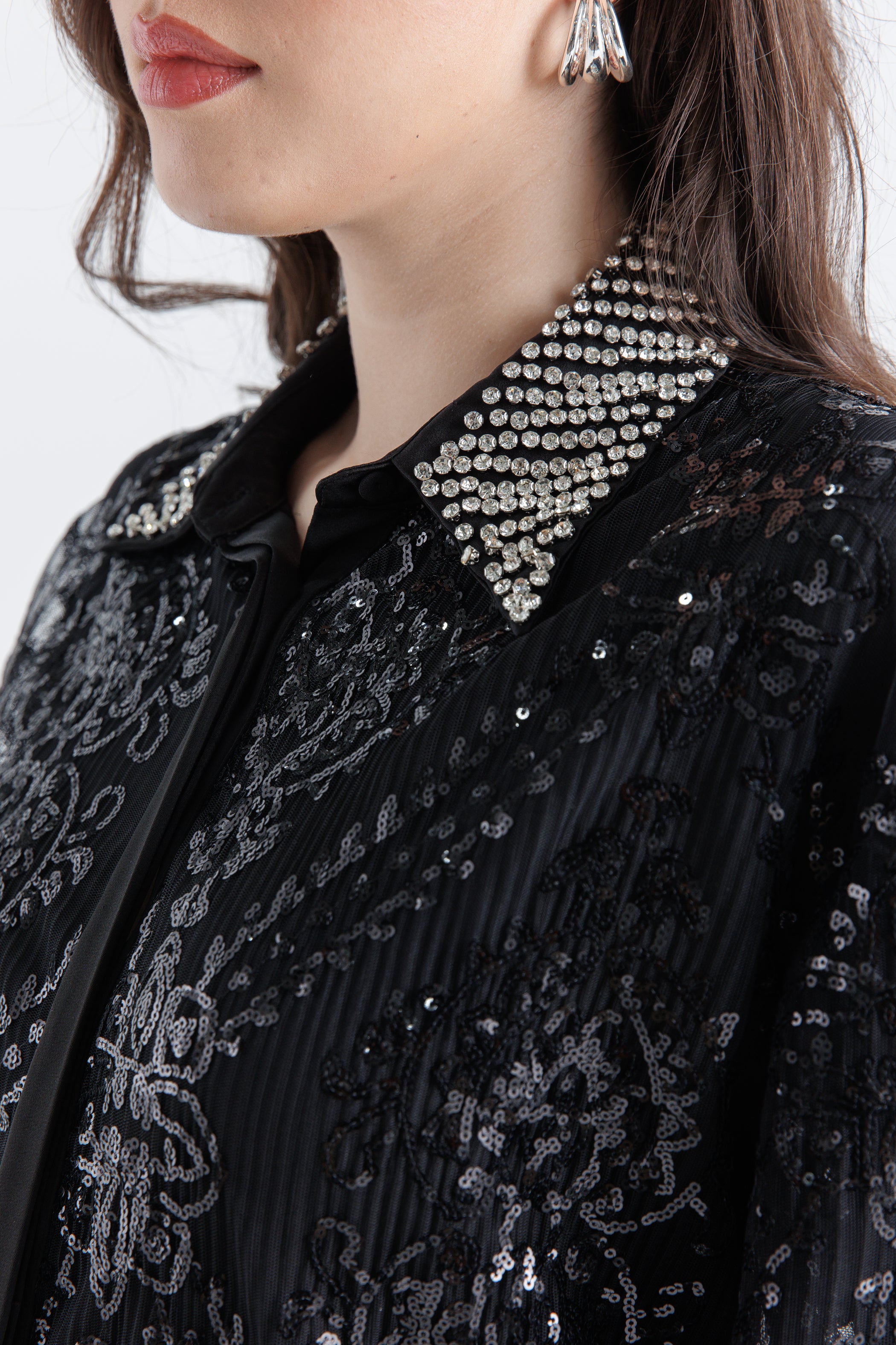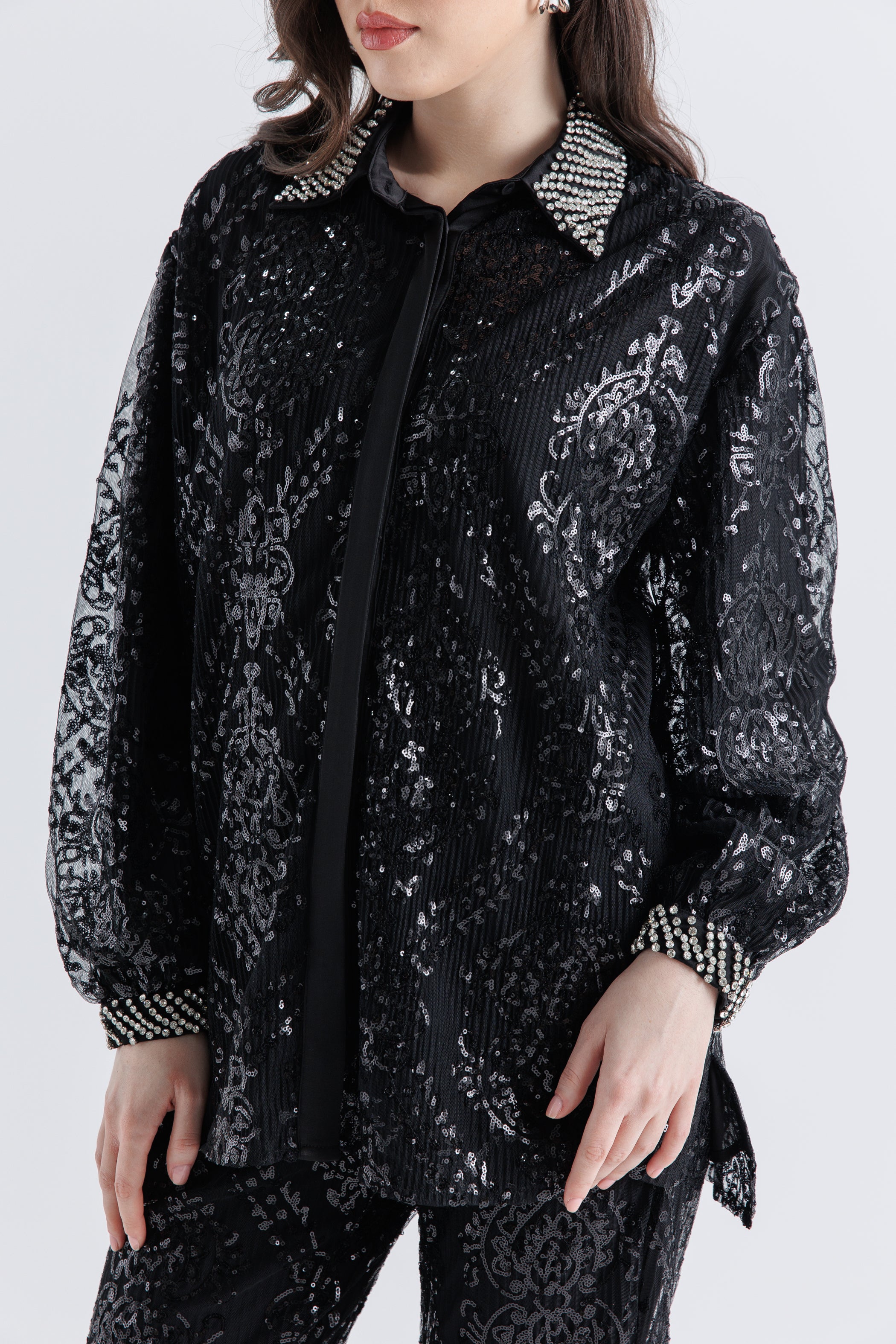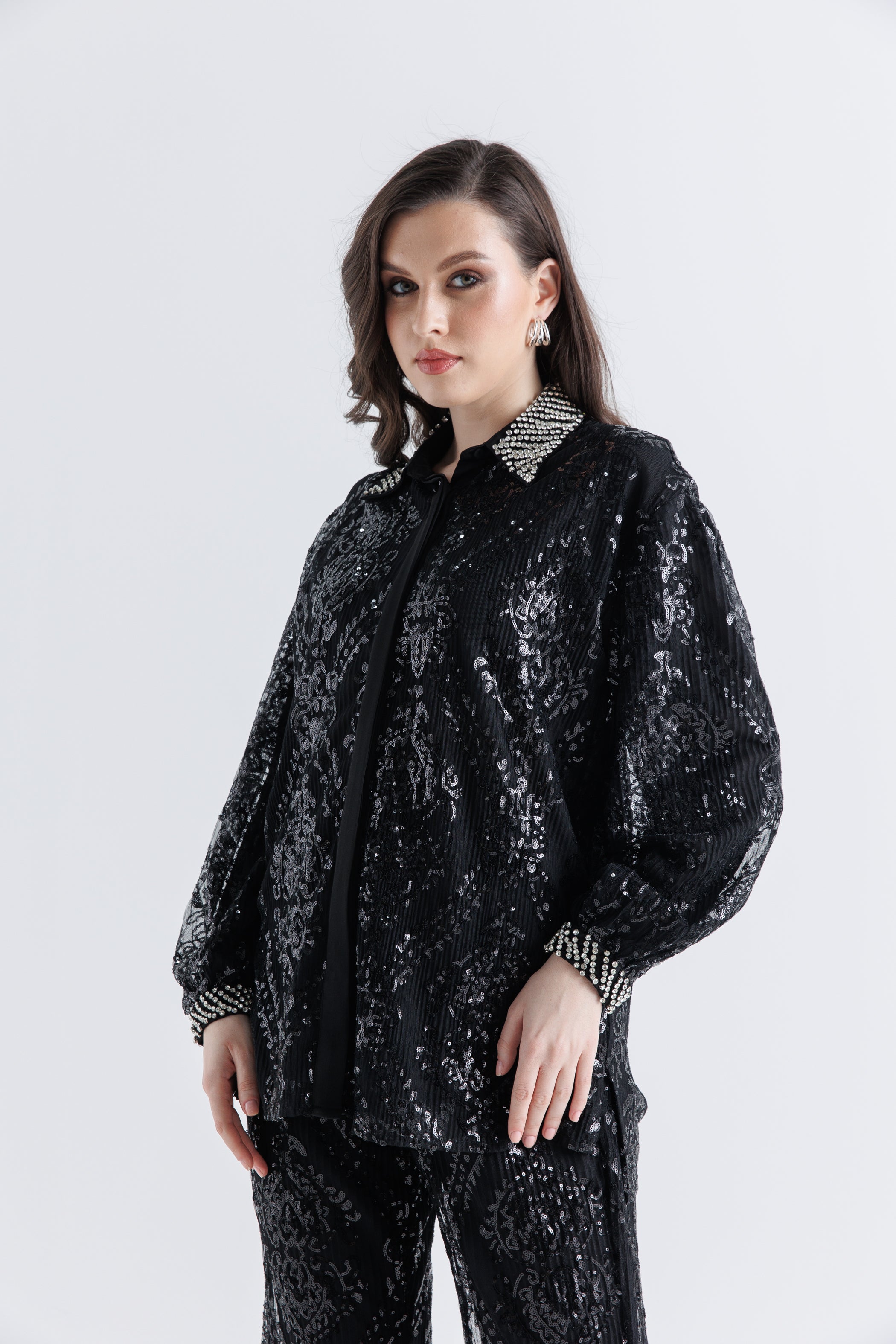 Step into elegant sparkle with this crystal and sequin embellished shirt featuring a soft high-low hem for added flair. Designed with intricate sequin embroidery over a sheer mesh base, the shirt boasts a dazzling crystal-embellished collar that brings effortless glamour. Fully lined through the body for comfort and coverage, it maintains a flowy silhouette with a concealed button placket for a sleek finish. Pair it with our matching pant (Code: 2504013) for a complete statement look.