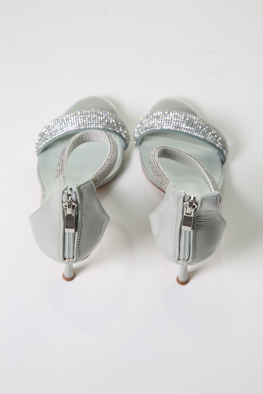 Elevate your style with these sophisticated open-toe heels from Montania. Crafted with a glossy patent finish, these heels feature a sleek stiletto design and a shimmering rhinestone-embellished ankle strap and toe band for a touch of glamour. The secure back zipper ensures easy wear and a snug fit, making them perfect for evening outings, weddings, and formal occasions. Available in soft beige and icy blue tones to complement a wide range of outfits.