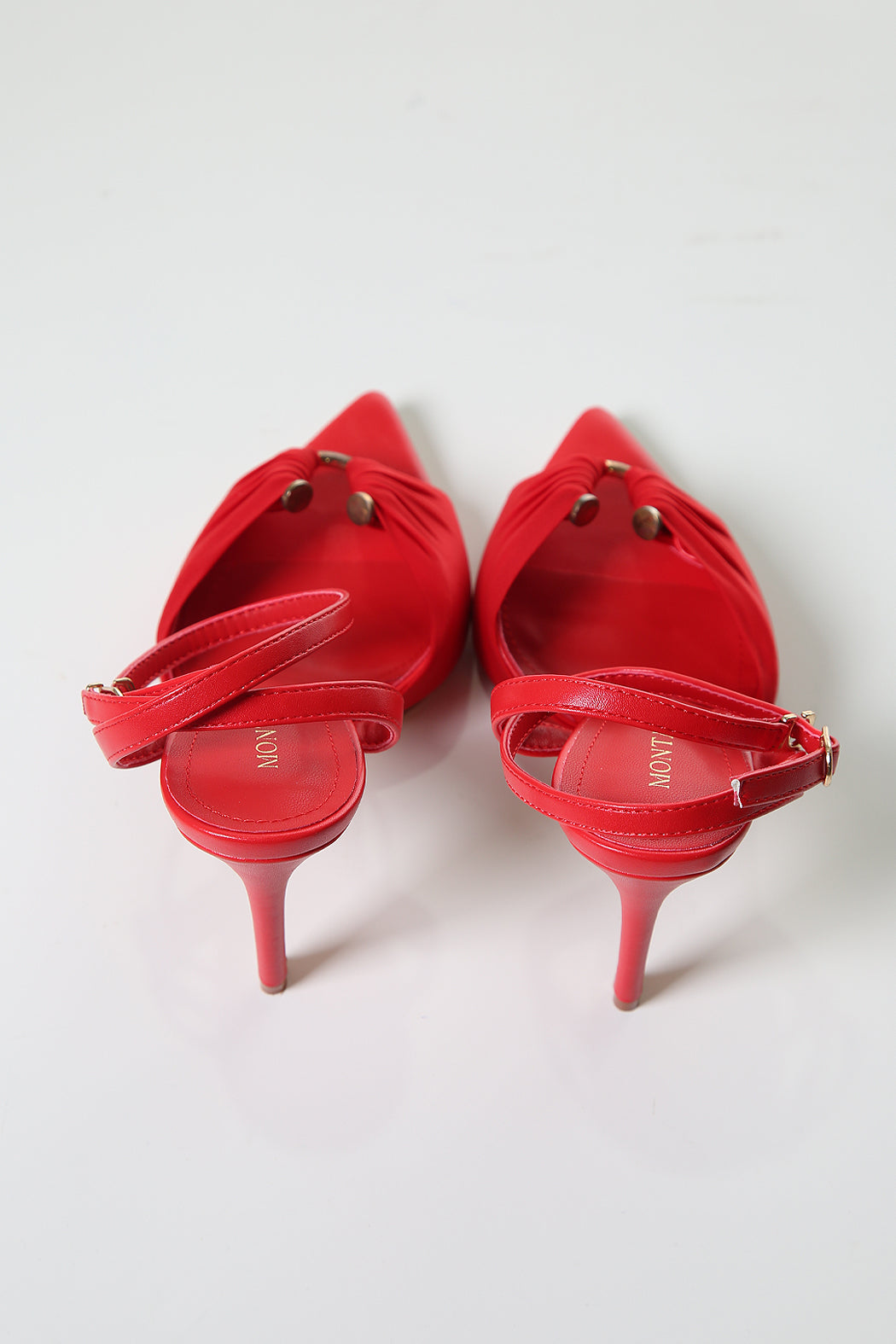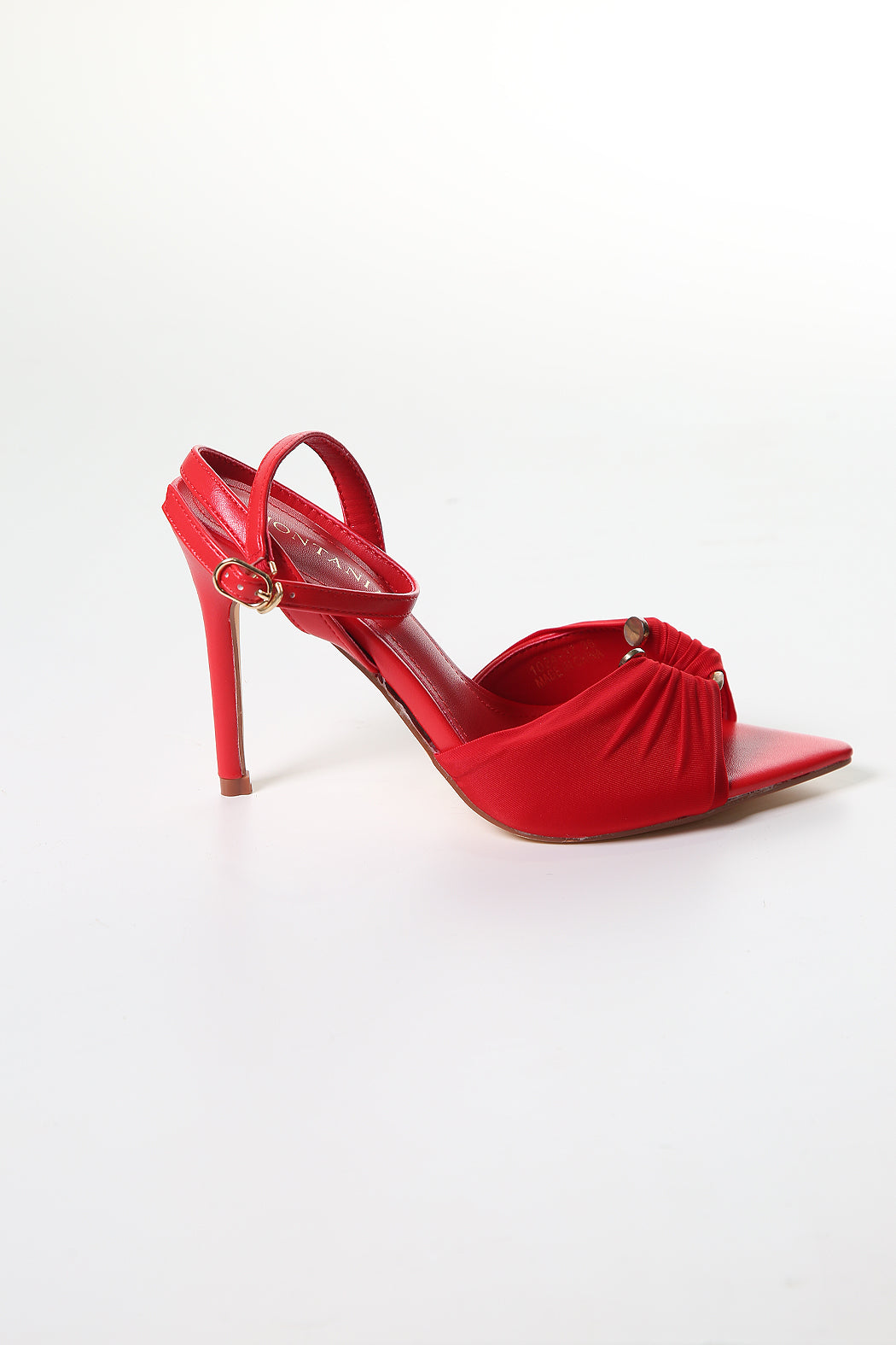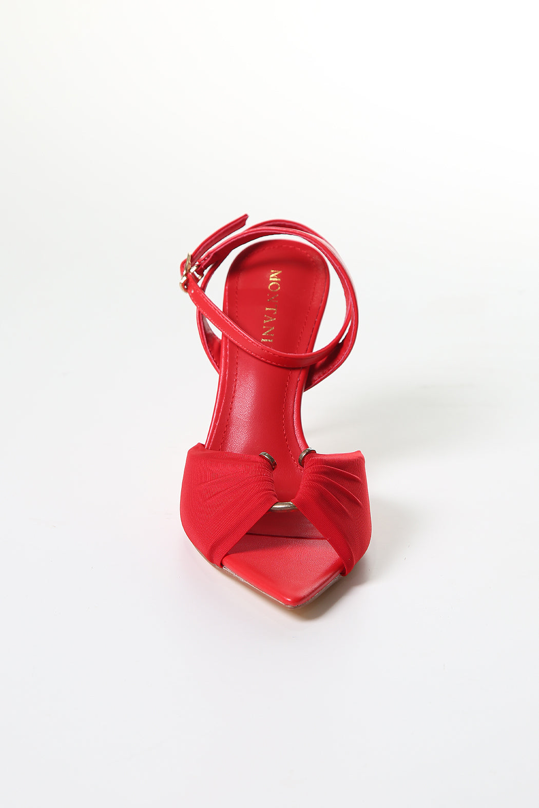 Add a statement touch to your wardrobe with these sophisticated open-toe heels from Montania. Designed with a ruched satin front, gracefully gathered into a polished metal ring, this pair blends elegance with modern flair. The double ankle straps with a gold-tone buckle provide a secure and stylish fit, while the high stiletto heel and square toe enhance your silhouette. Available in classic black, bold red, and soft beige, these heels are perfect for evening events, formal occasions, or stylish nights out.