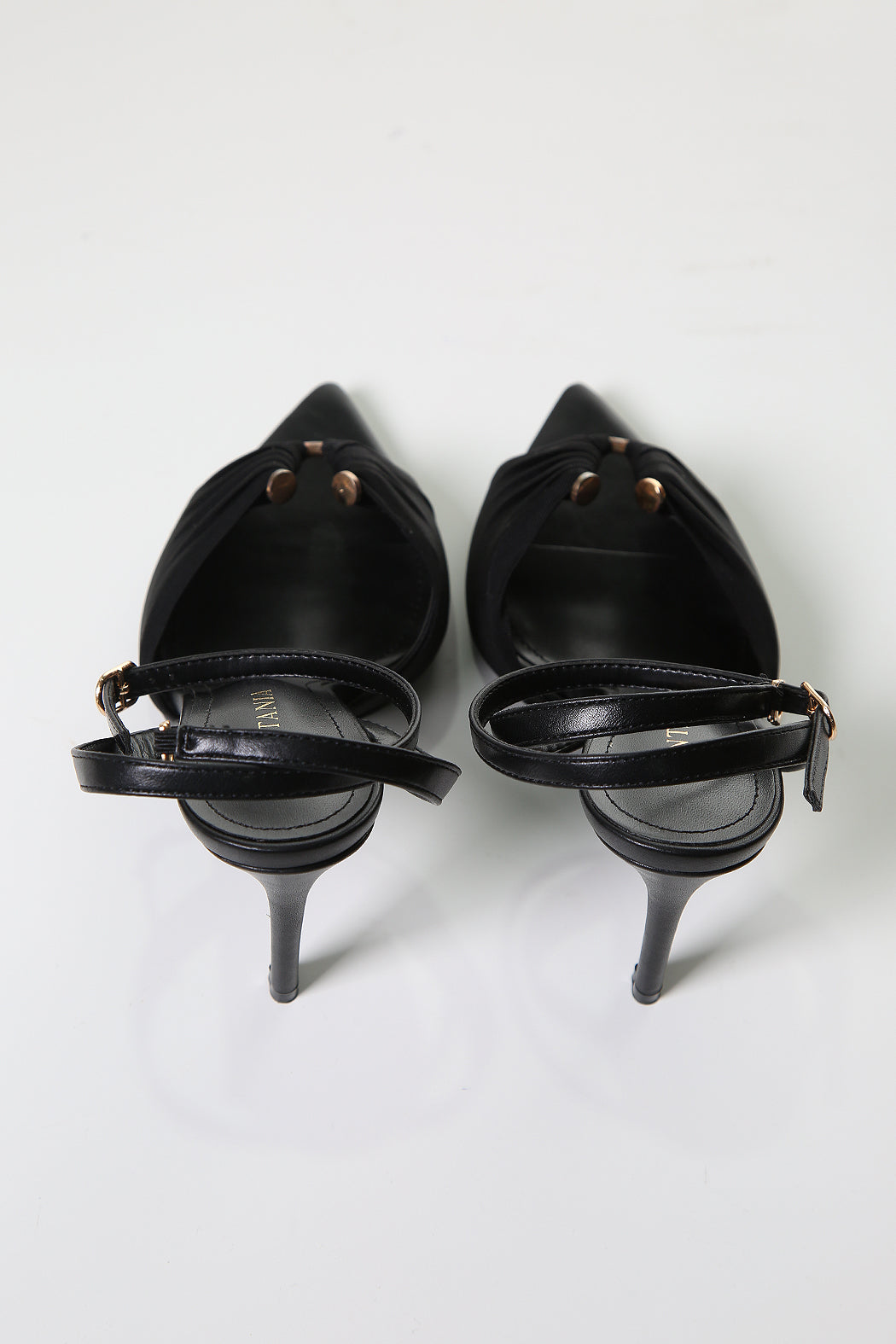 Add a statement touch to your wardrobe with these sophisticated open-toe heels from Montania. Designed with a ruched satin front, gracefully gathered into a polished metal ring, this pair blends elegance with modern flair. The double ankle straps with a gold-tone buckle provide a secure and stylish fit, while the high stiletto heel and square toe enhance your silhouette. Available in classic black, bold red, and soft beige, these heels are perfect for evening events, formal occasions, or stylish nights out.