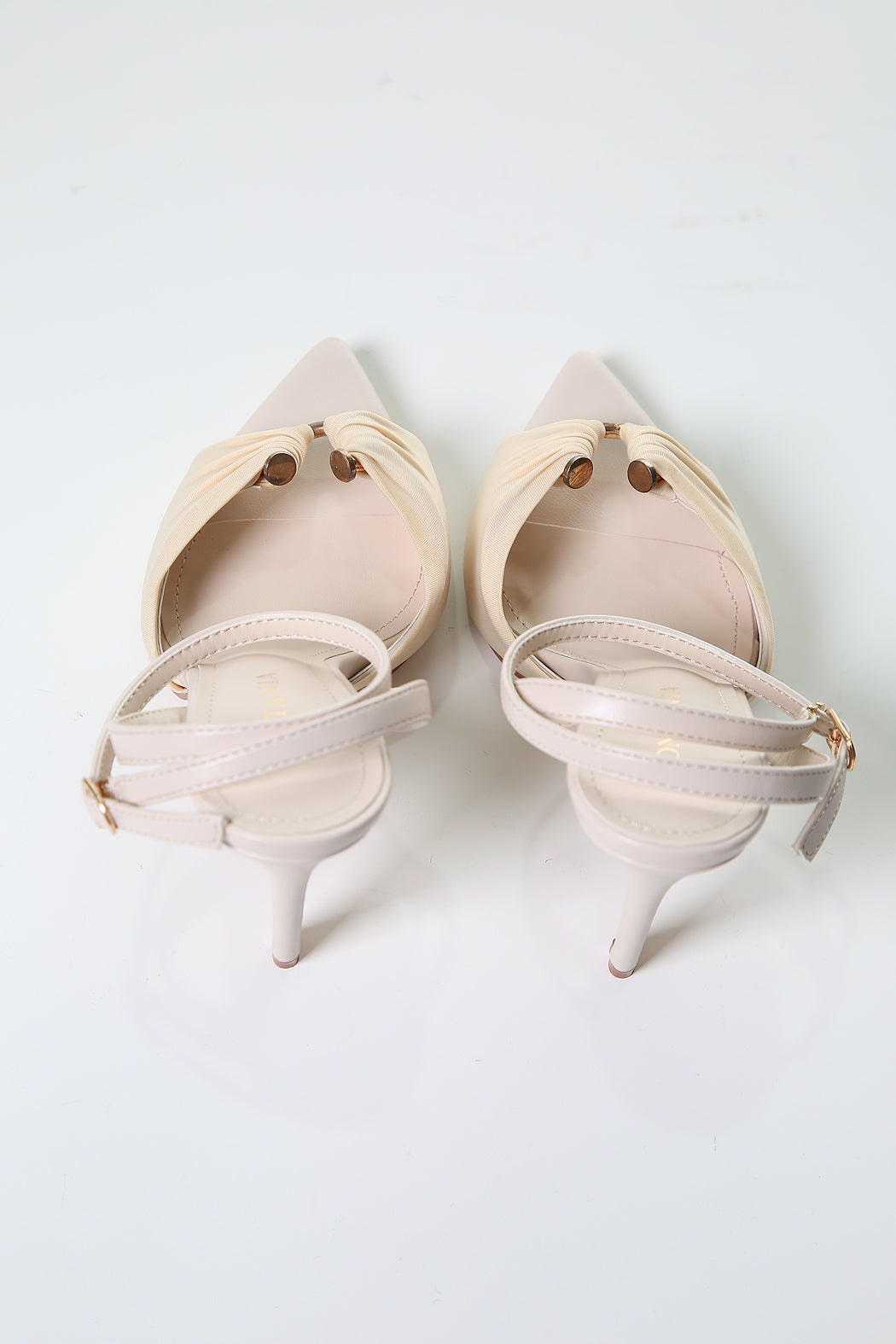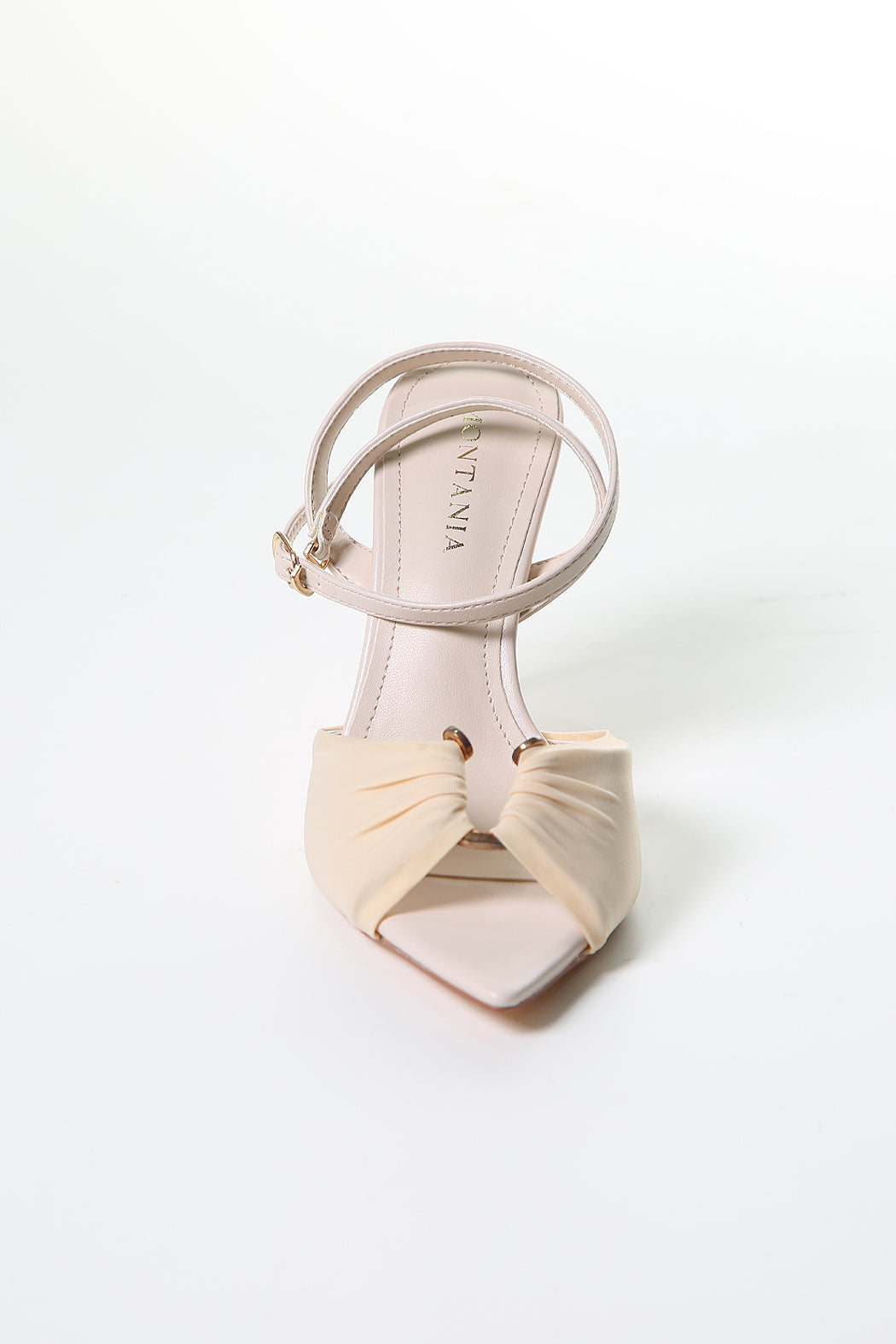 Add a statement touch to your wardrobe with these sophisticated open-toe heels from Montania. Designed with a ruched satin front, gracefully gathered into a polished metal ring, this pair blends elegance with modern flair. The double ankle straps with a gold-tone buckle provide a secure and stylish fit, while the high stiletto heel and square toe enhance your silhouette. Available in classic black, bold red, and soft beige, these heels are perfect for evening events, formal occasions, or stylish nights out.