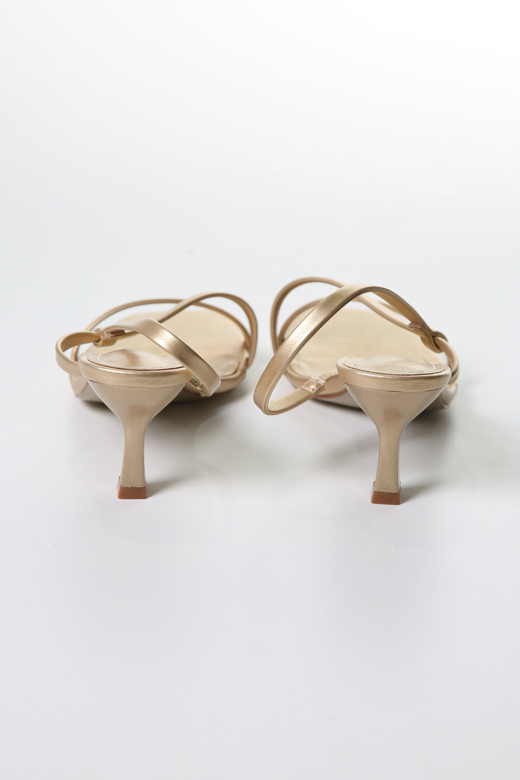 Step into subtle sophistication with these metallic gold strap sandals from Montania. Designed with a clean minimalist aesthetic, this pair features slim asymmetrical straps and a modern square toe, creating a sleek, contemporary silhouette. The mid-height flared heel offers just the right lift for day-to-night wear, making them a versatile choice for events, outings, or casual elegance. The soft metallic finish adds a touch of glam while remaining refined and wearable.